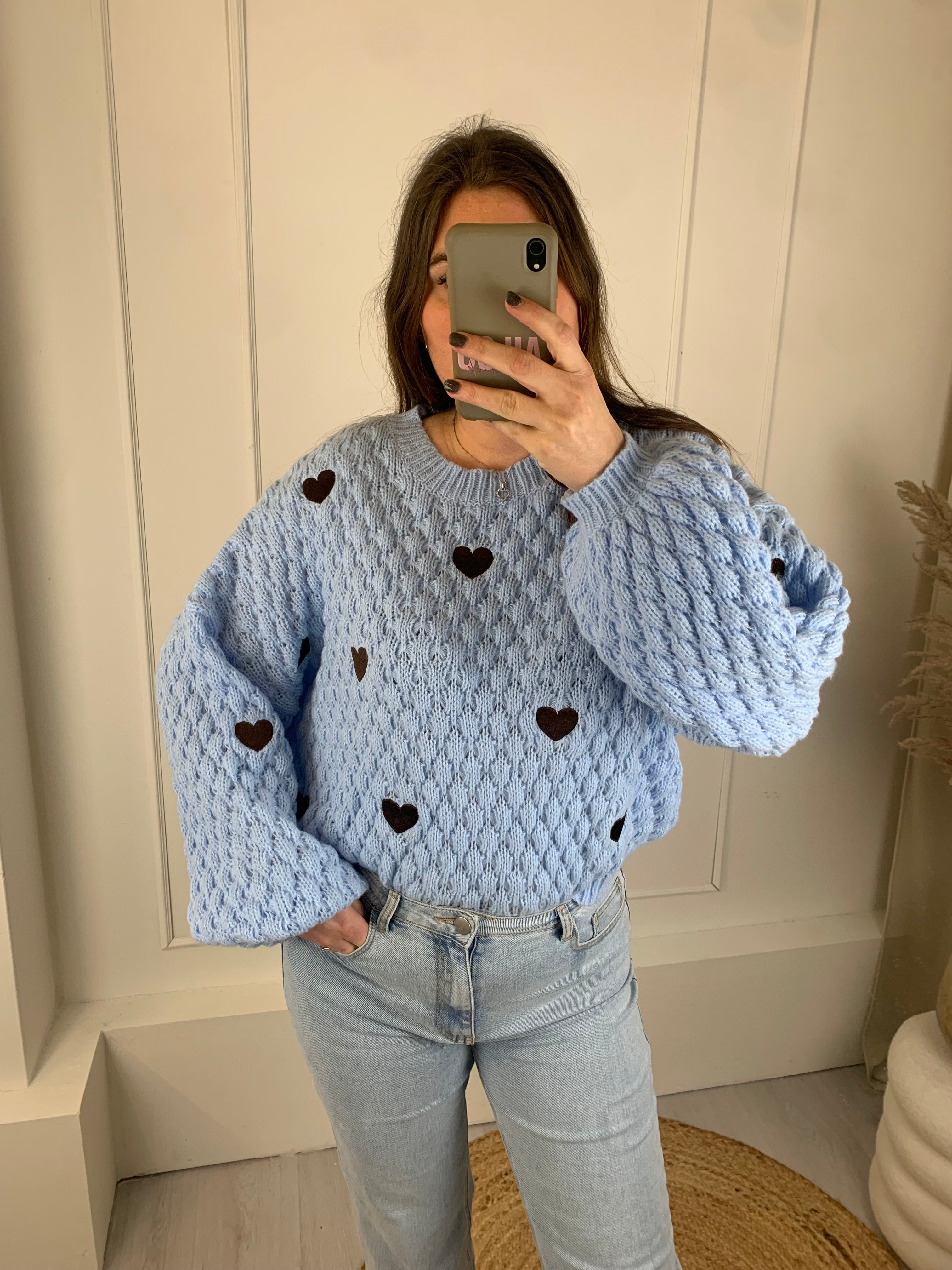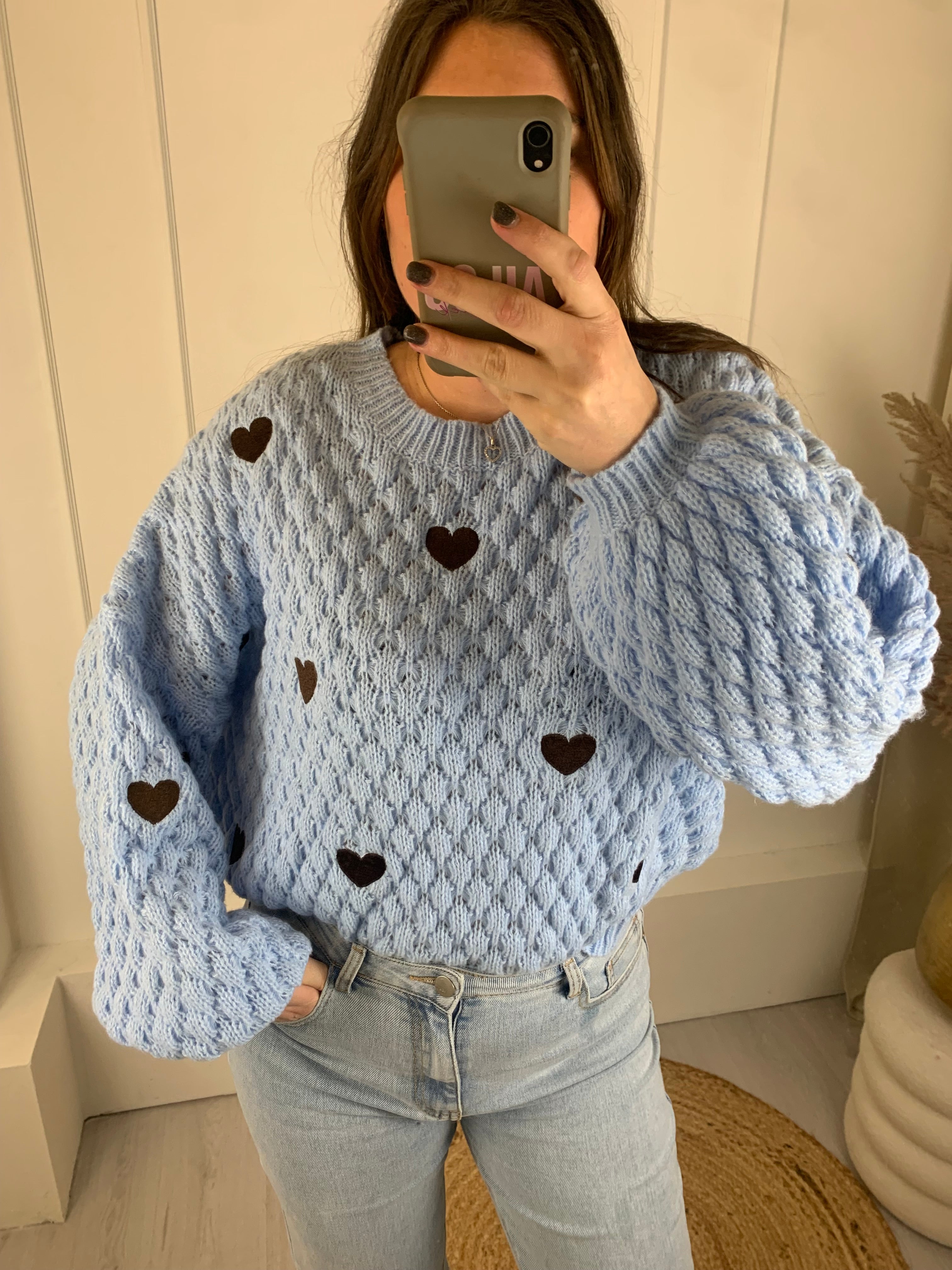 Mooie trui met een ajourprint en geborduurde hartje op voorpand en mouwen.