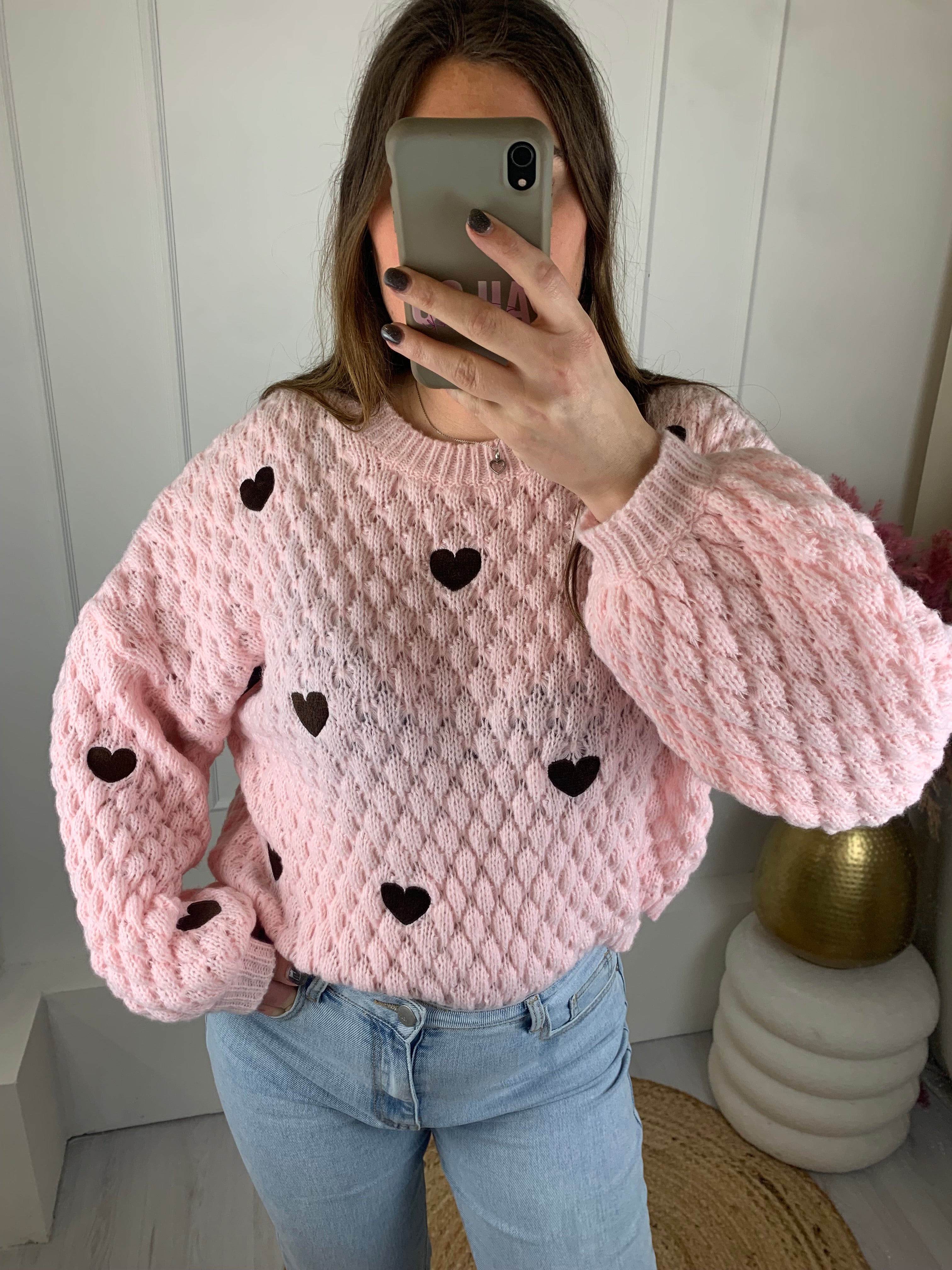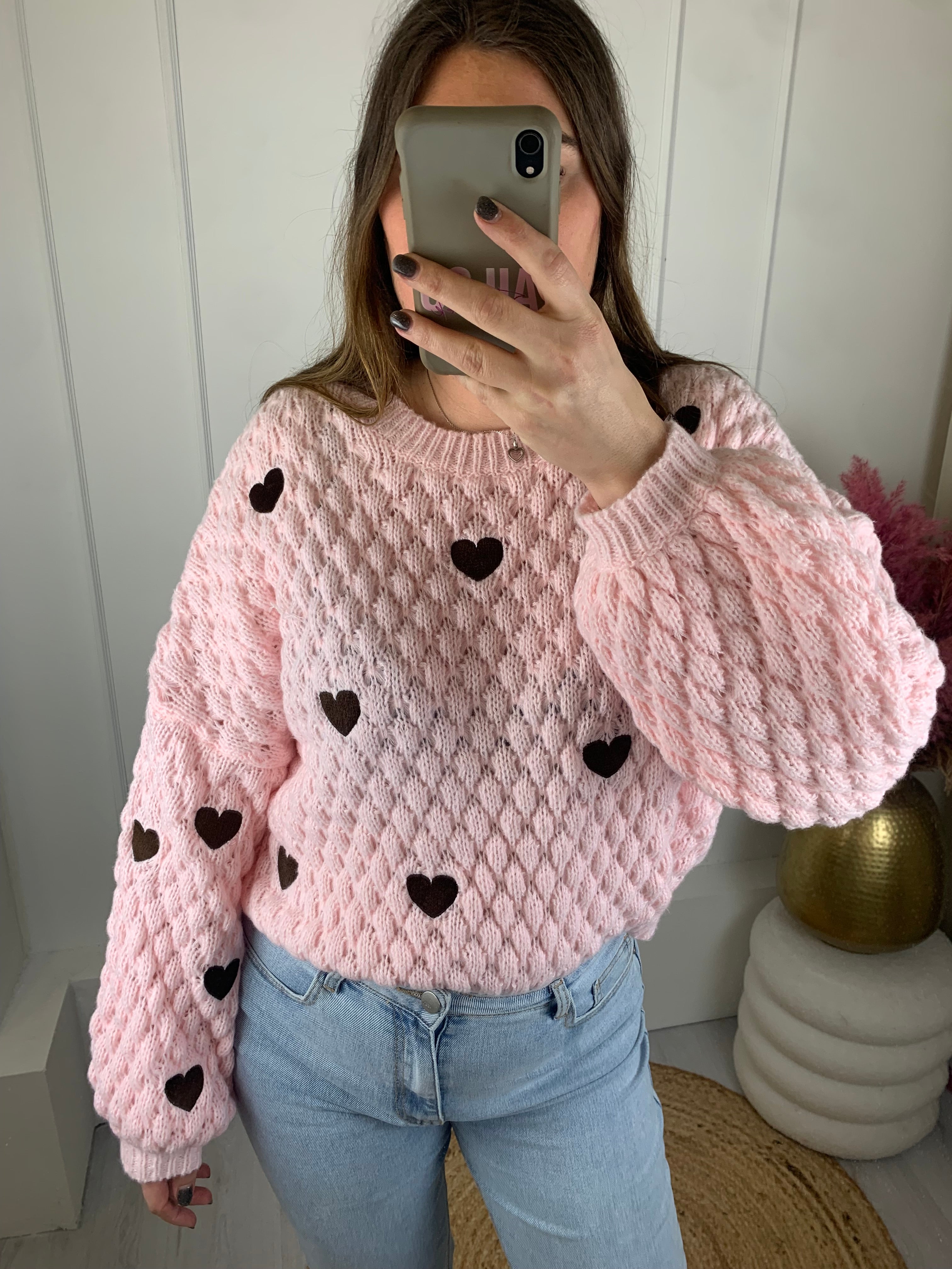 Mooie trui met een ajourprint en geborduurde hartje op voorpand en mouwen.