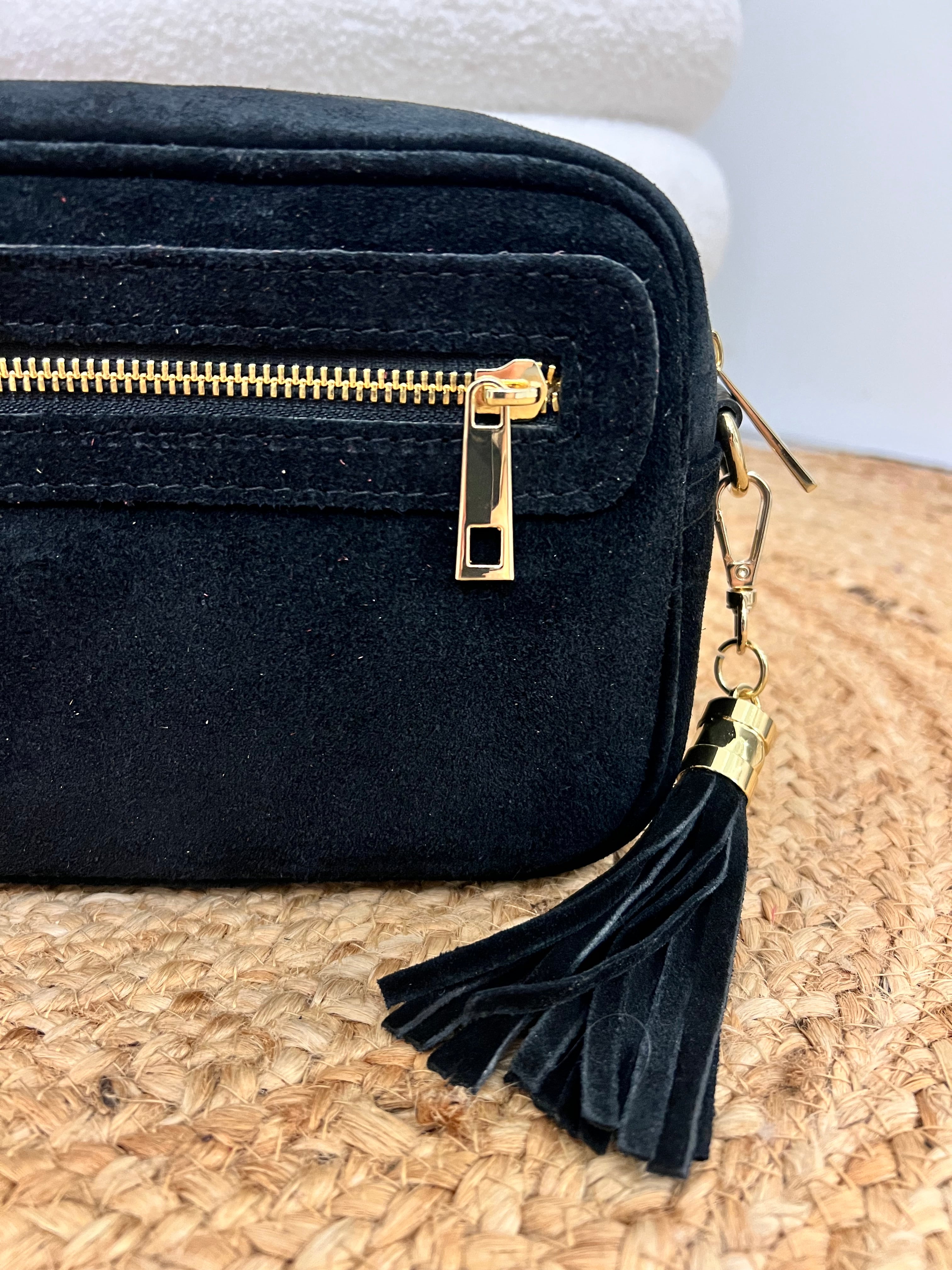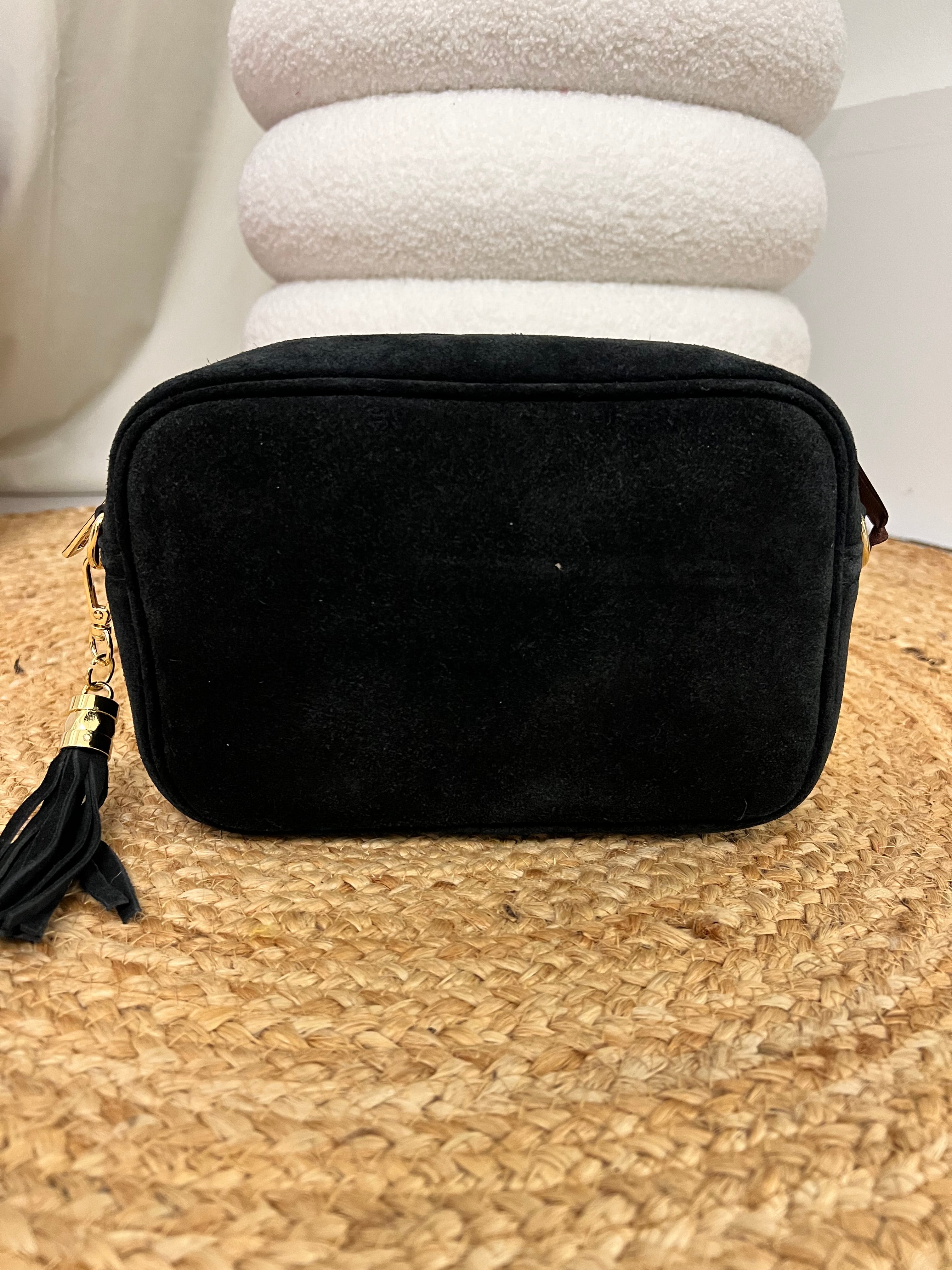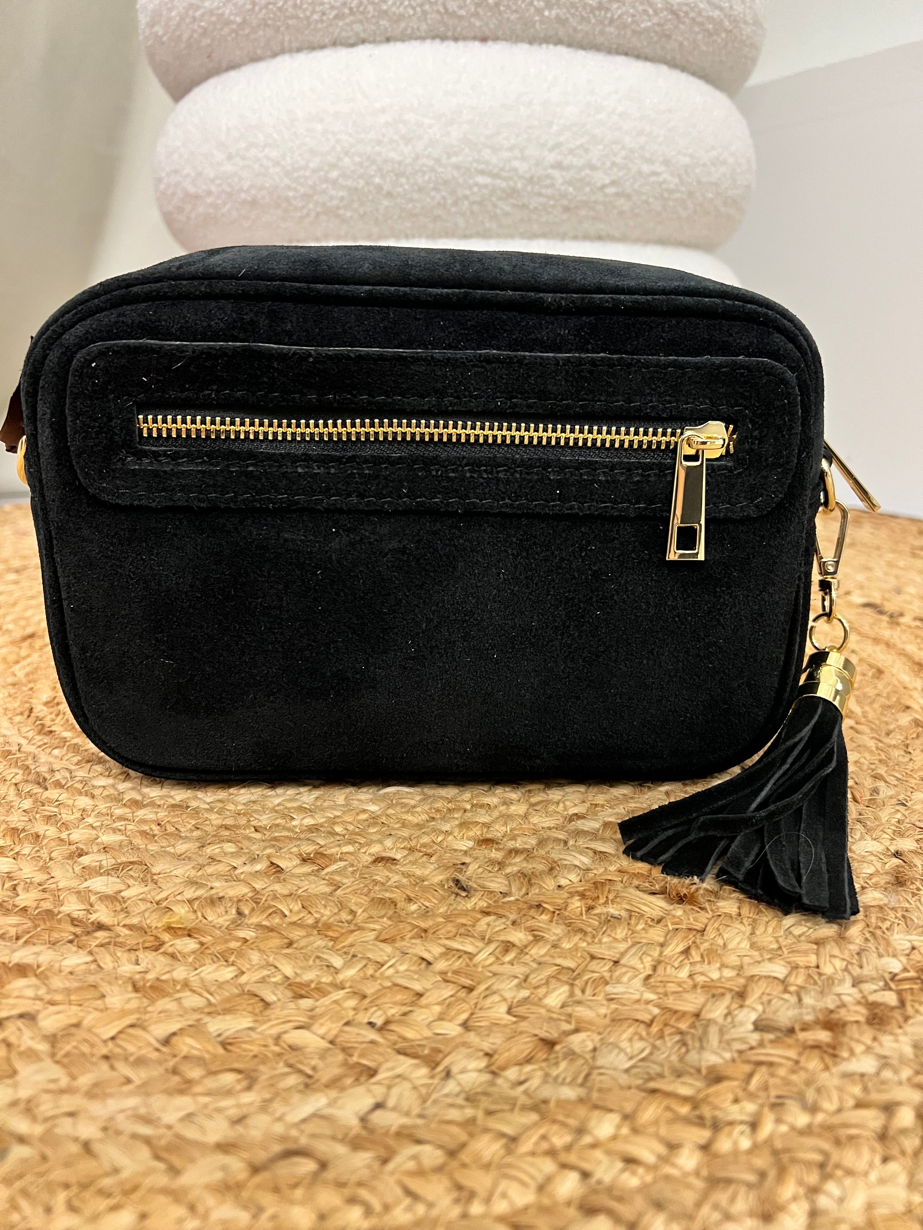 Mooie crossbody tas. De tas heeft een gouden rits aan de bovenkant en een rits aan de voorkant. Bij de tas zit een hengsel waarmee je hem om kan hangen. De tas is suède en 100% leer!
