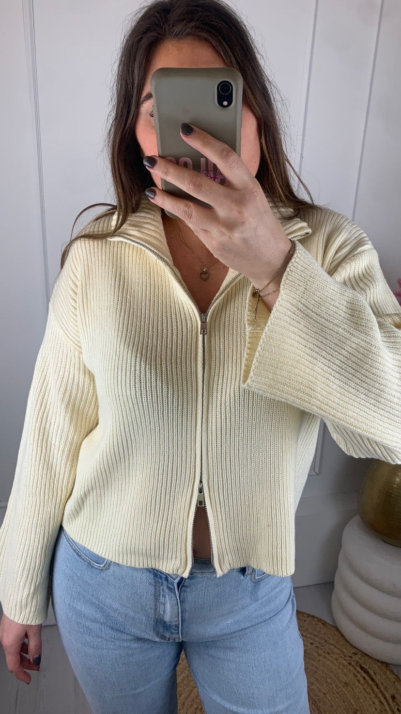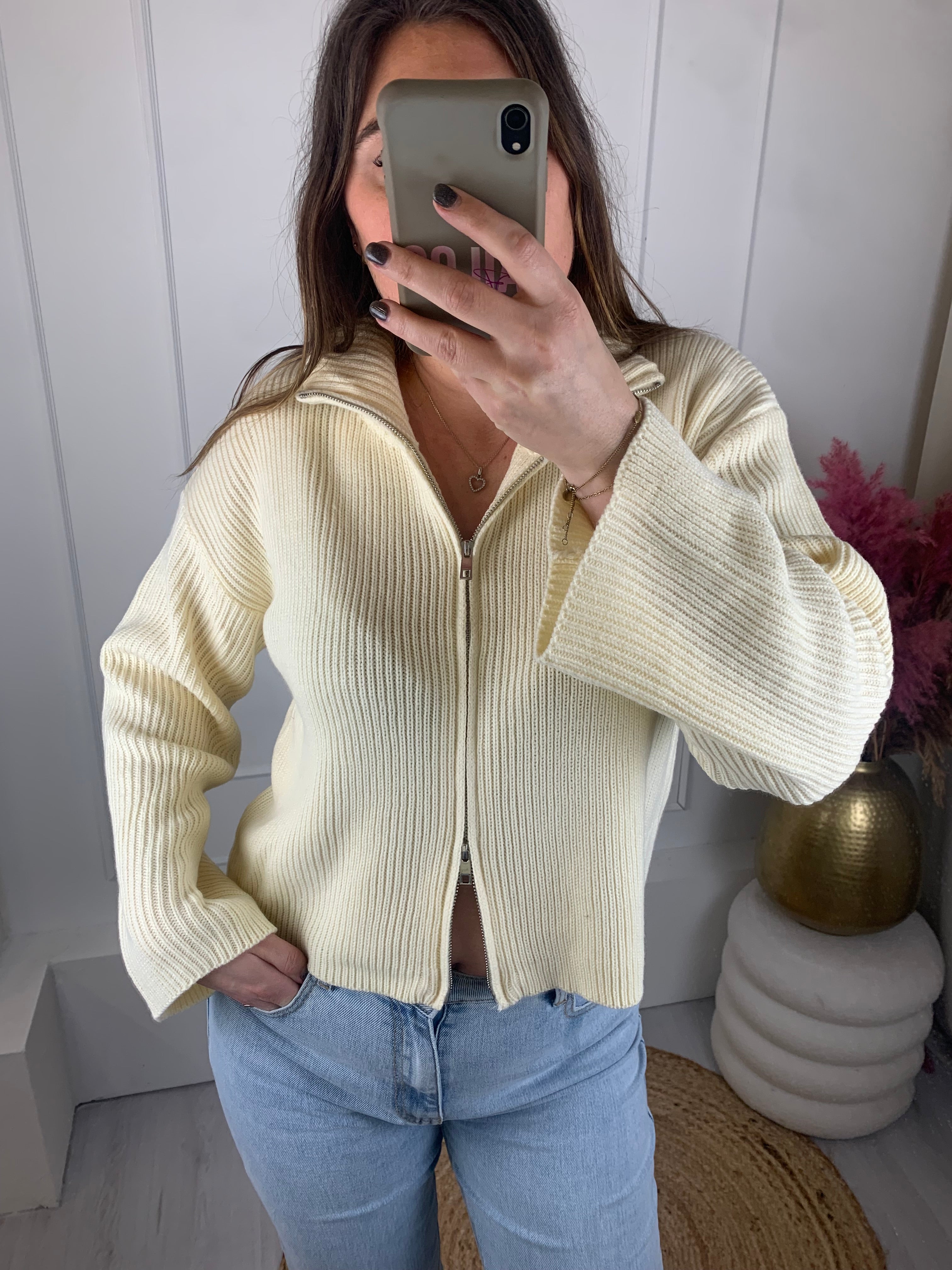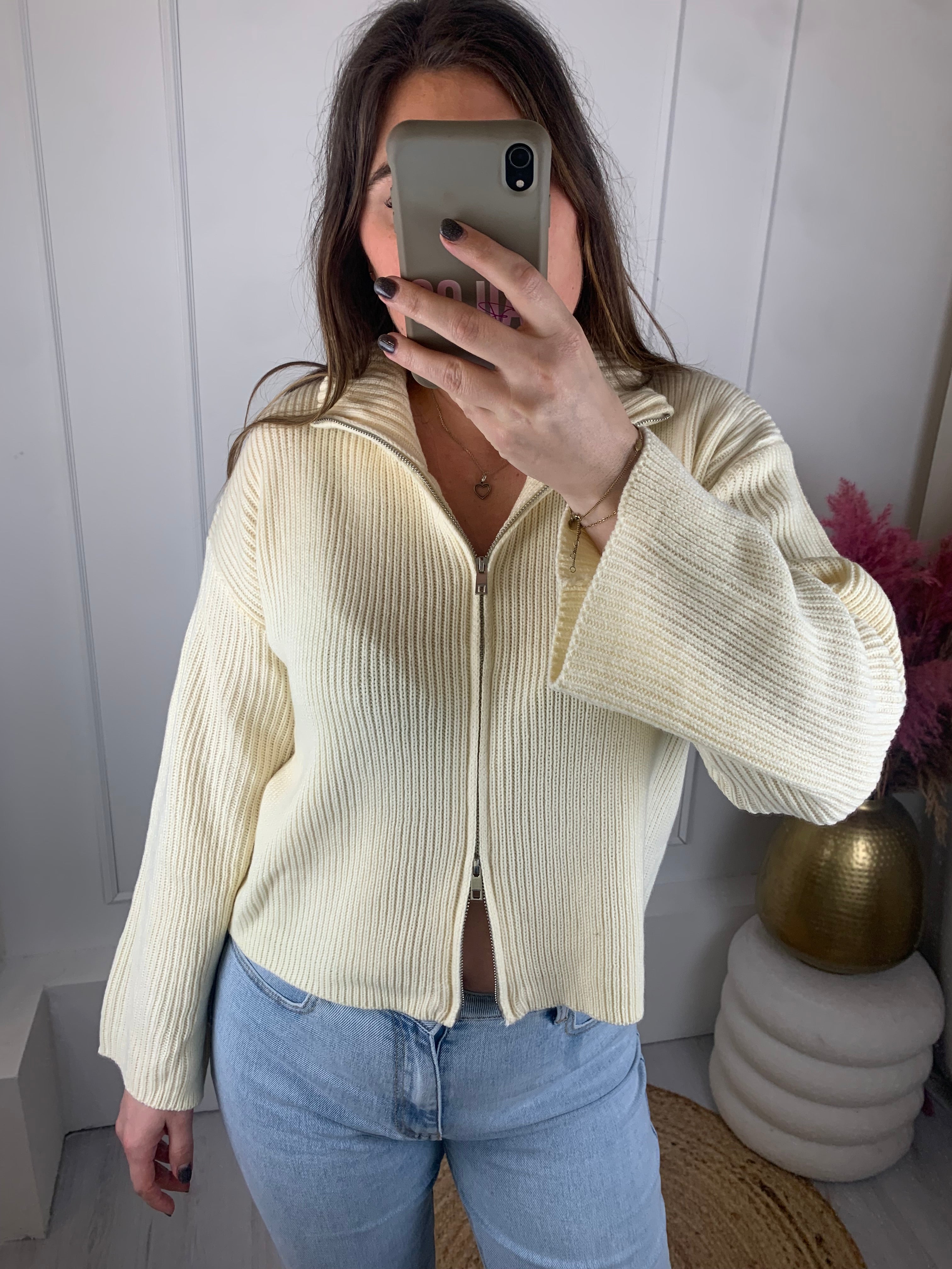 Vest met opstaande kraag en rits die aan boven- en onderkant open kan. De trui heeft een zachte patent steek. Het vest is ook verkrijgbaar in licht blauw