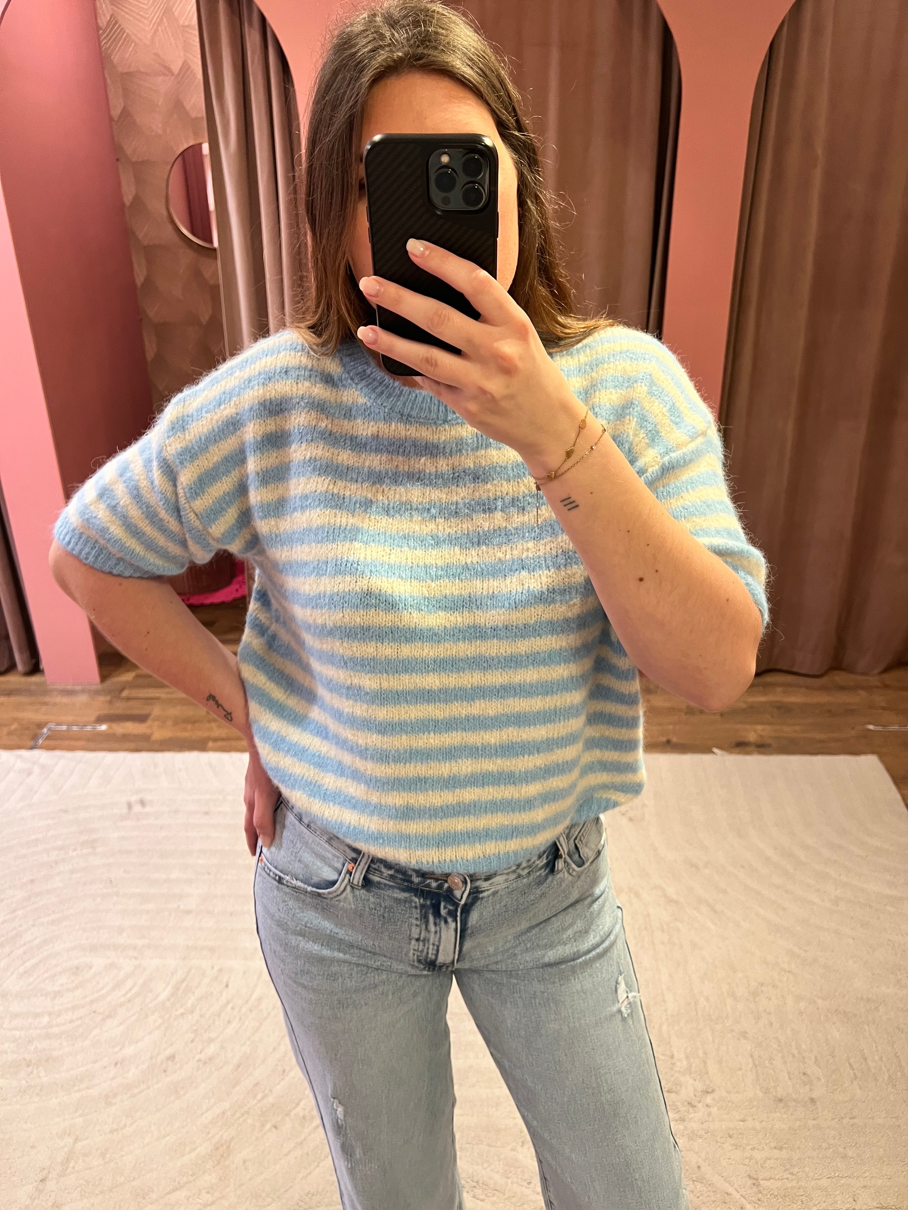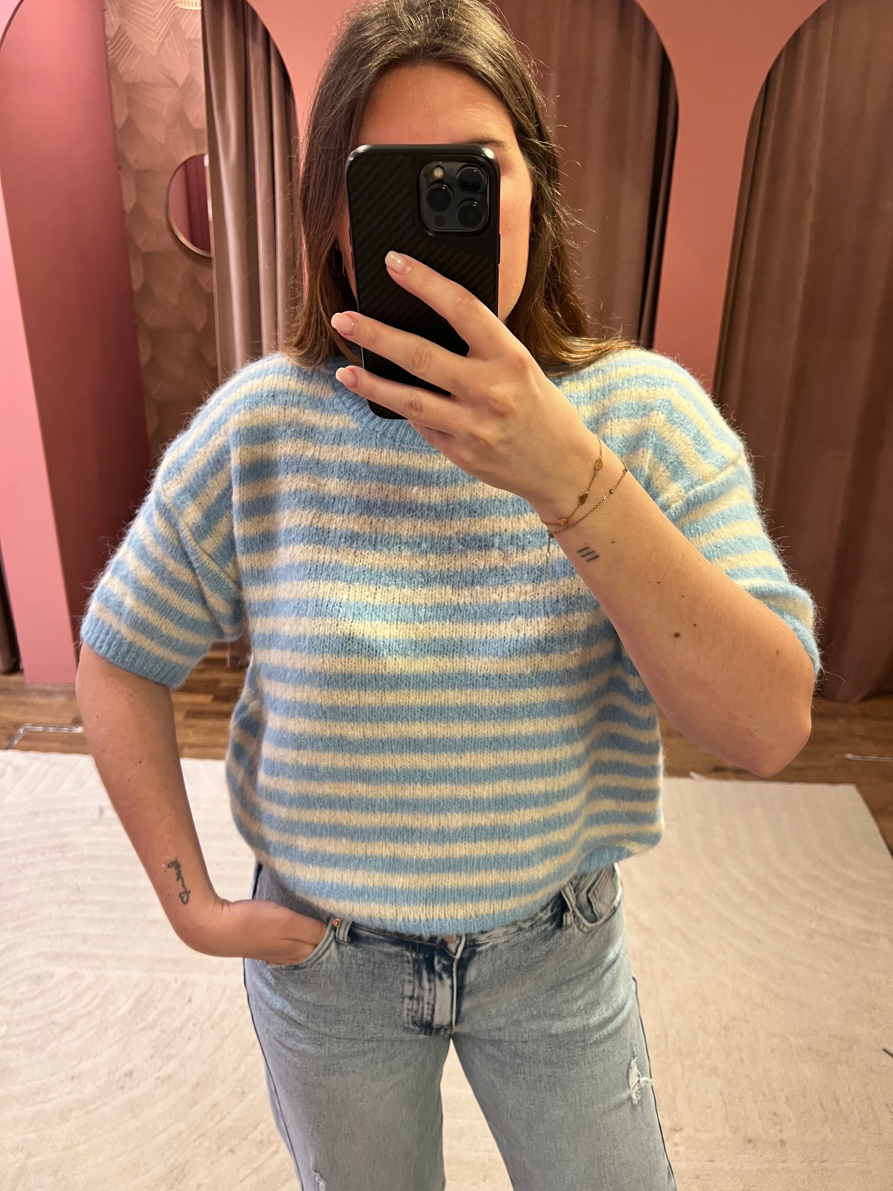 Zachte trui met korte mouwtjes en een klein streepje. De trui kriebelt niet.