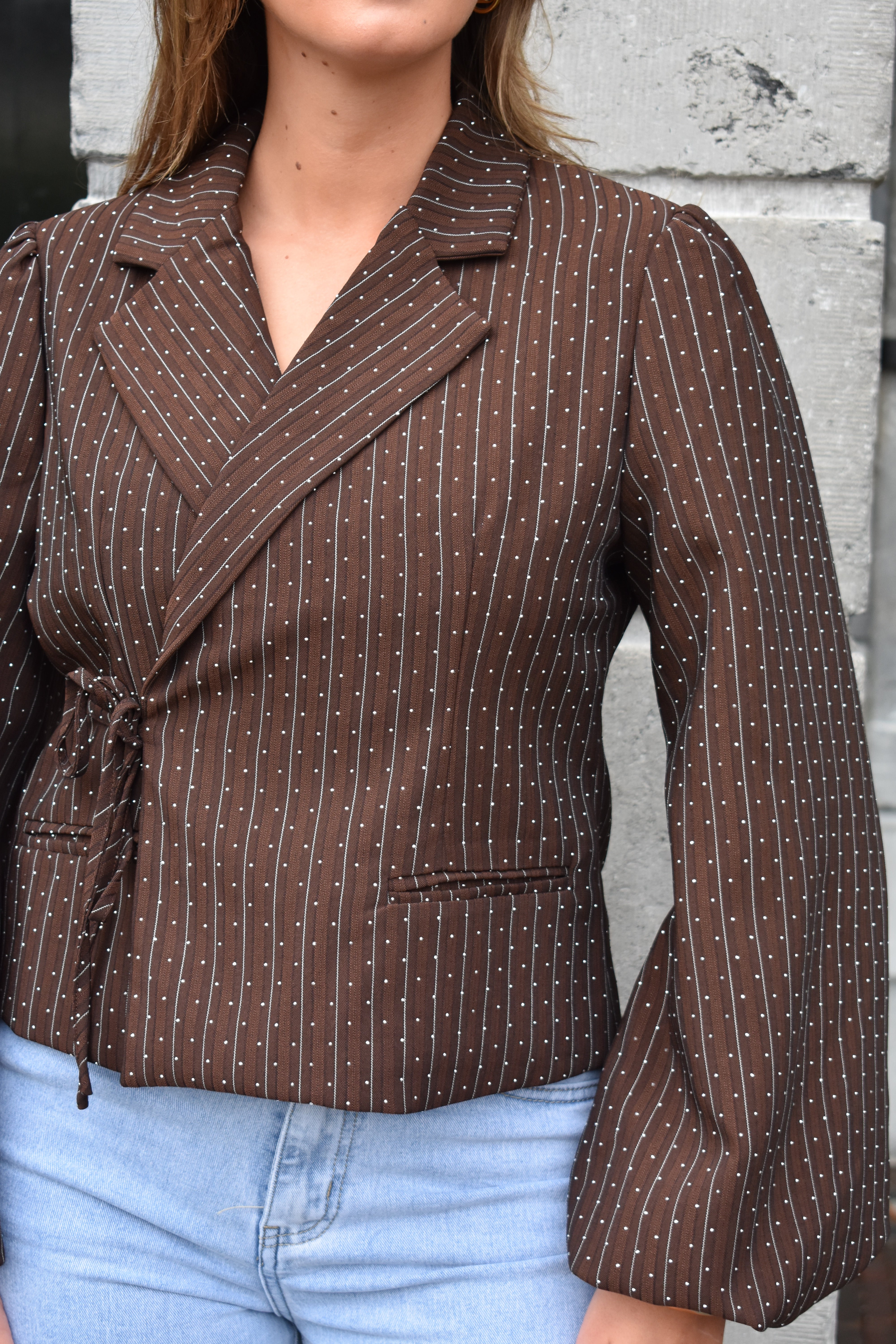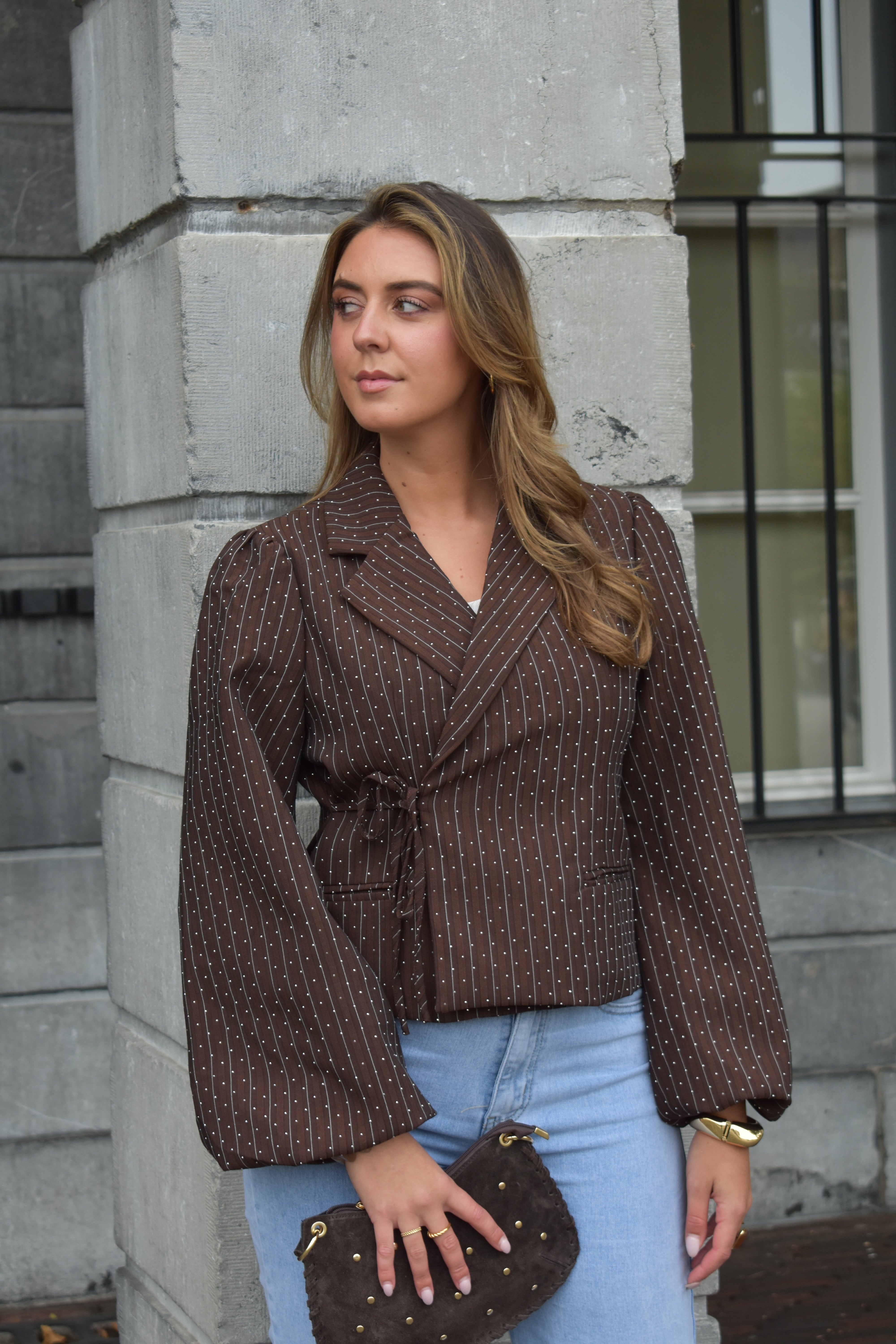 Deze fantastische blazer met glitter steentjes is echt een eye catcher. hij heeft leuke ballon mauwen en een leuk sentuurtje .