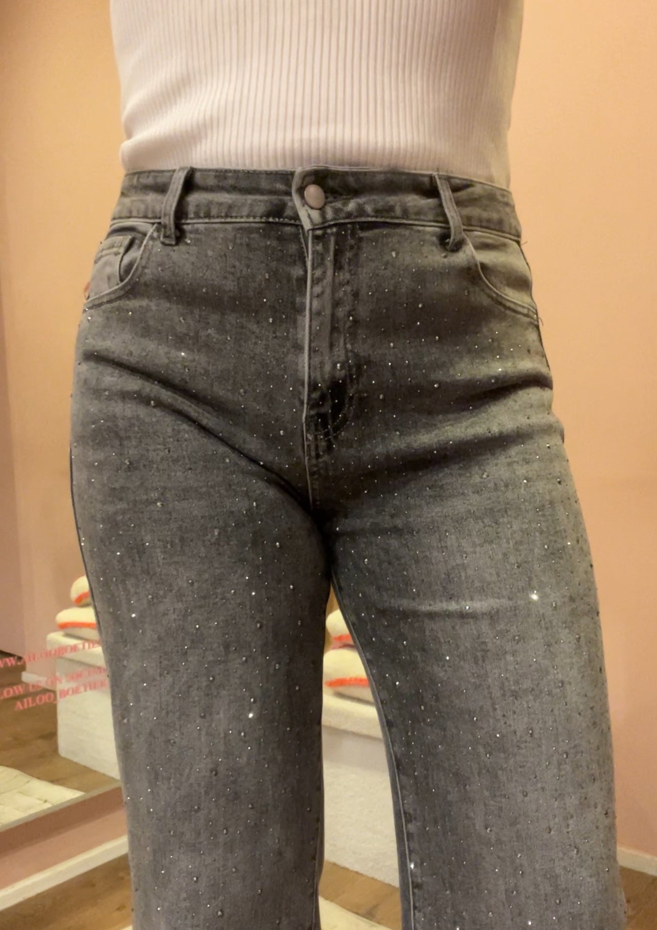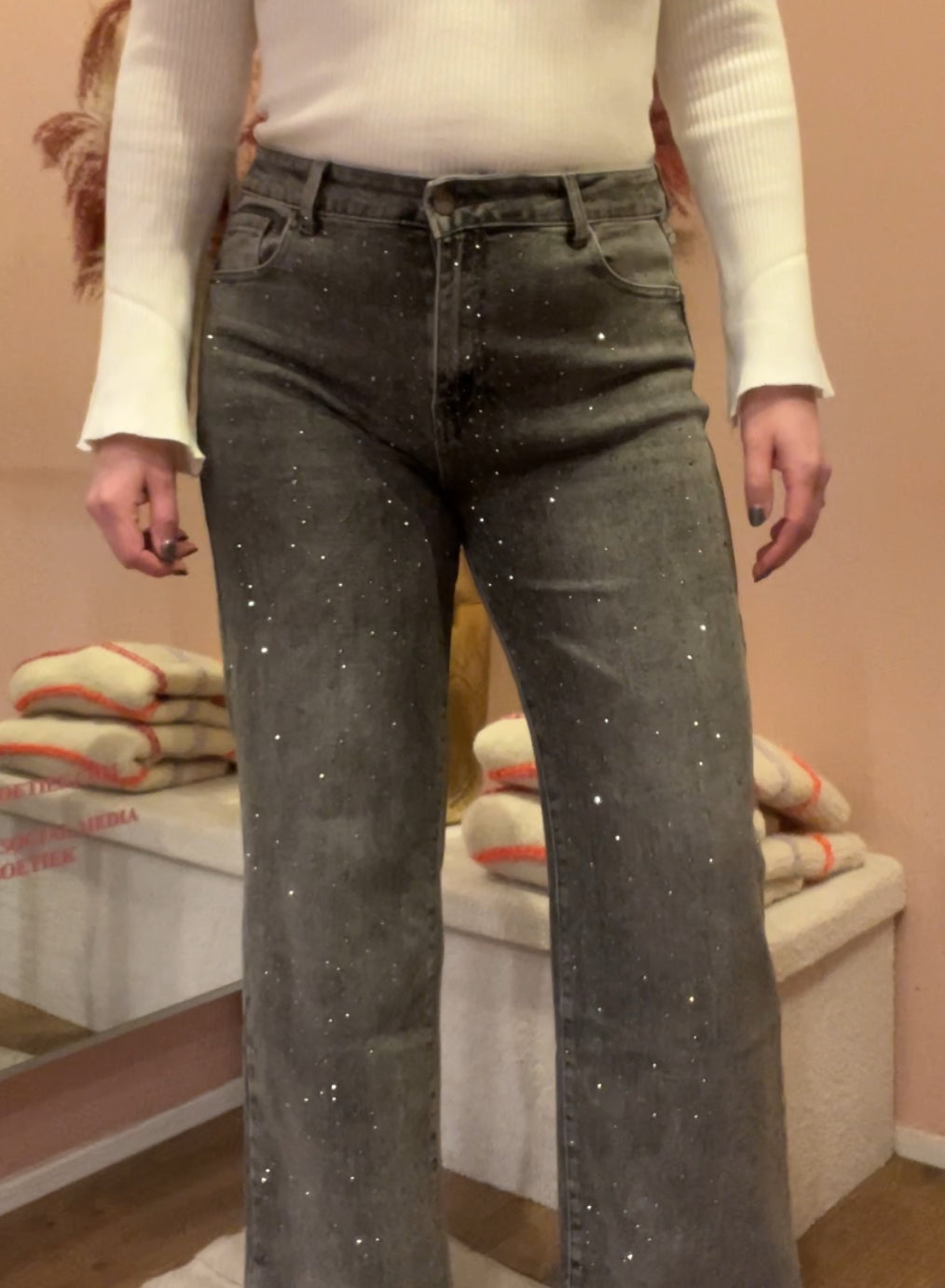 Deze straight leg jeans is high waist en heeft strass steentjes op de voorpanden. De strass steentjes zijn verschillende in grote. In de jeans zit stretch zodat deze heerlijk comfy zit.