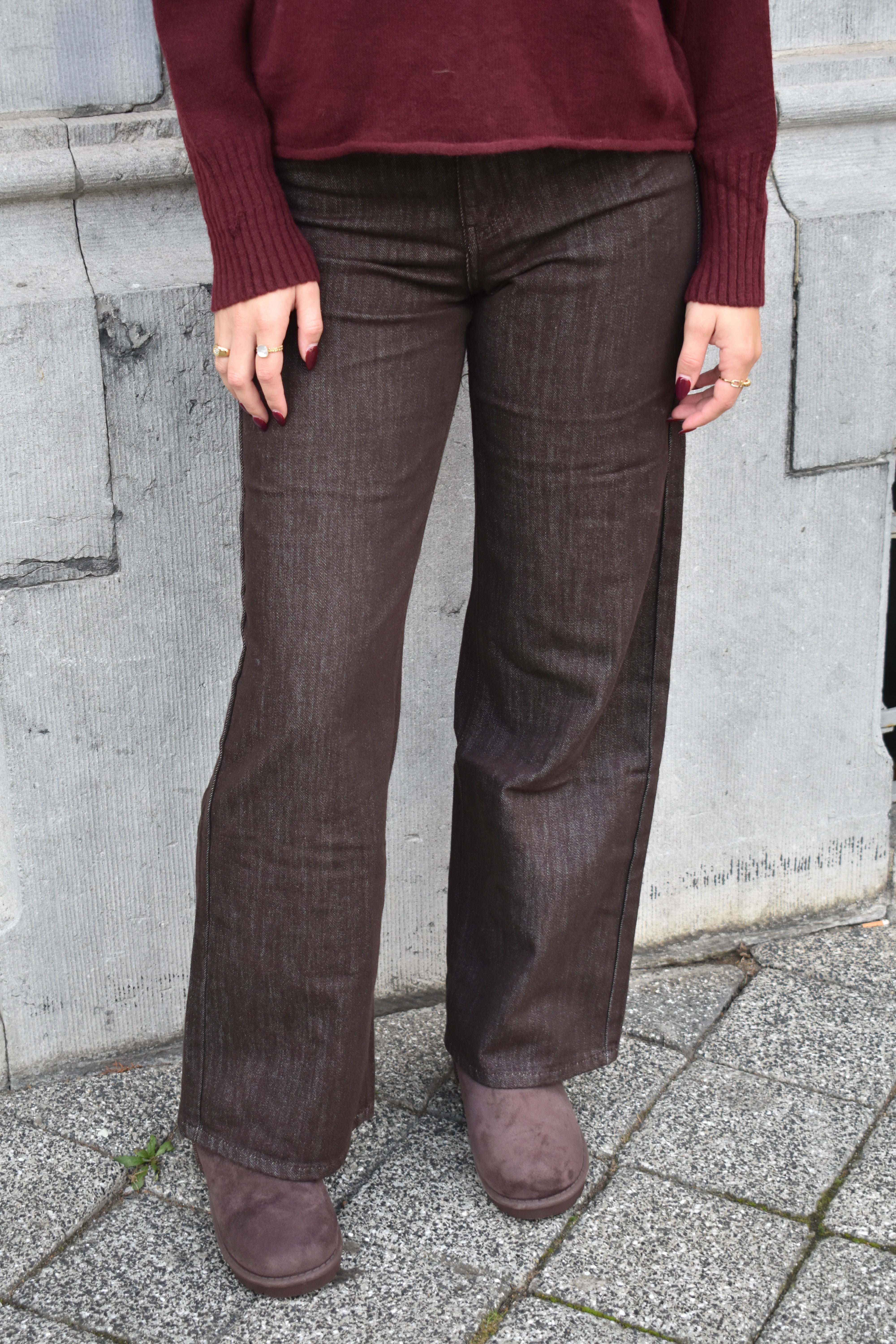 Deze leuke choco jeans is een high waist en heeft een staight leg fit.