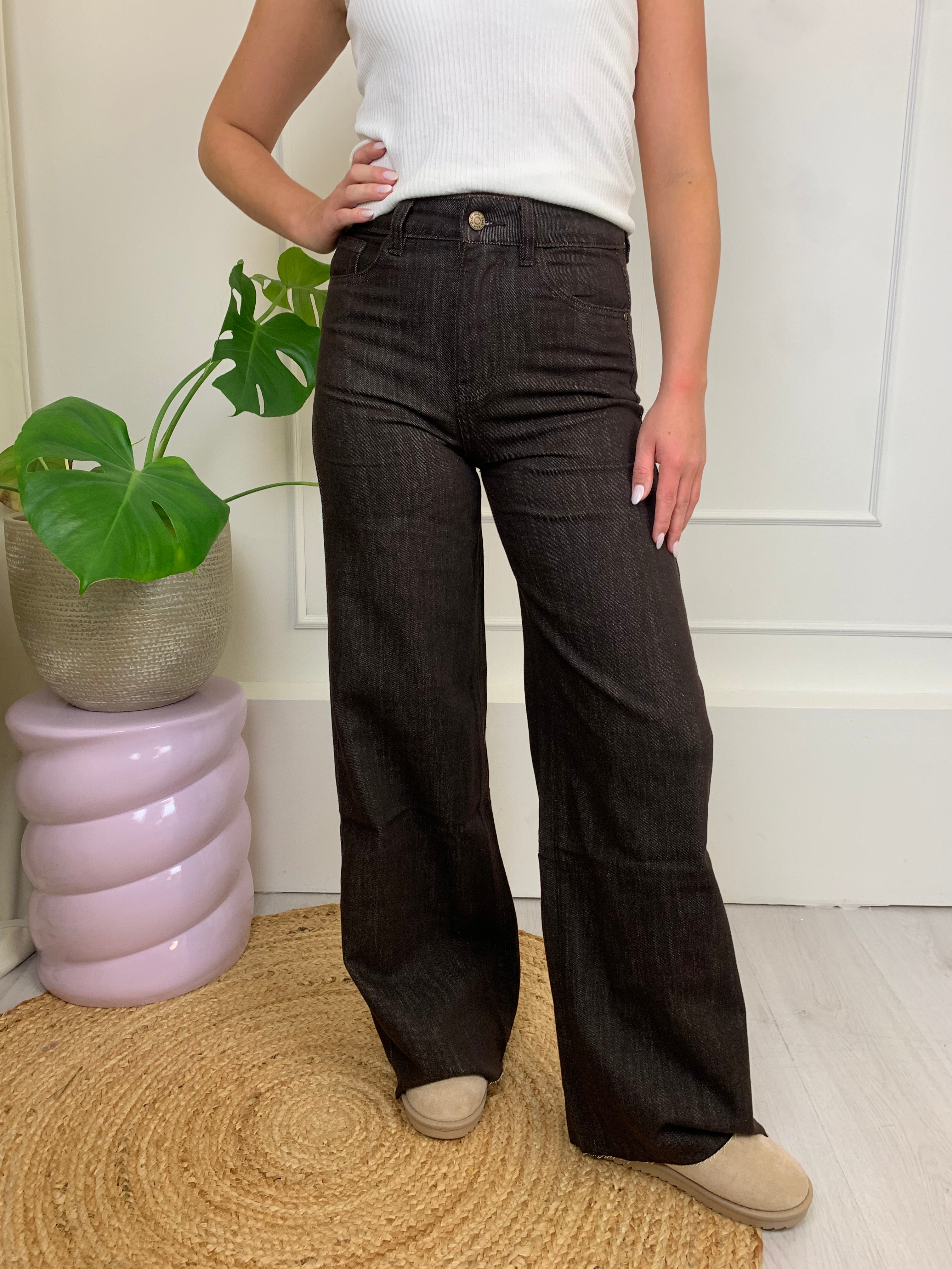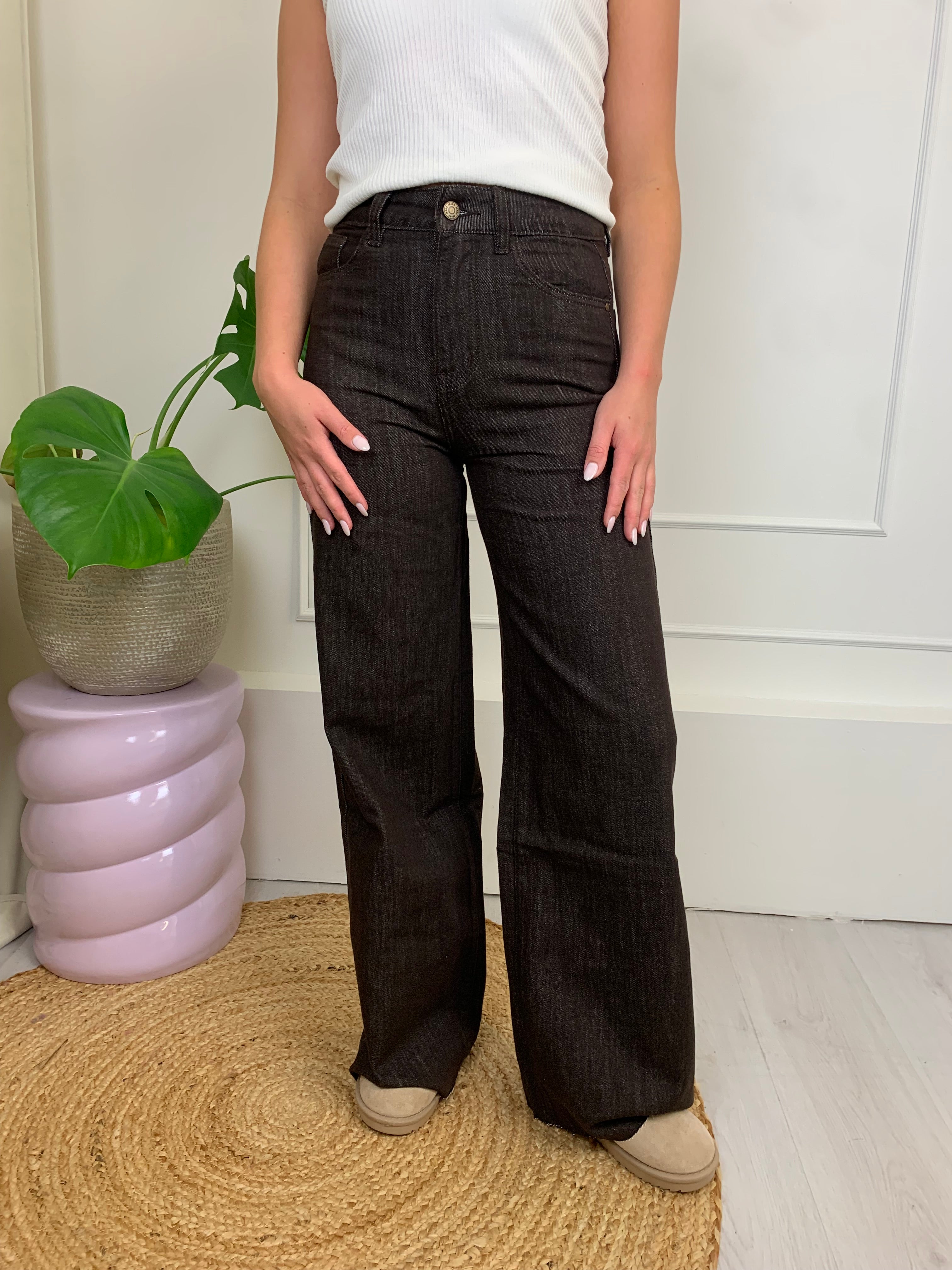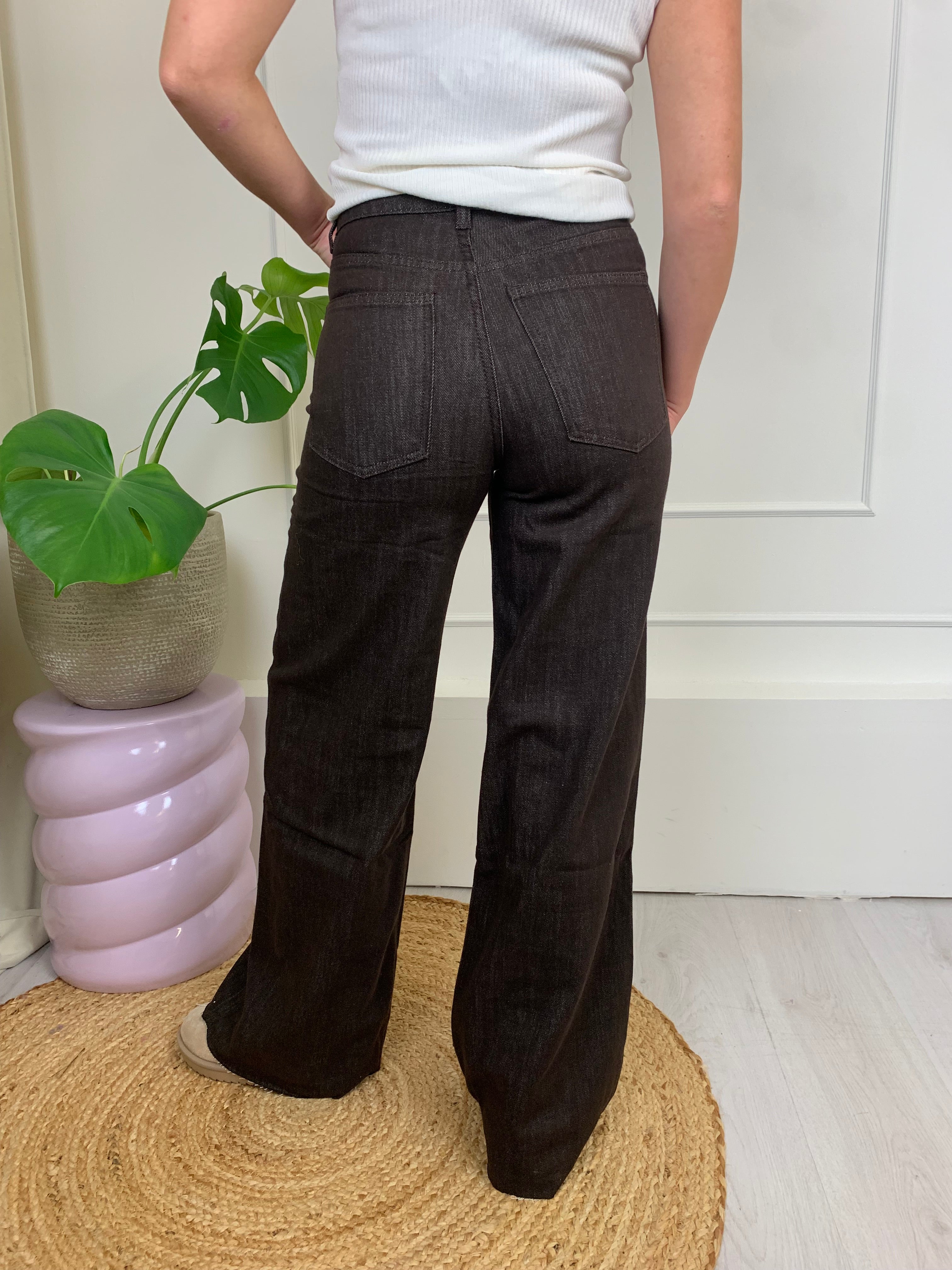 Deze leuke jeans is wide leg, heeft een high waist fit en is in deze heerlijke trendy choco kleur.