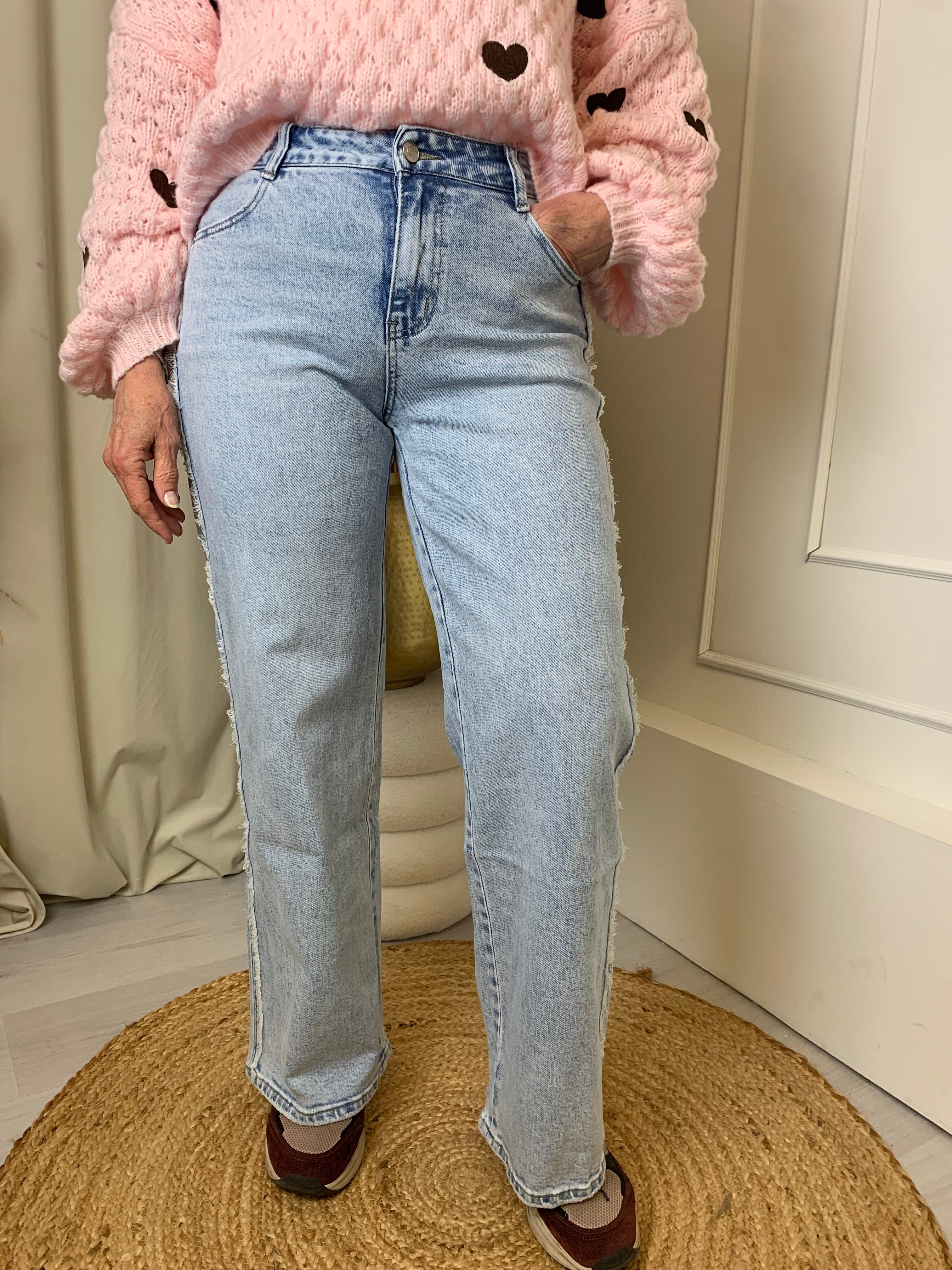 Deze straight leg jeans heeft op de zijkanten van het voorpand een klein franje randje. In de jeans zit stretch zodat deze heerlijk comfy zit.