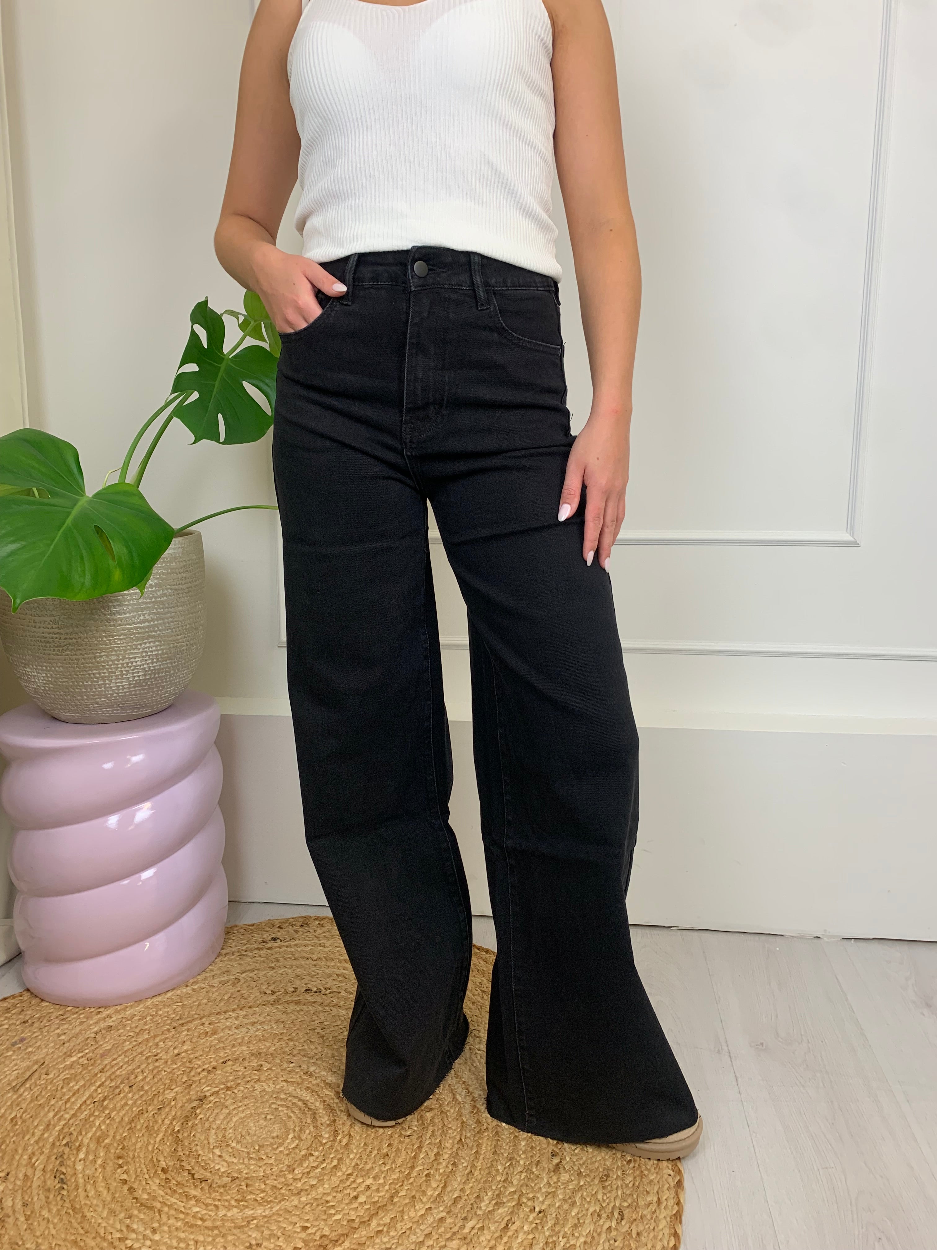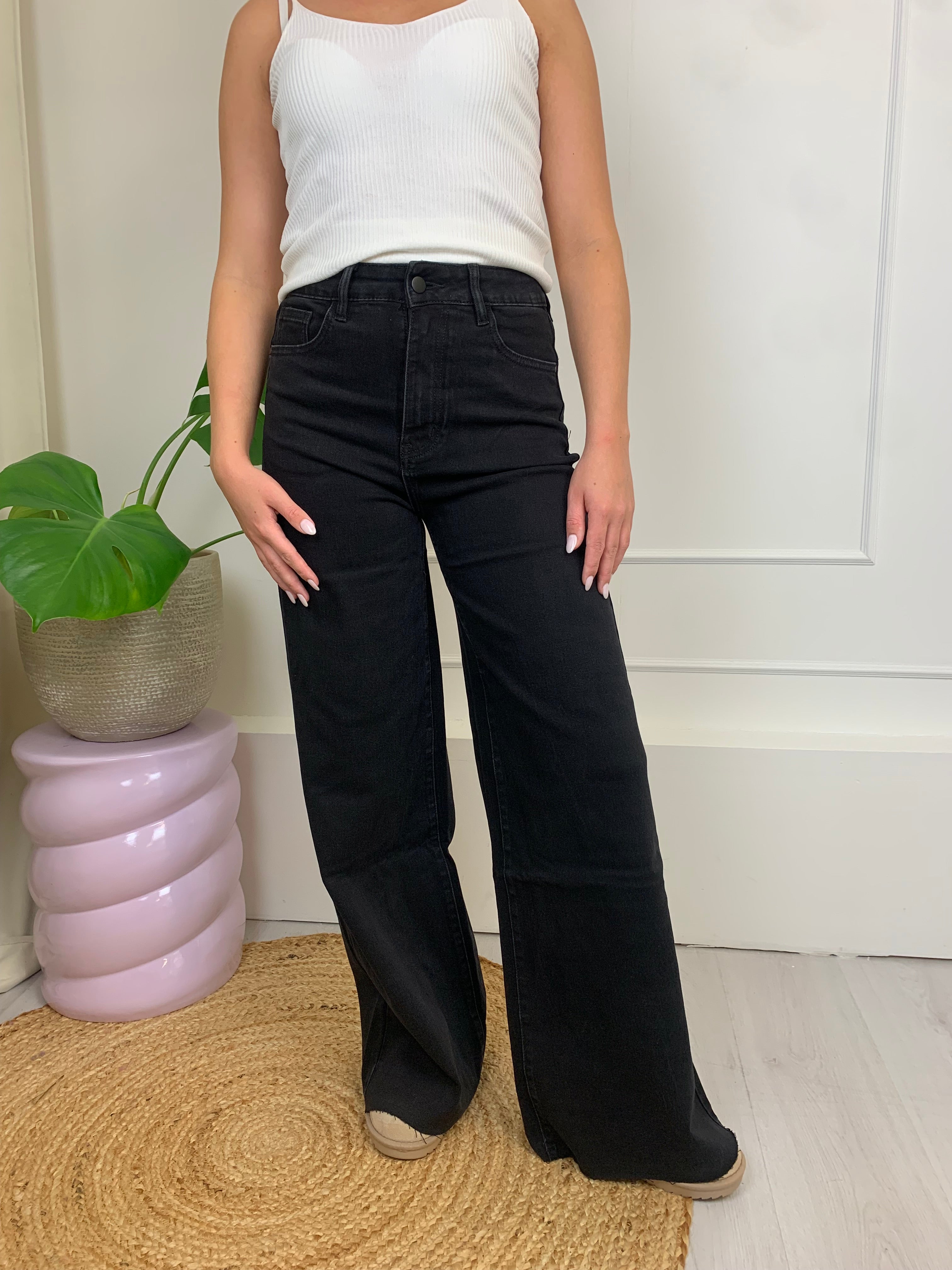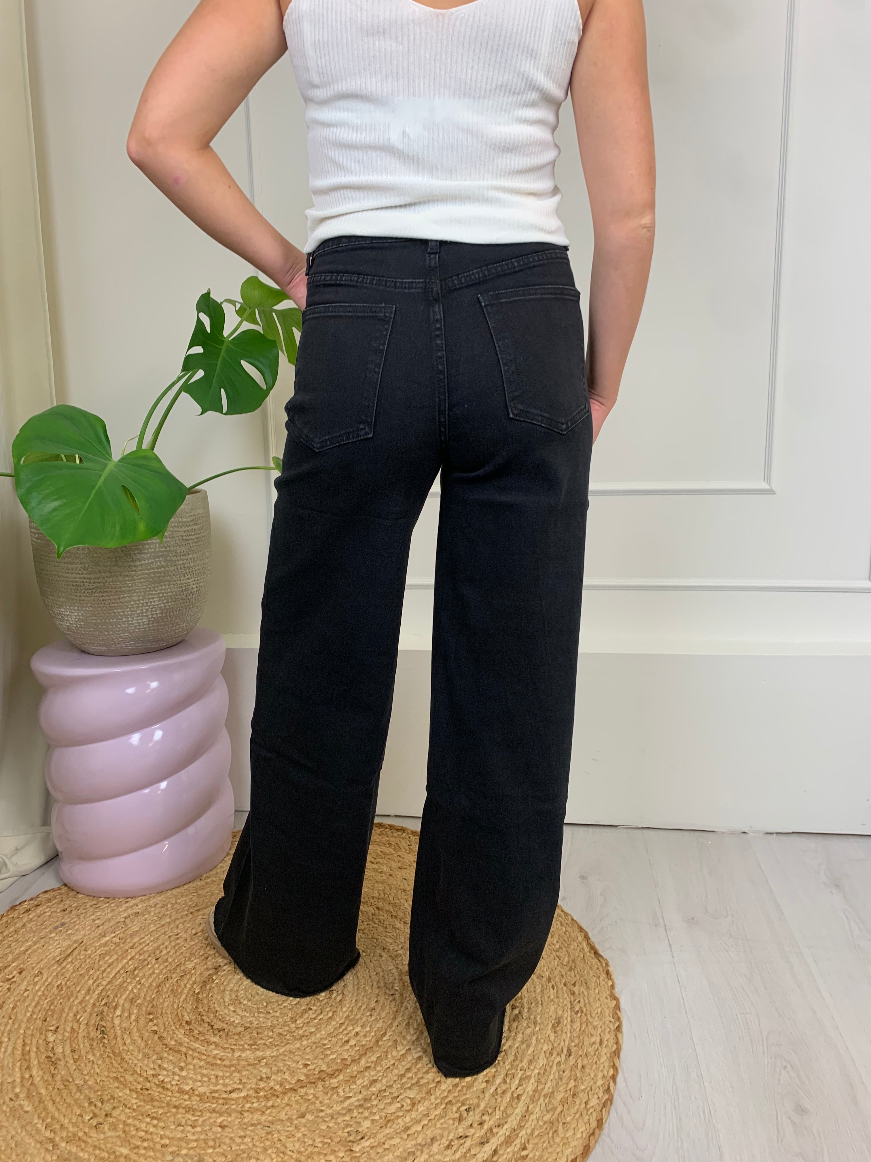 het is een mooie zwarte wide leg jeans met een high waist fit. een basis die niet kan ontbreken in jou kleding kast.