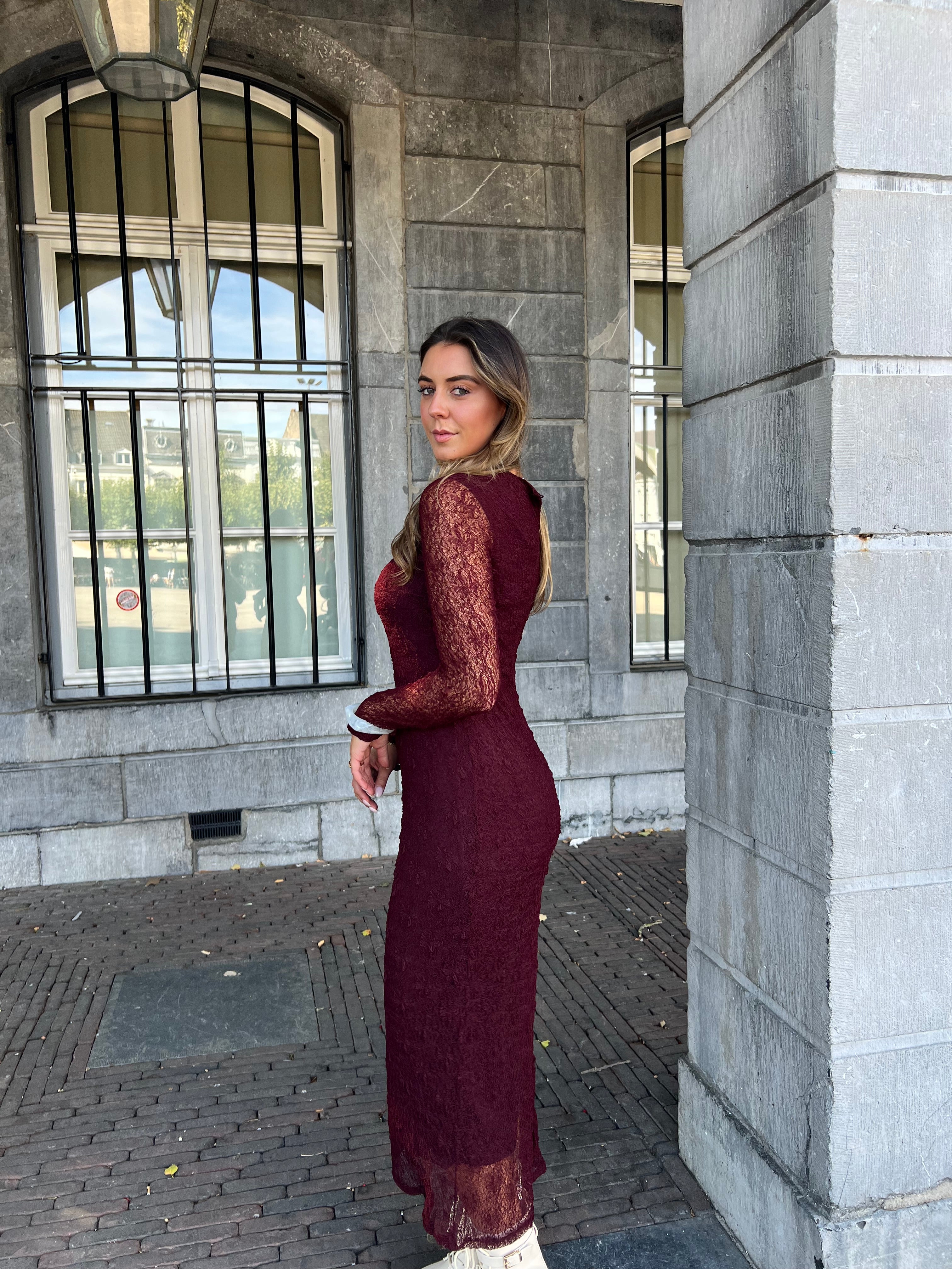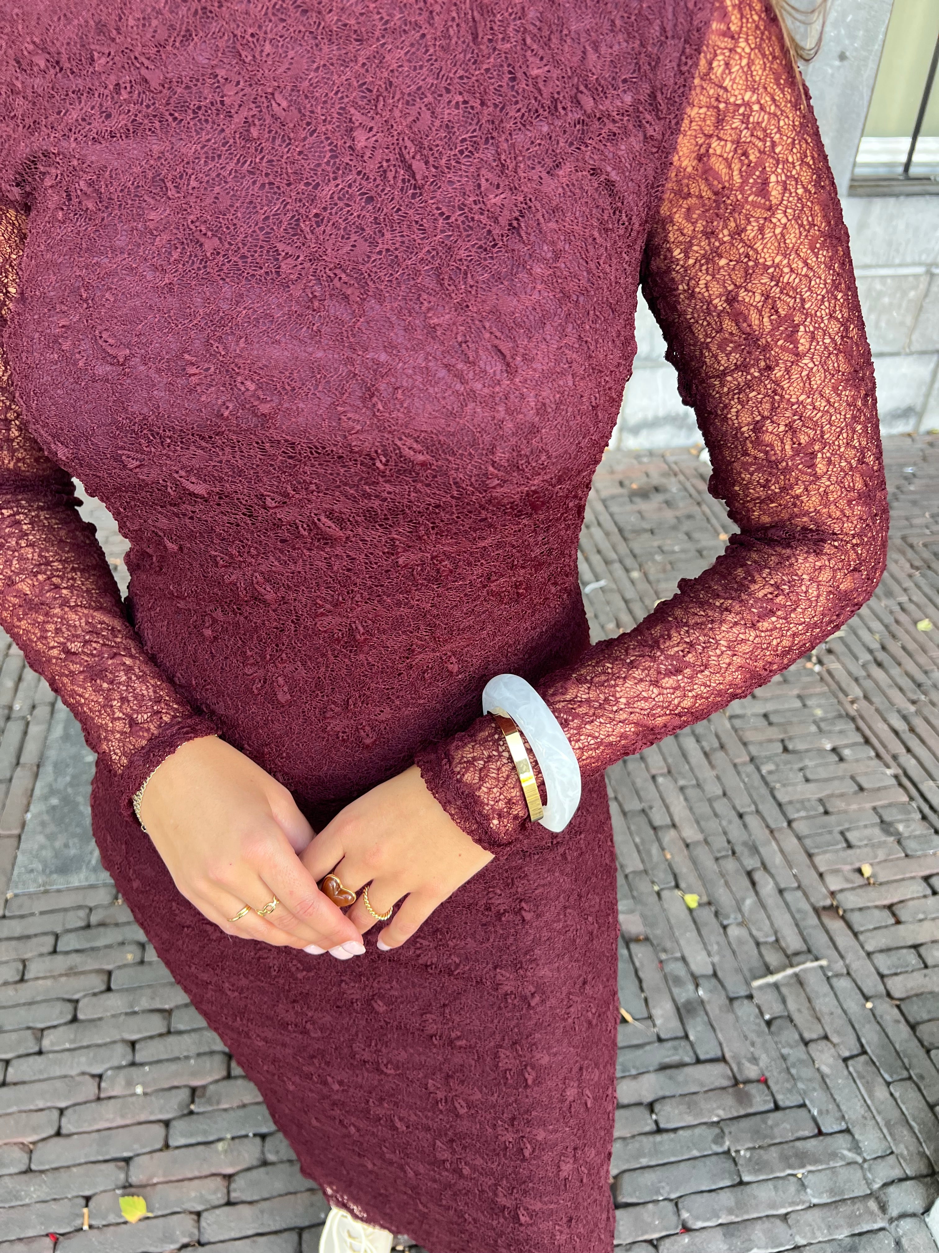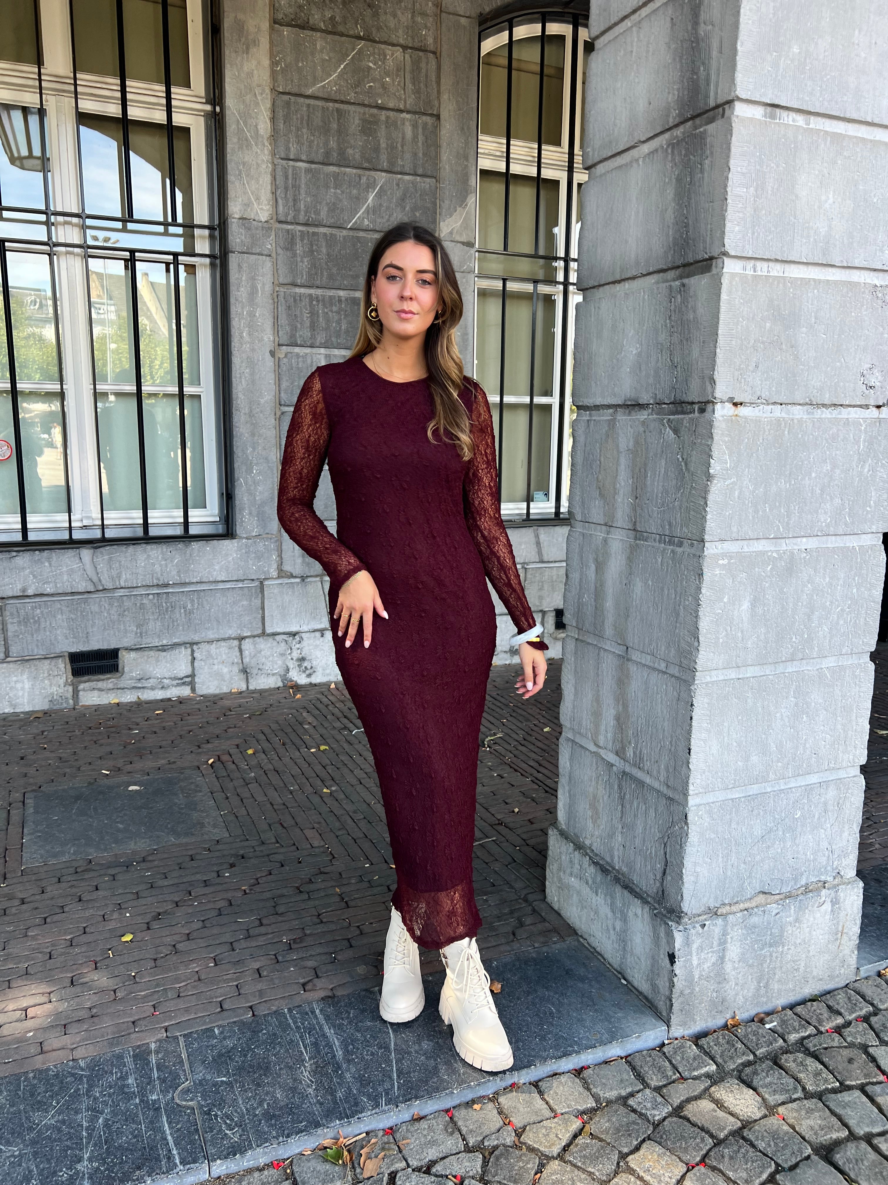 Onze favoriete jurk! een prachtige kante jurk in bordeaux is echt een must have voor het komende seizoen.
