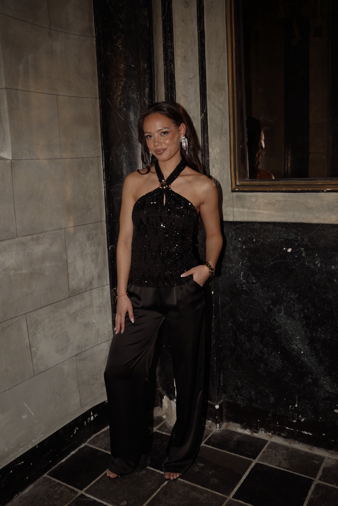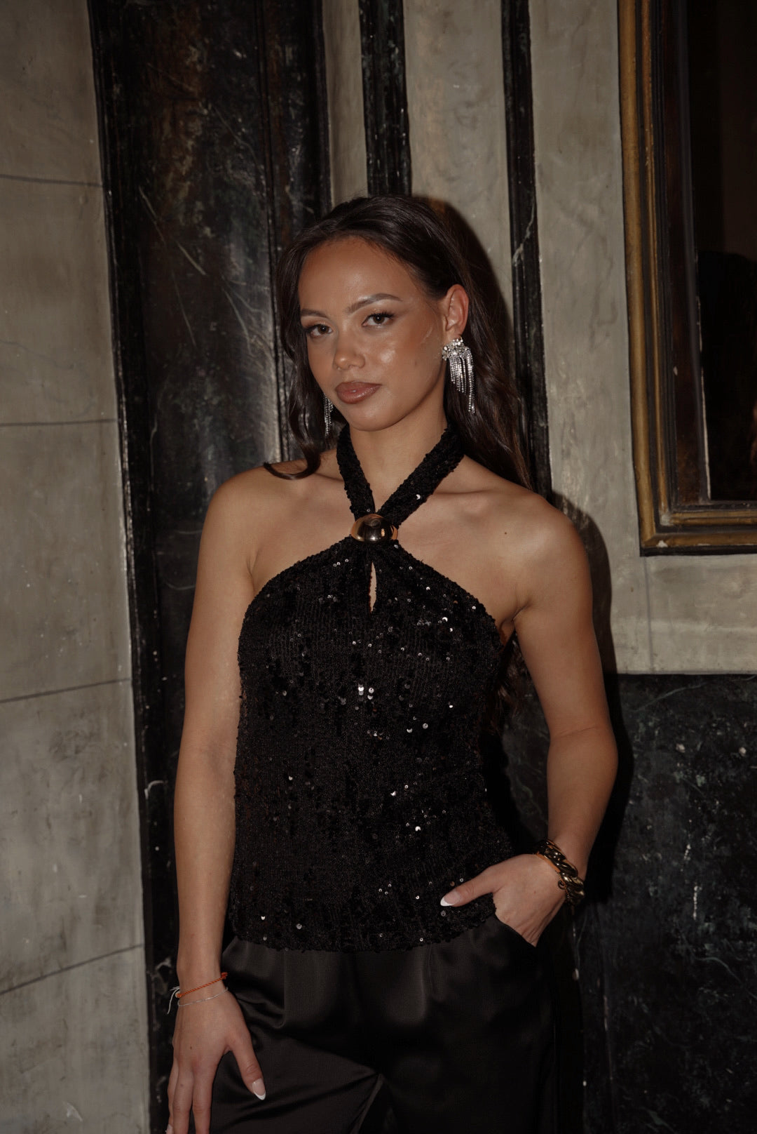 Mooie sparkle haltertop. De top bevat pailletten en heeft een elastieken tailleband bij de borst. Je kunt de top strakker en losser maken door de gouden "knoop" bij de nek omhoog of omlaag te schuiven. De top is gevoerd aan de binnenkant.