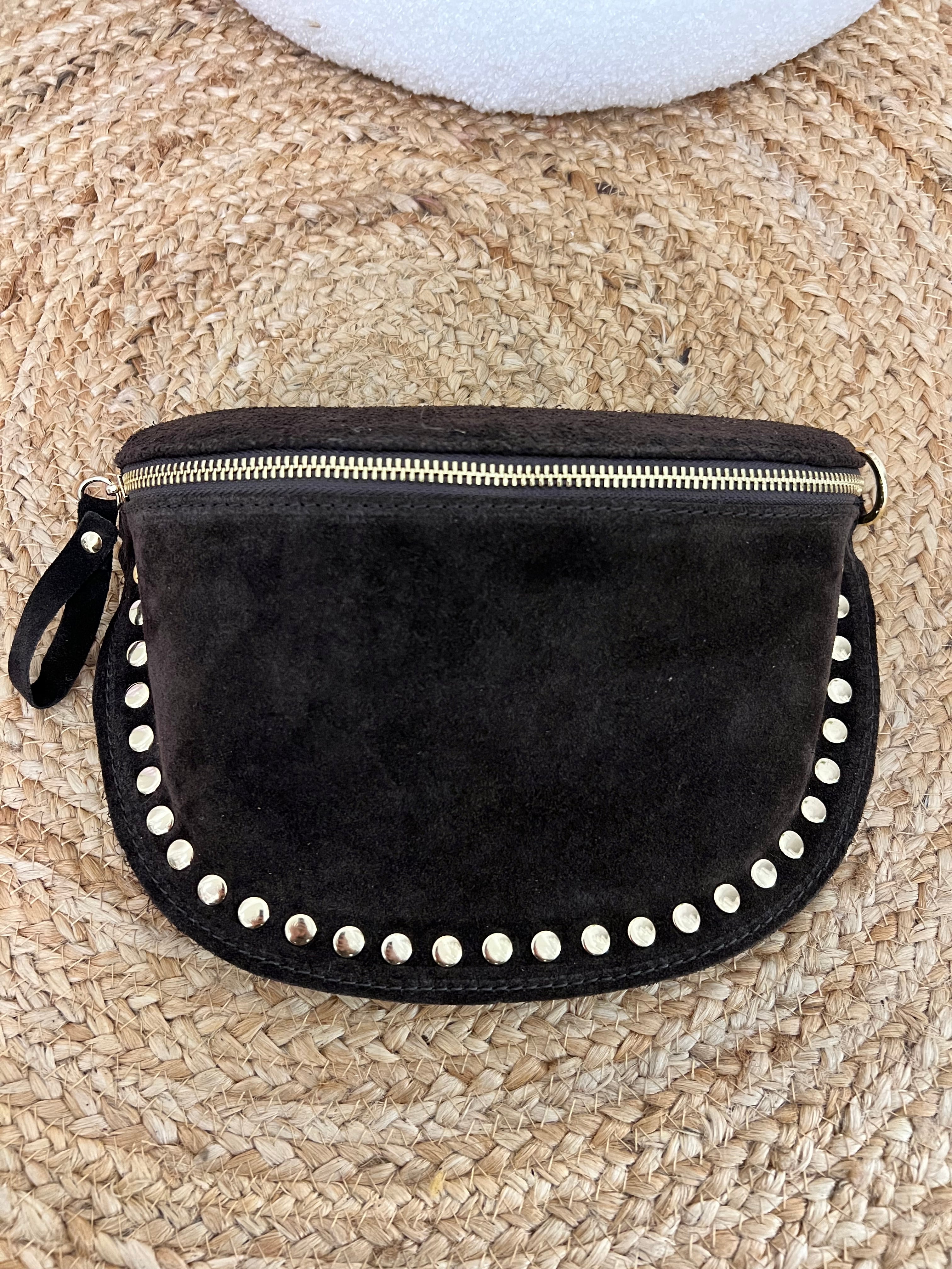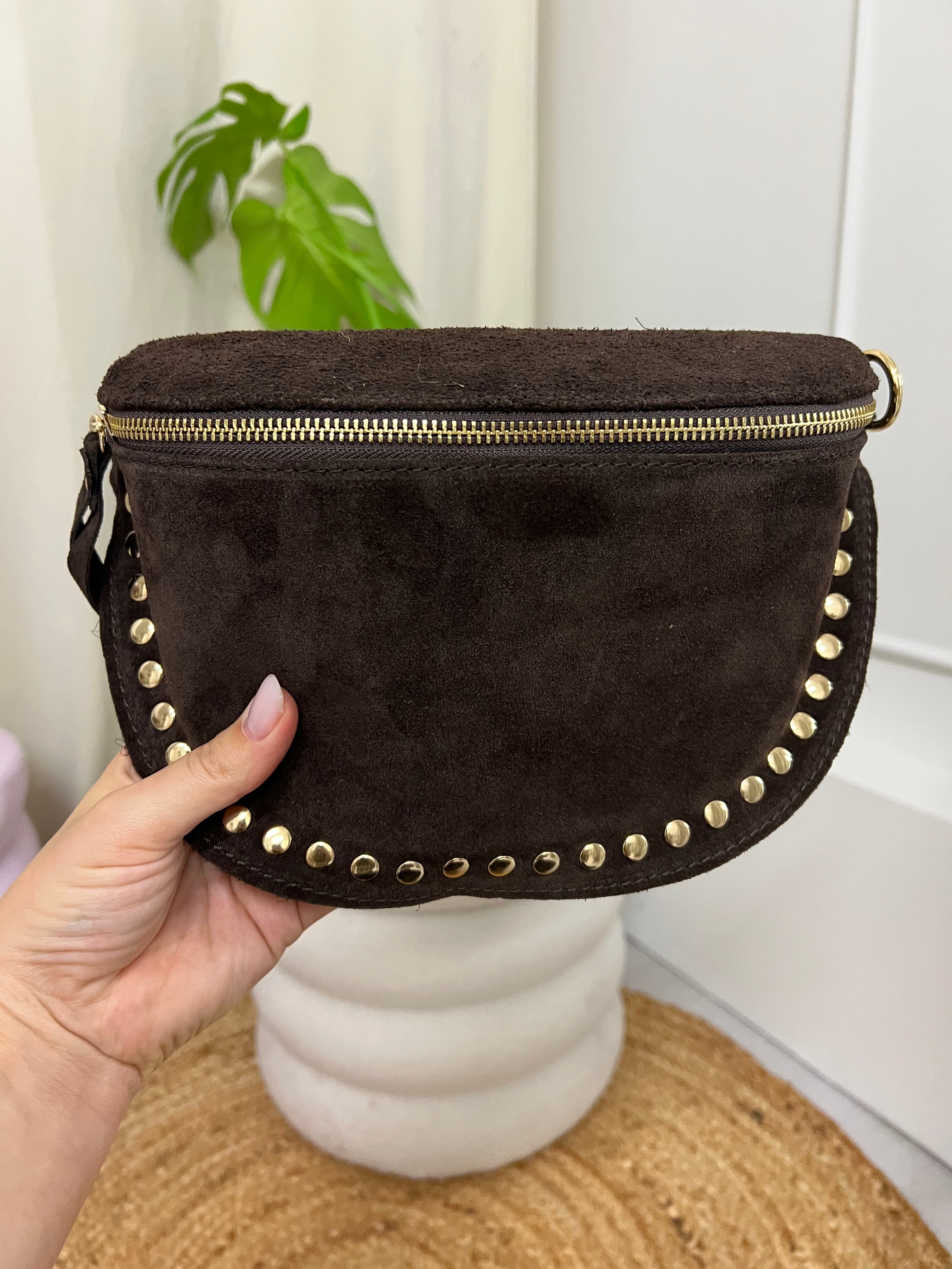 Mooie crossbody tas met studs. De tas heeft een gouden rits en studs. Bij de tas zit een hengsel waarmee je hem om kan hangen. De tas is suède en 100% leer!