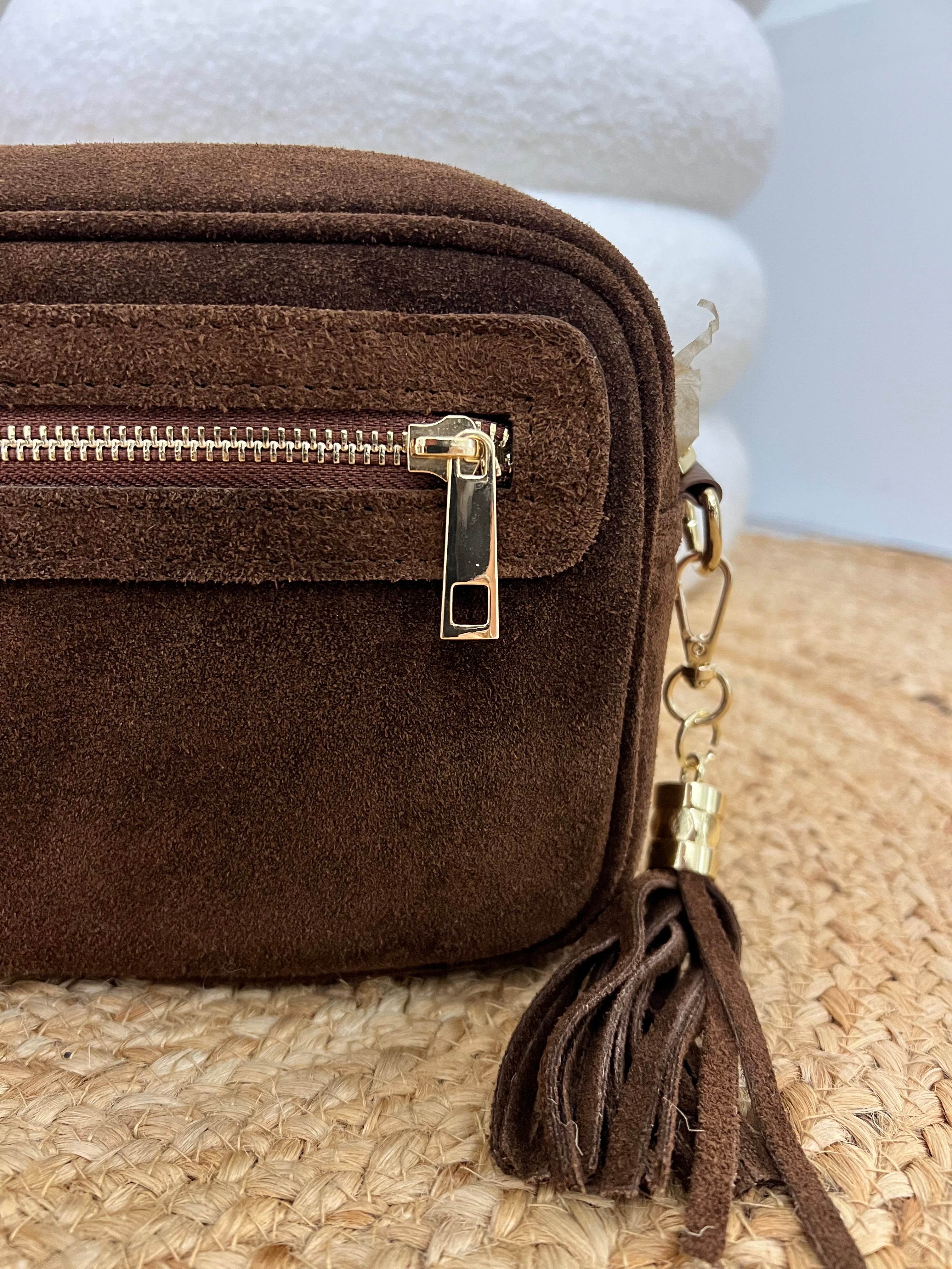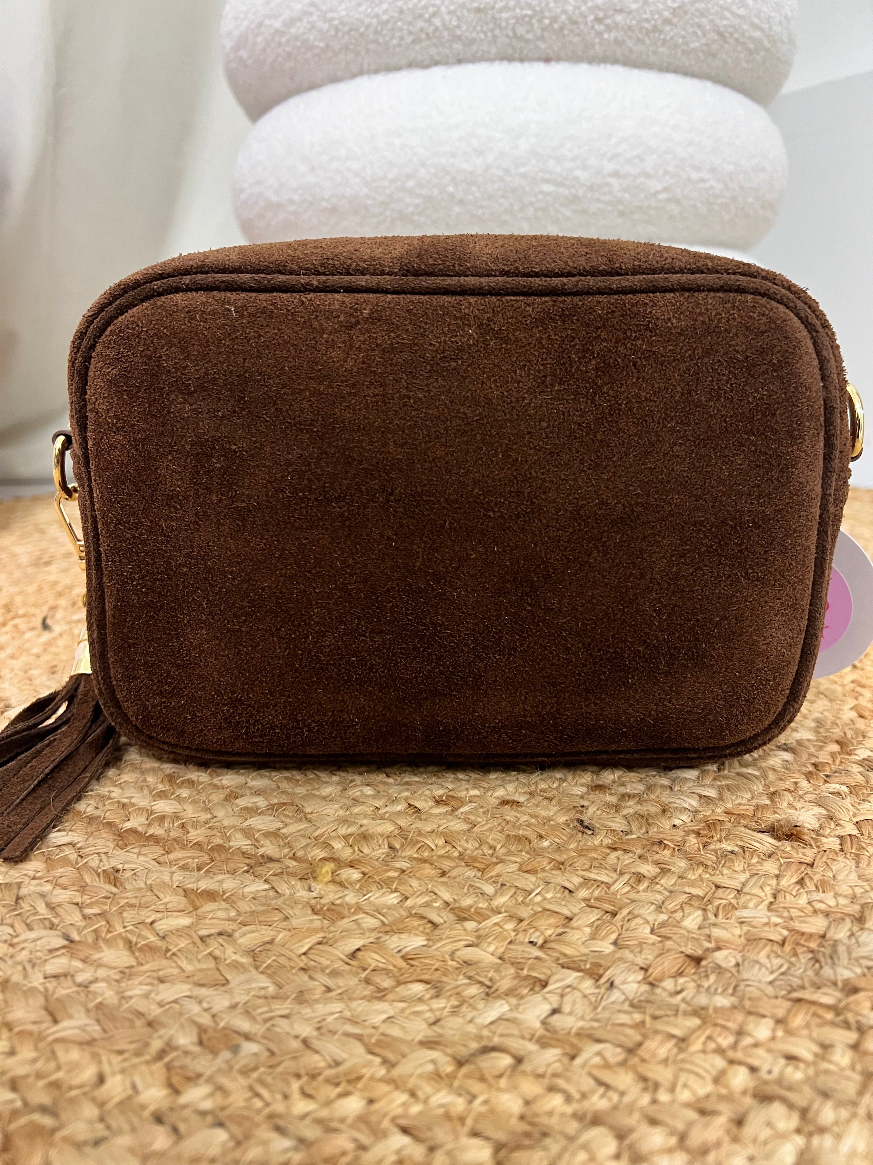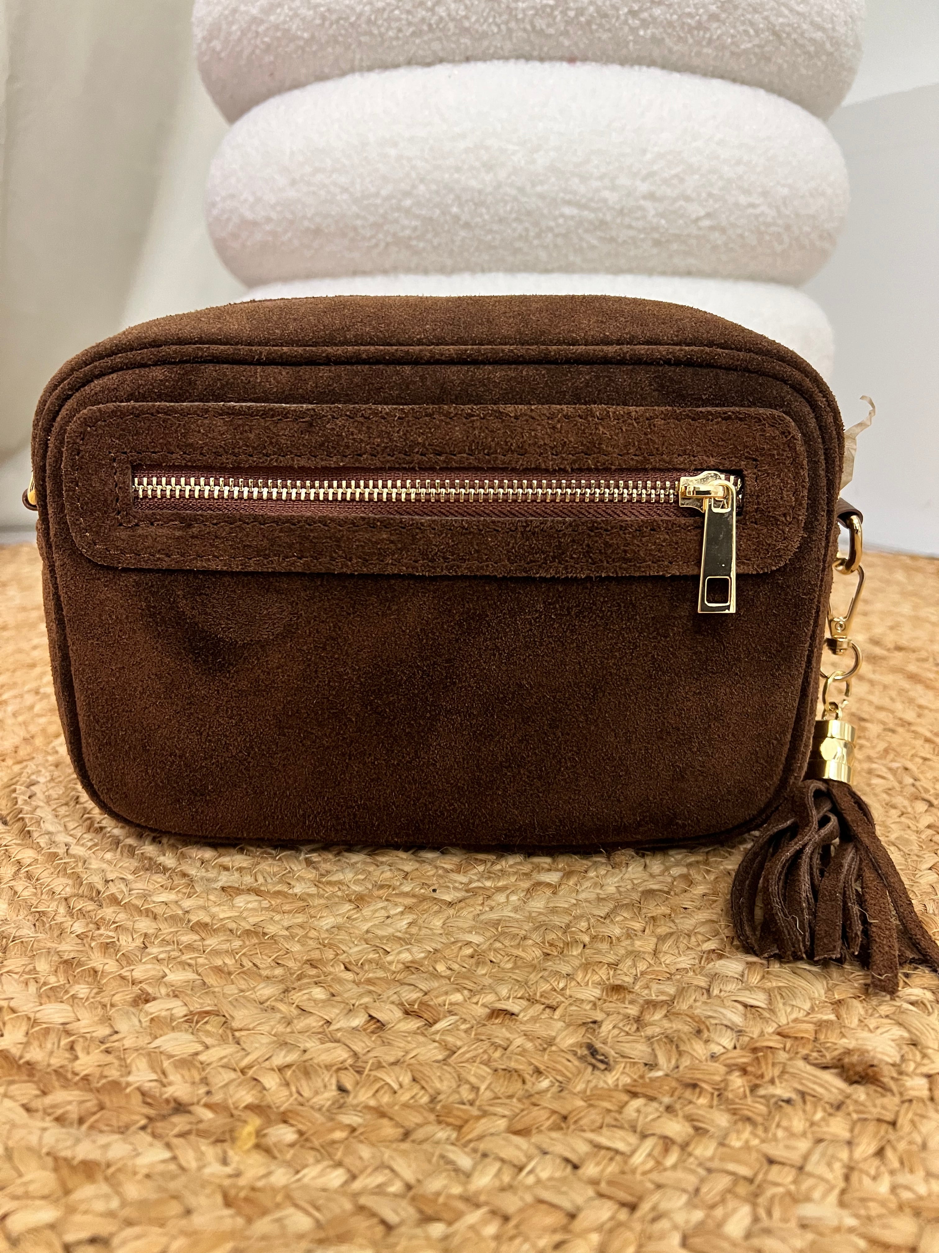 Mooie crossbody tas. De tas heeft een gouden rits aan de bovenkant en een rits aan de voorkant. Bij de tas zit een hengsel waarmee je hem om kan hangen. De tas is suède en 100% leer!