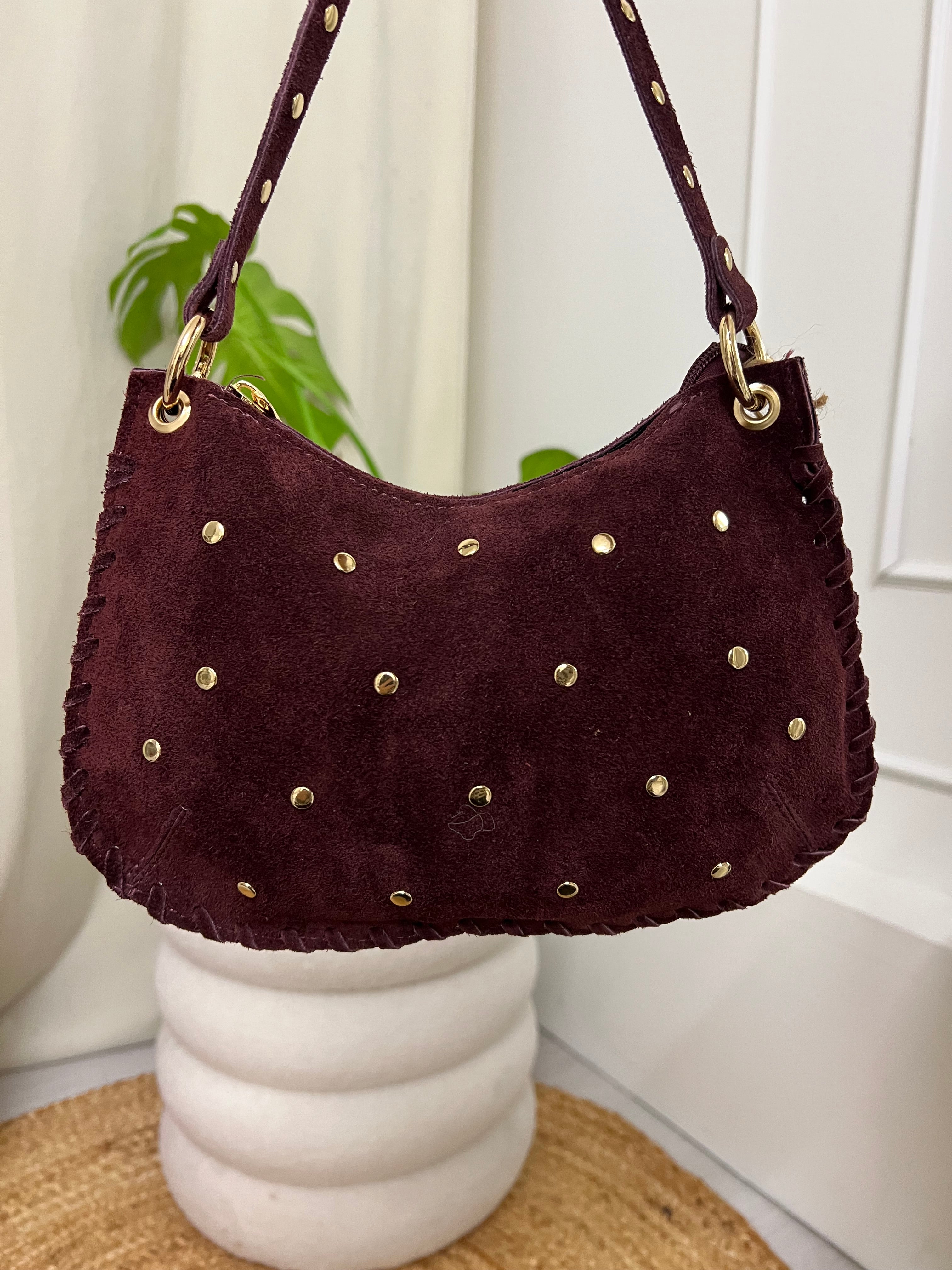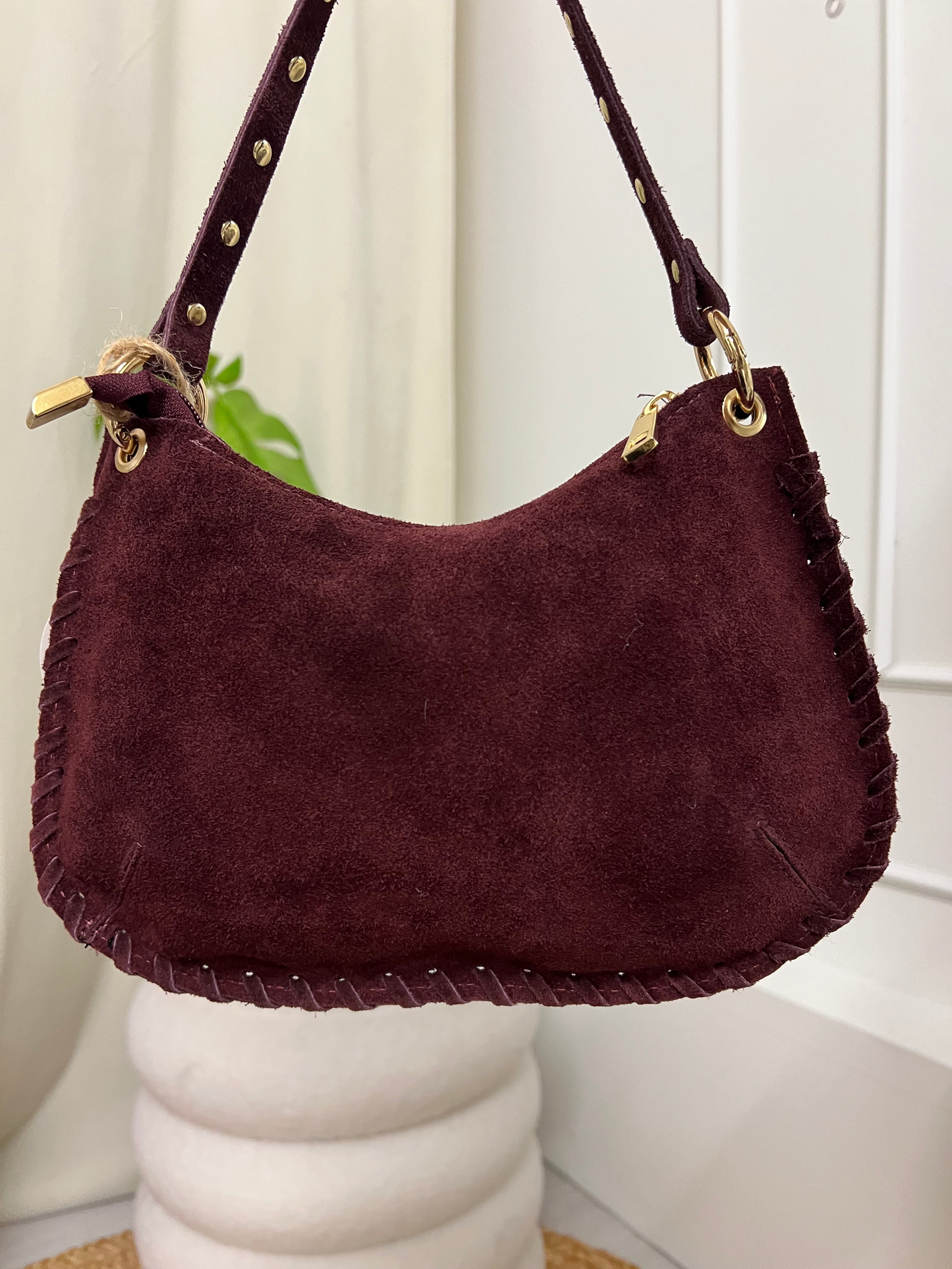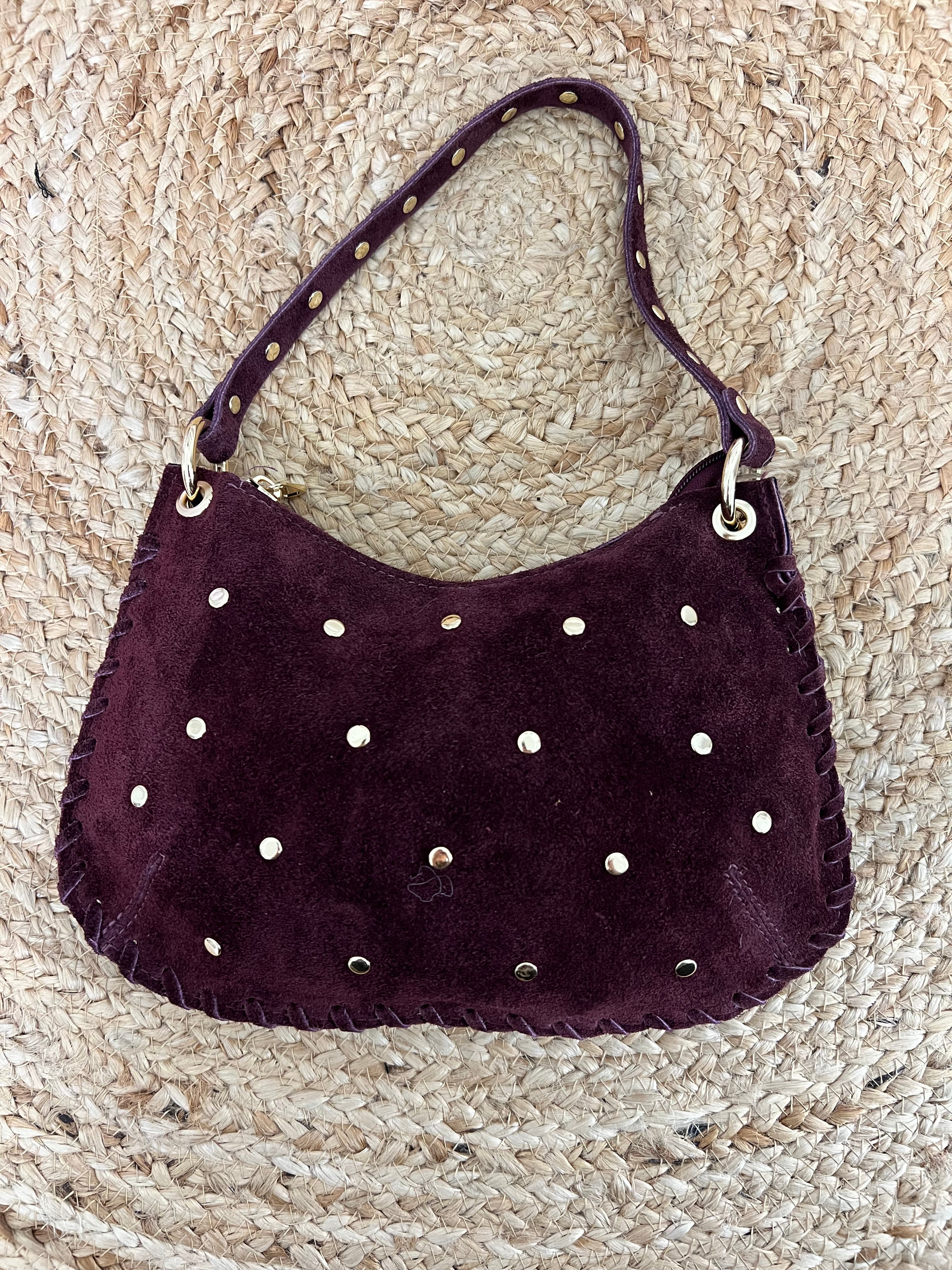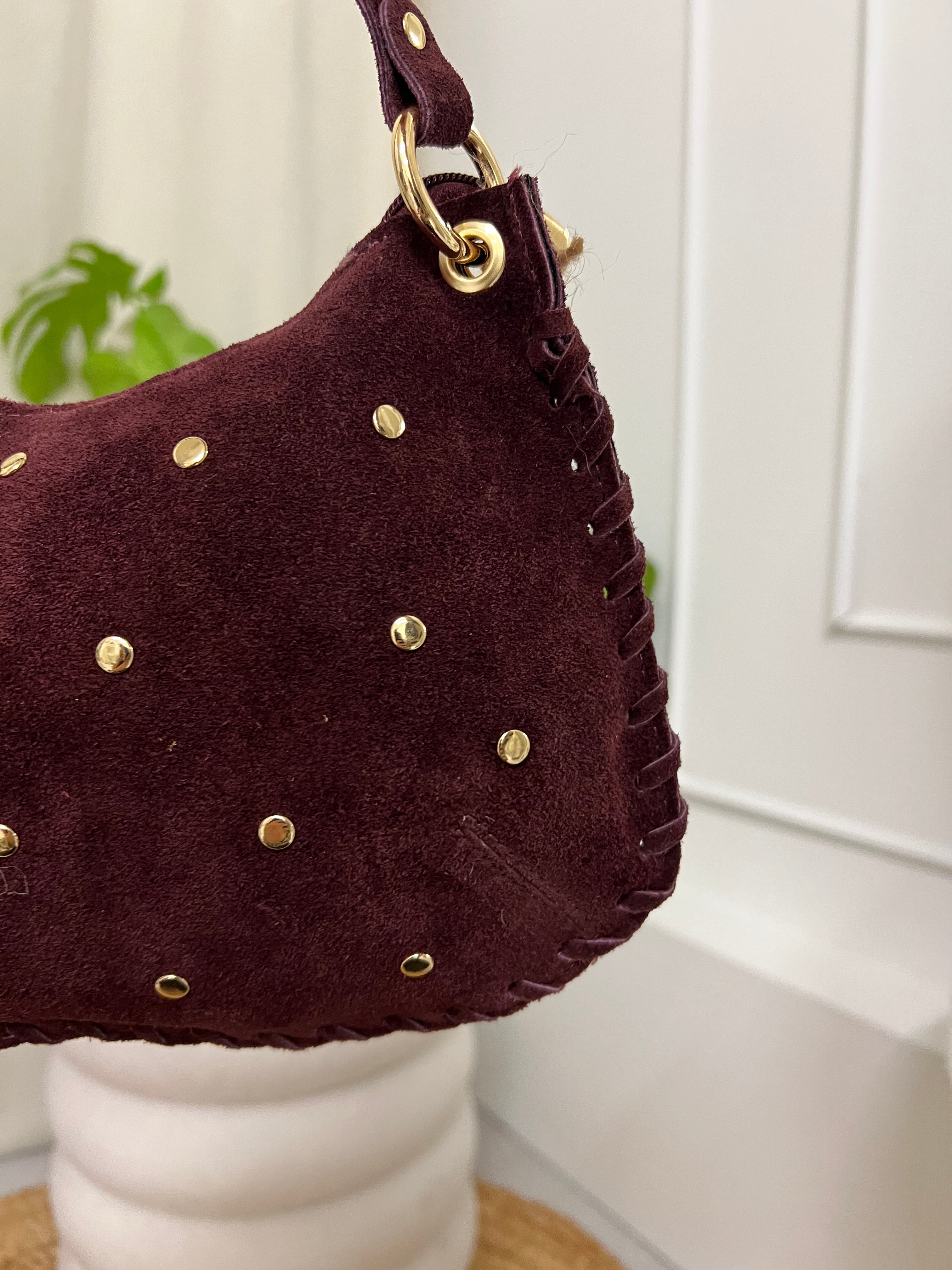 Mooie echt leren tas. De tas heeft een rits aan de bovenkant en studs aan de voorkant. Bij de tas zit een hengsel waarmee je hem om kan hangen. De tas is suède en 100% leer!