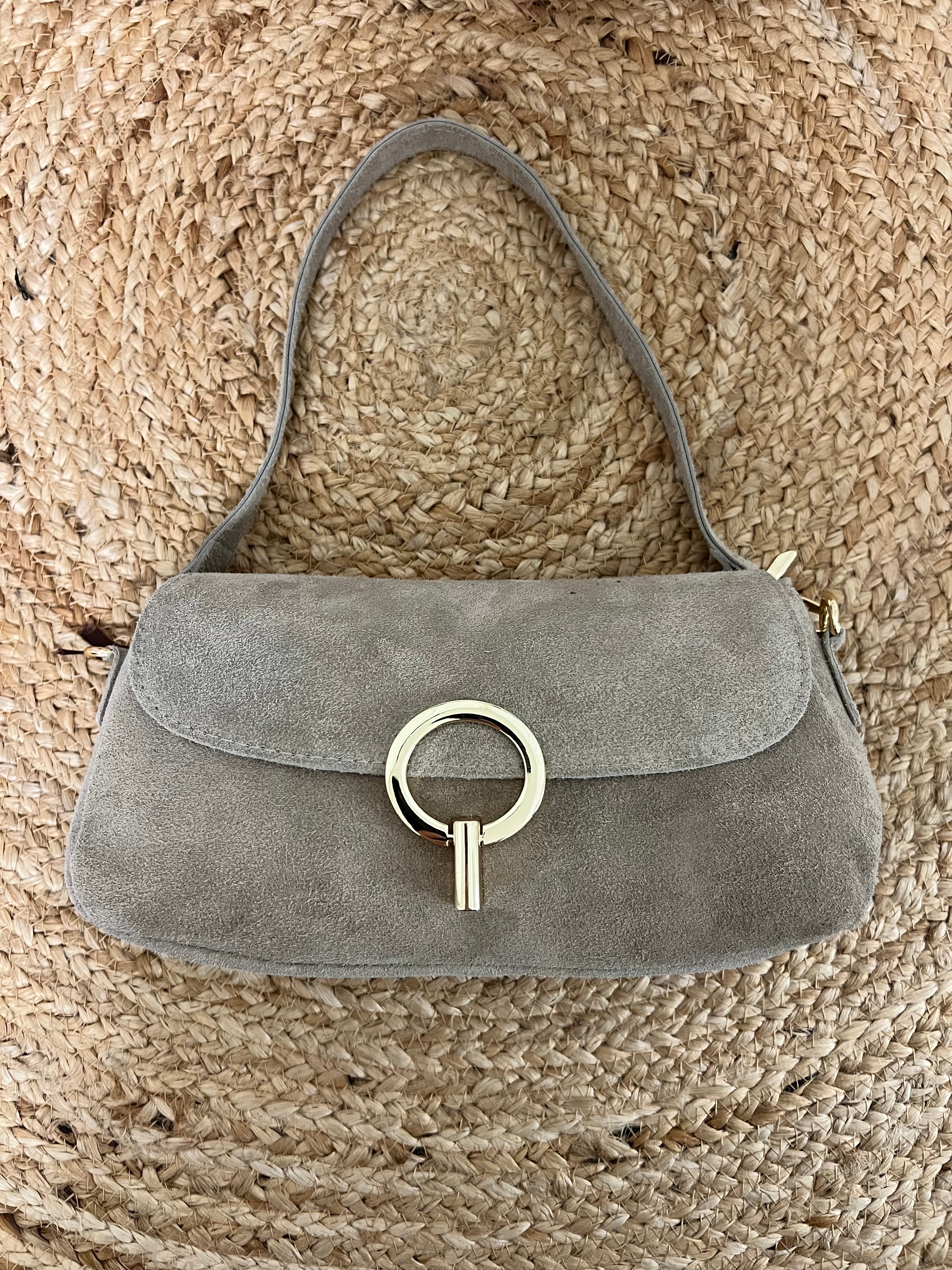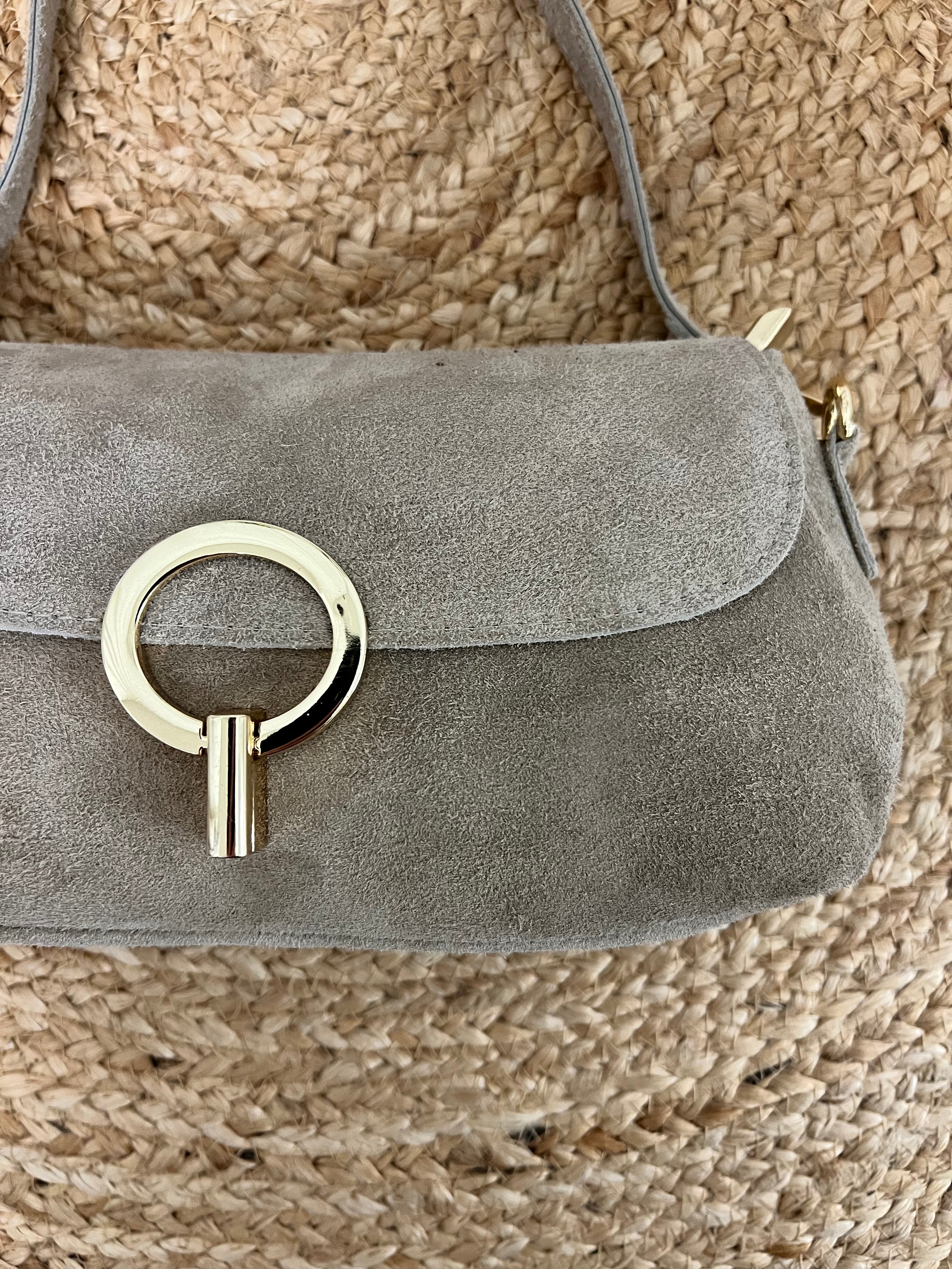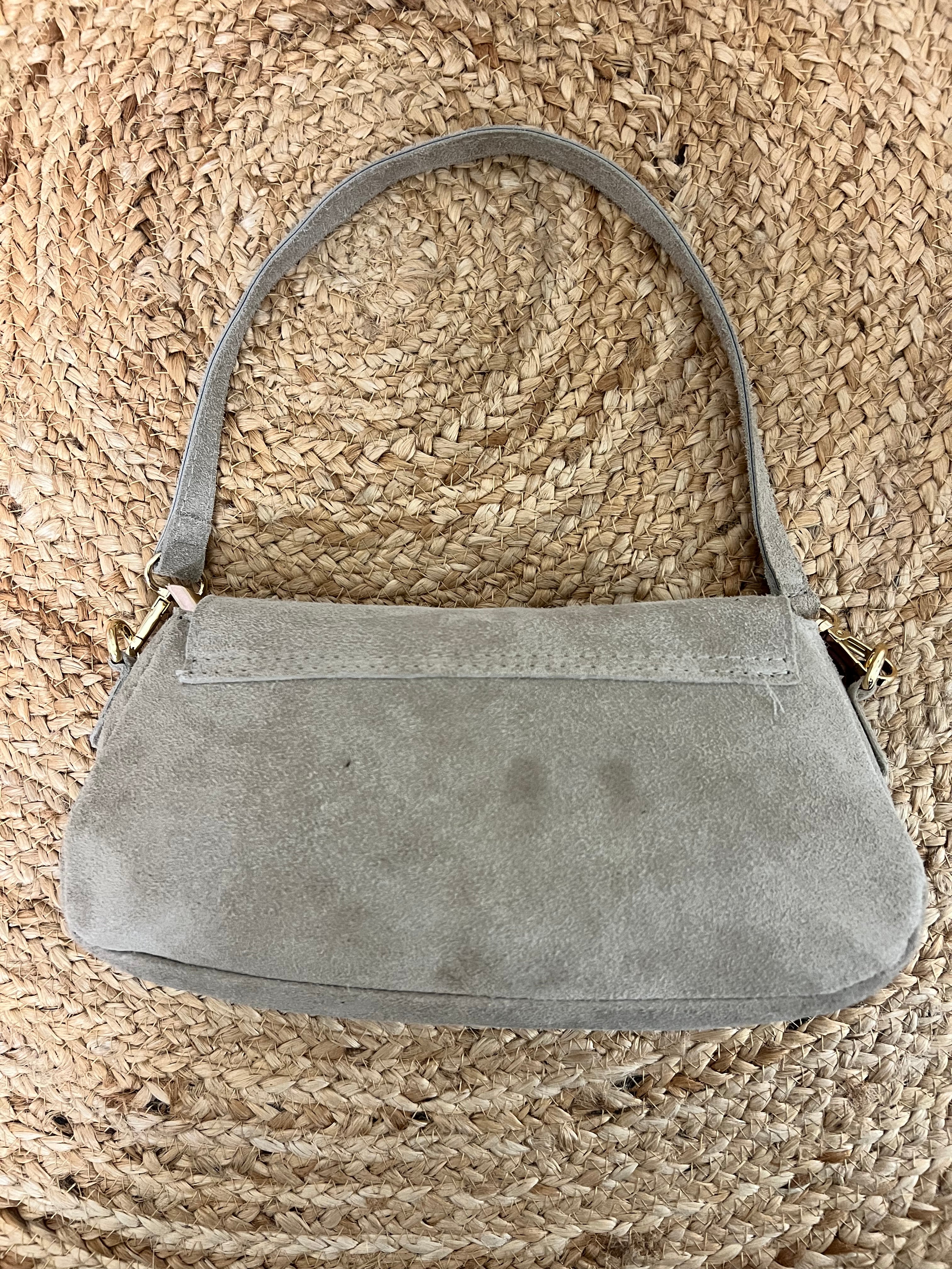 Mooie echt leren tas. De tas heeft een rits aan de binnenkant en een ronde sluiting voorkant. Bij de tas zit een hengsel waarmee je hem om kan hangen. De tas is suède en 100% leer!