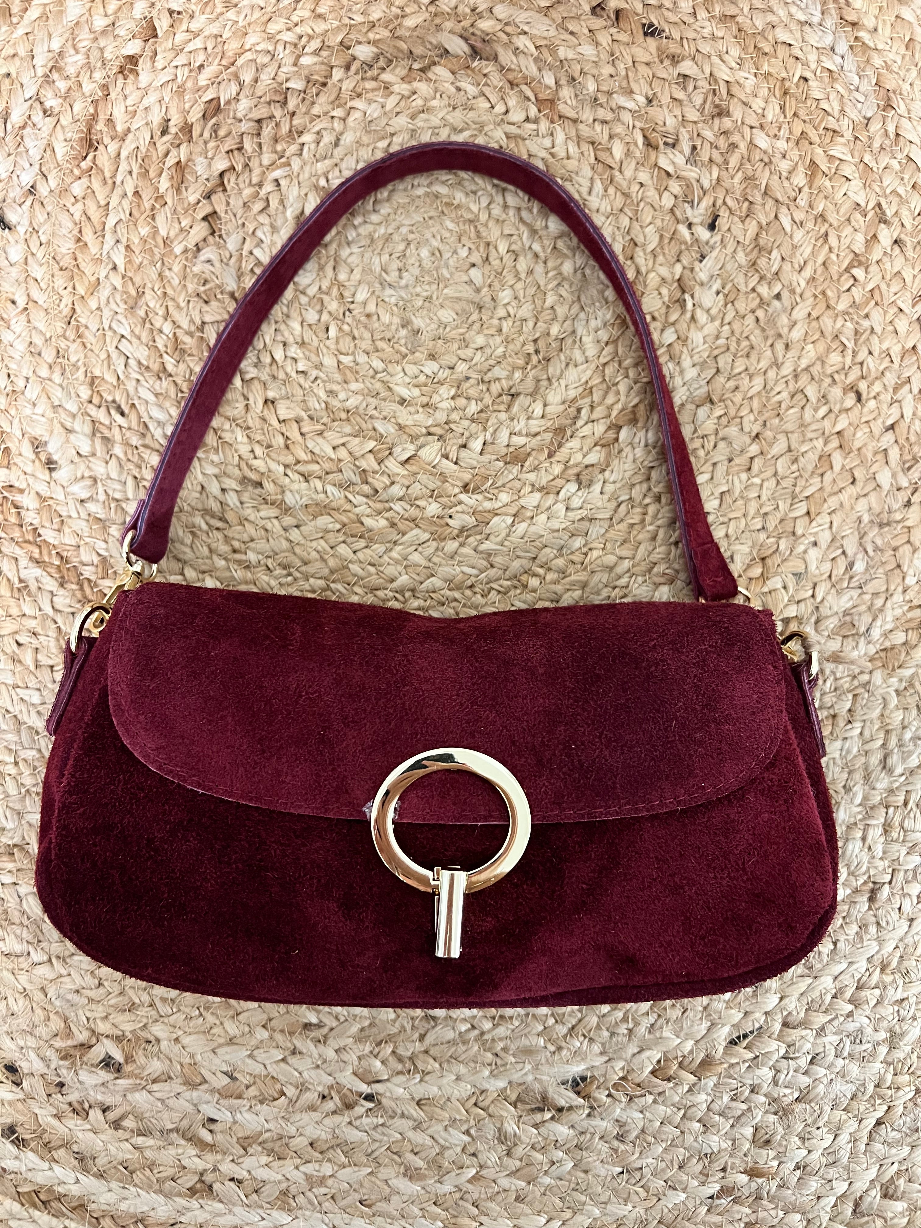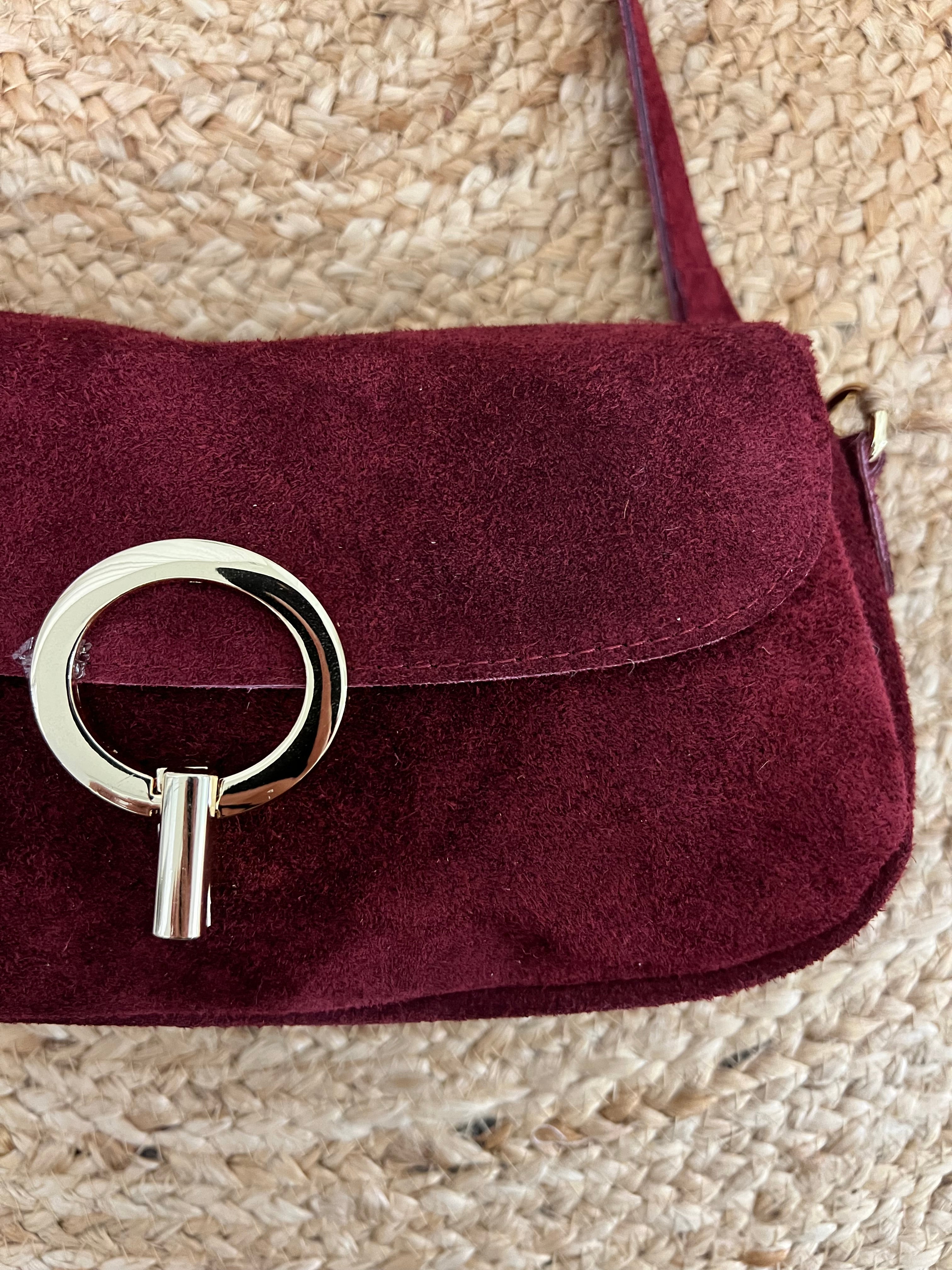 Mooie echt leren tas. De tas heeft een rits aan de binnenkant en een ronde sluiting voorkant. Bij de tas zit een hengsel waarmee je hem om kan hangen. De tas is suède en 100% leer!