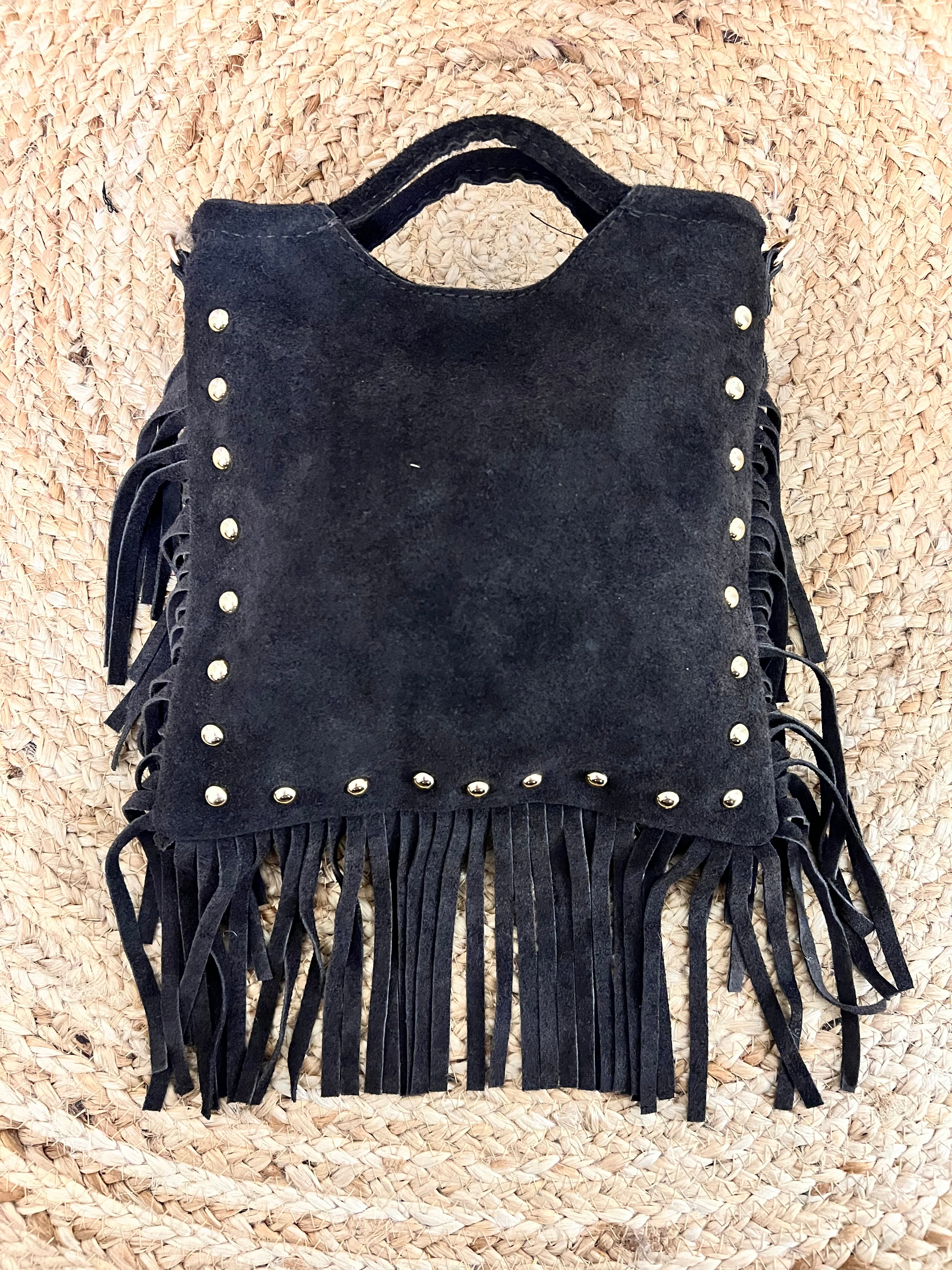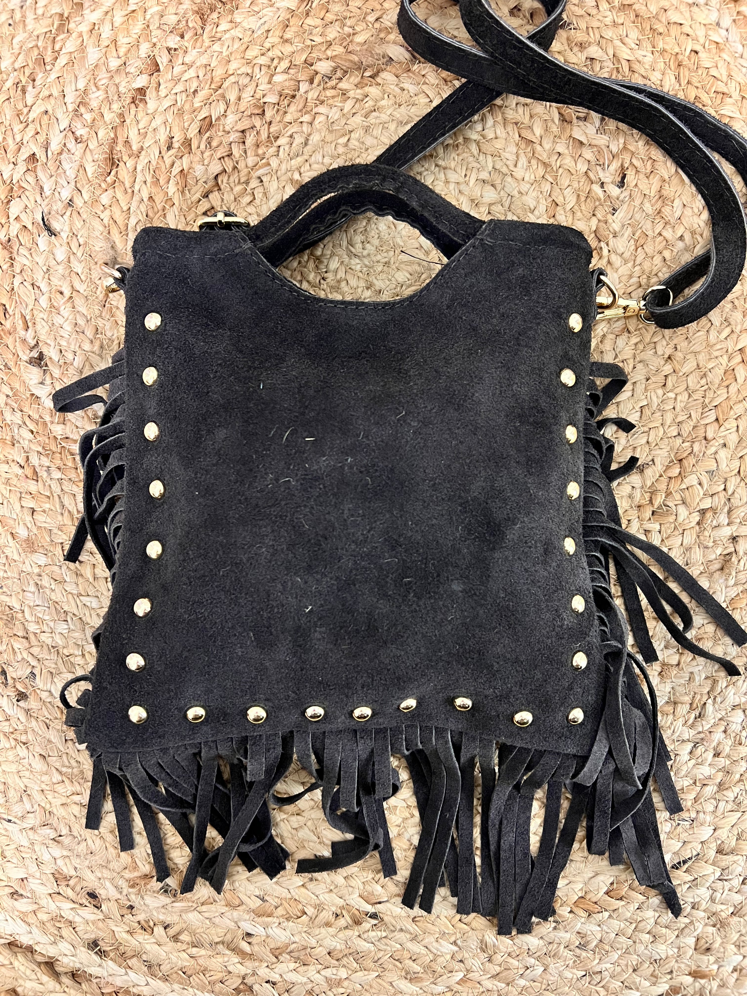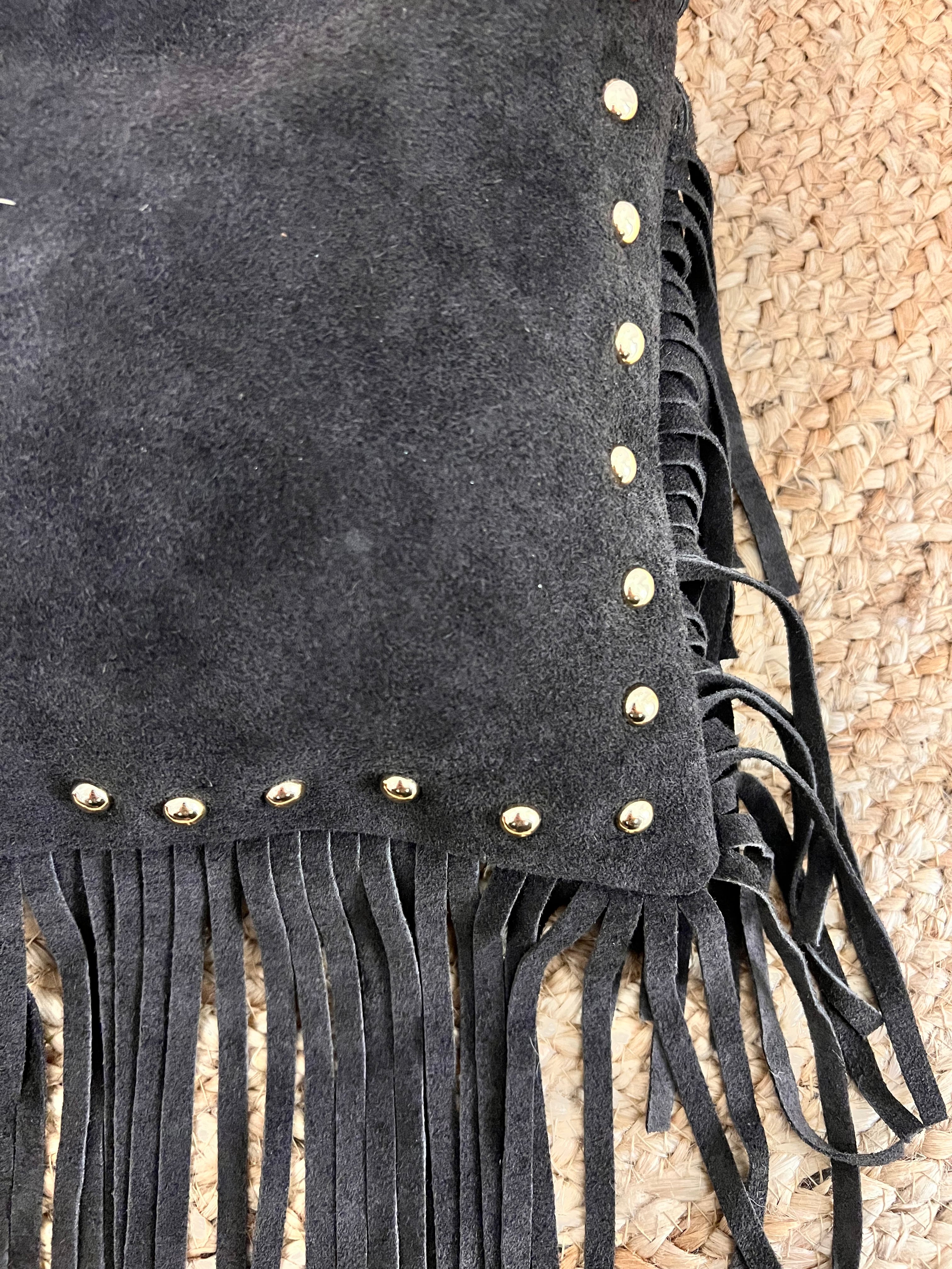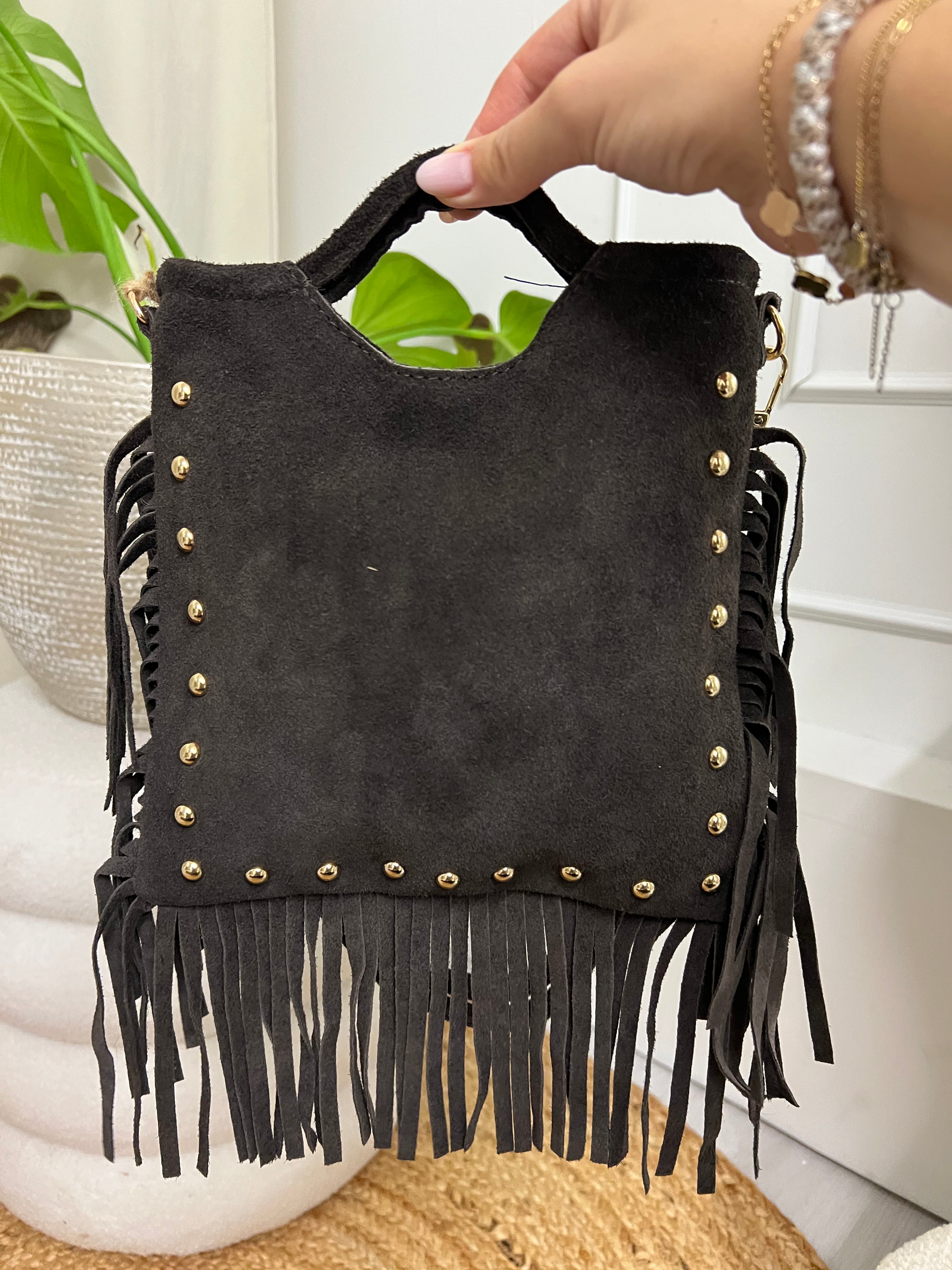 Mooie echt leren tas. De tas heeft een rits aan de bovenkant, studs aan de voorkant en franjes aan de zijkanten. Bij de tas zit een hengsel waarmee je hem om kan hangen. De tas is suède en 100% leer!