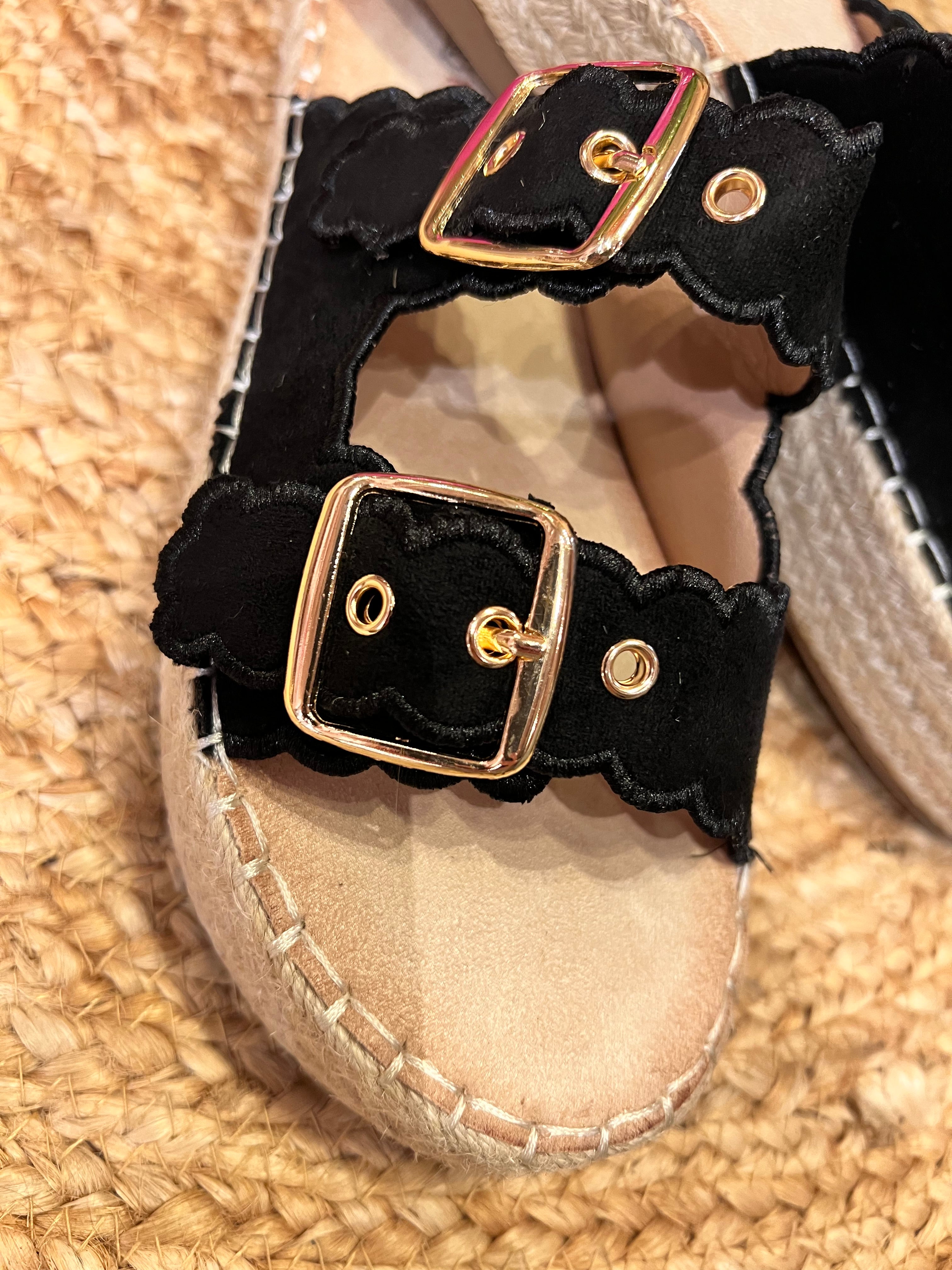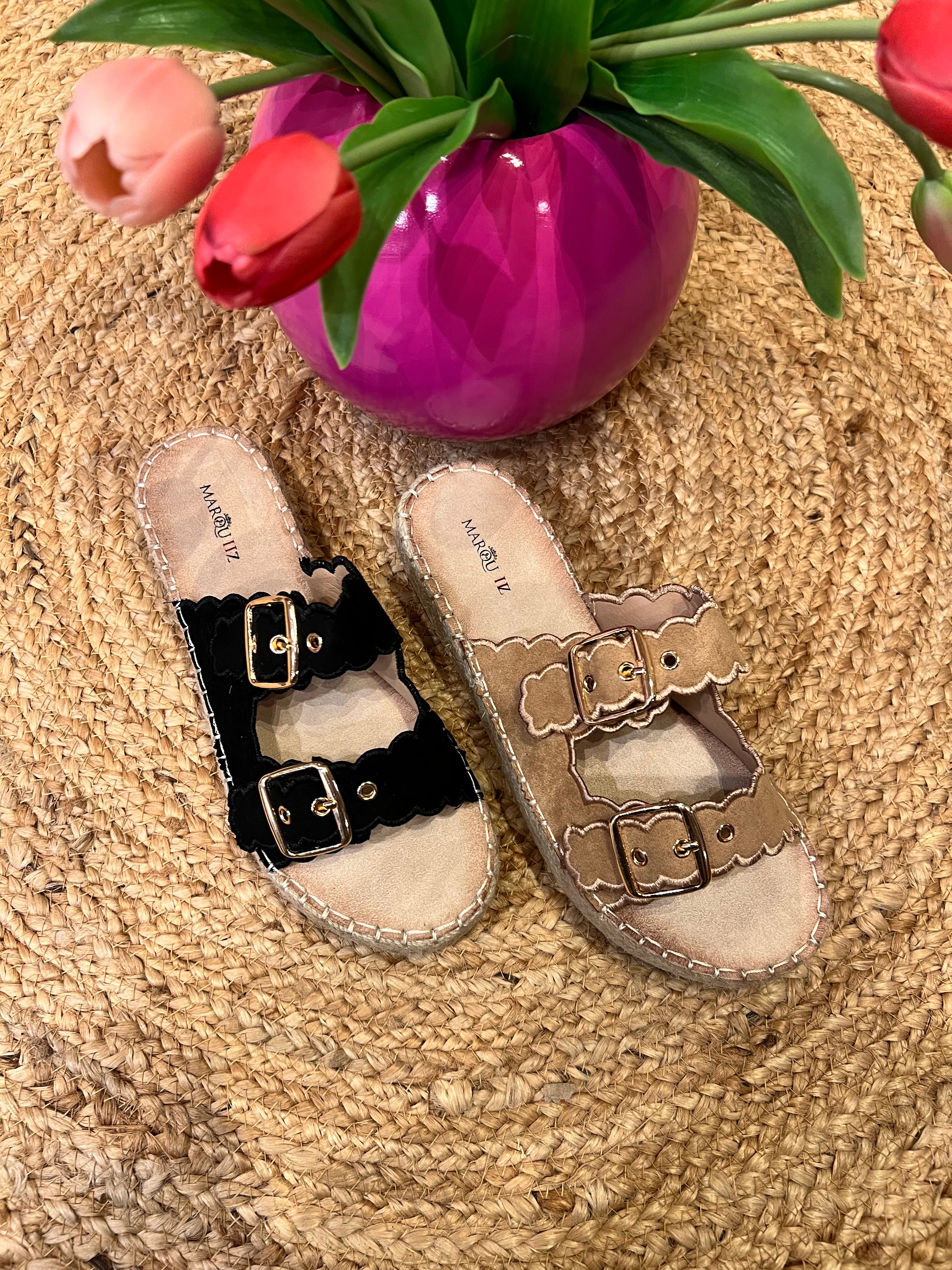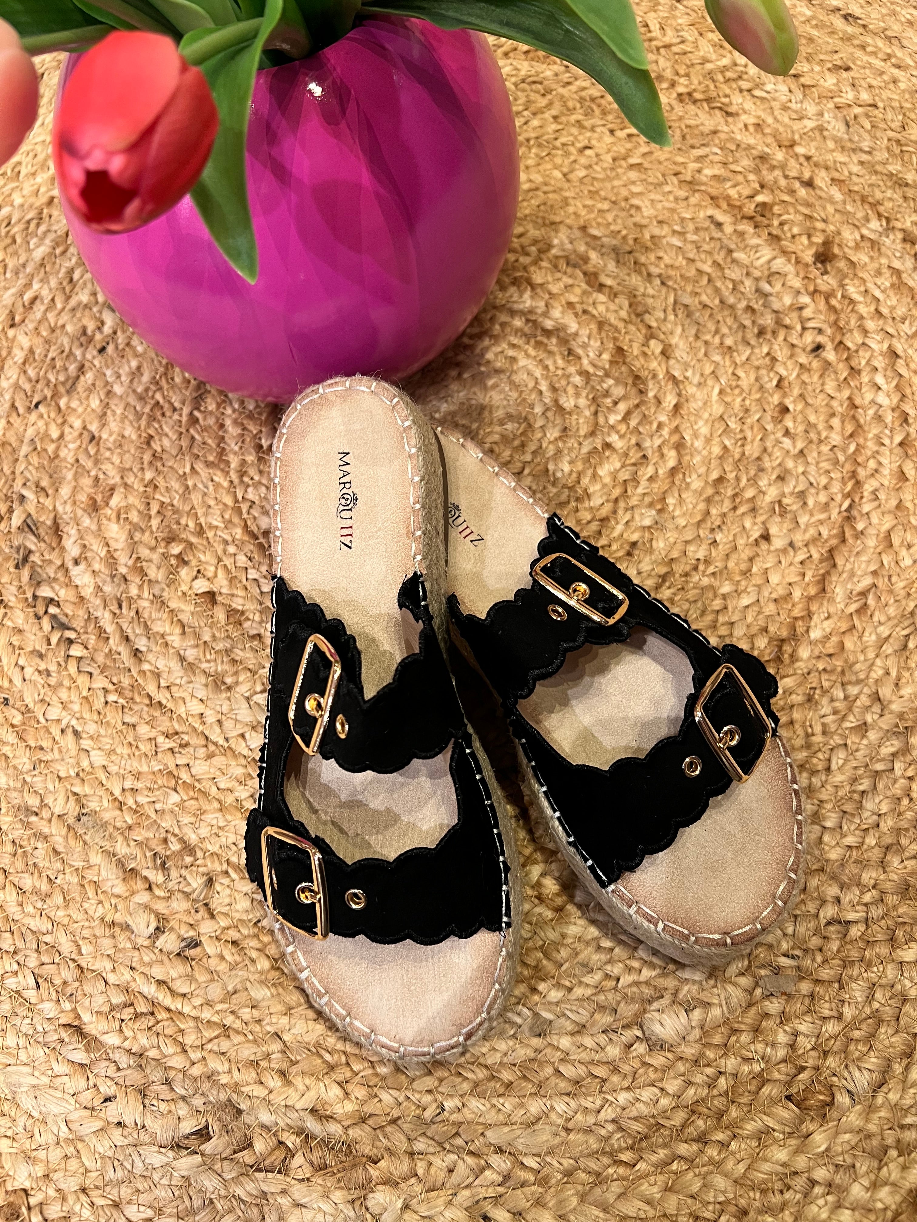 Leuke slippers met 2 bandjes die sluiten met grote gouden verstelbare gespen. De slippers hebben een golvende rand. Het voetbed is heerlijk zacht en de zool is iets dikker, waardoor je comfortabel op de slippers kunt lopen. Ook verkrijgbaar in camel.