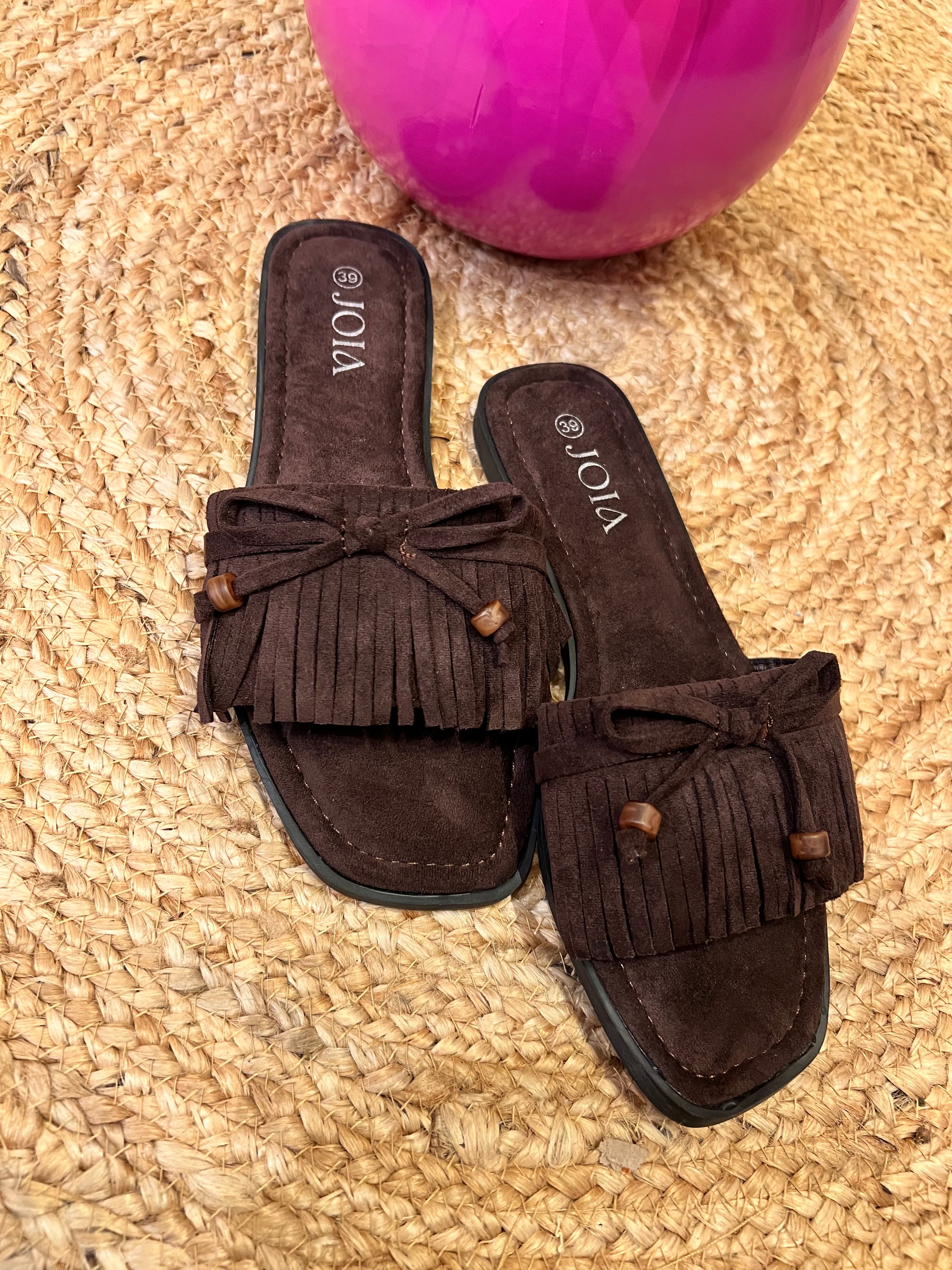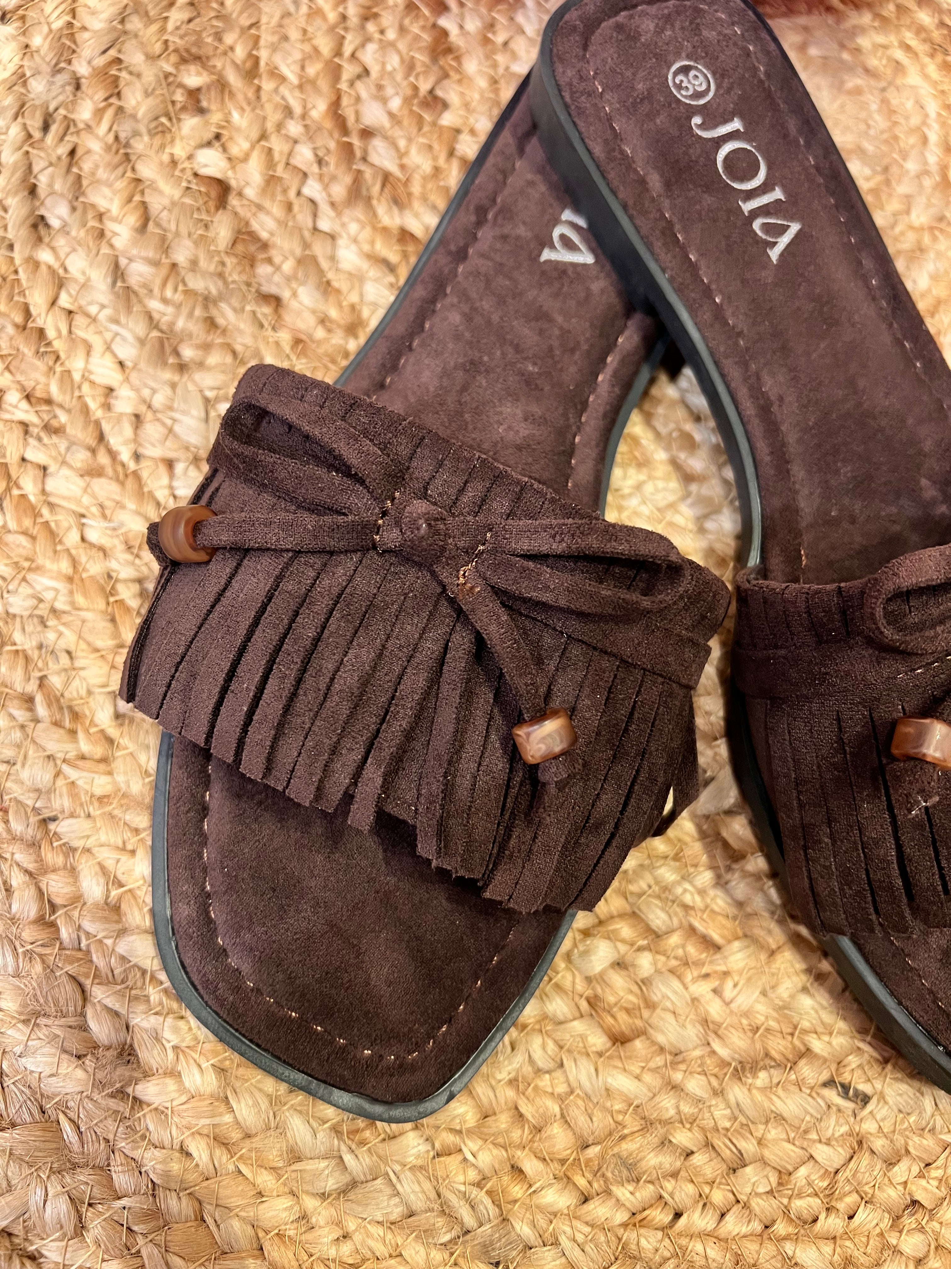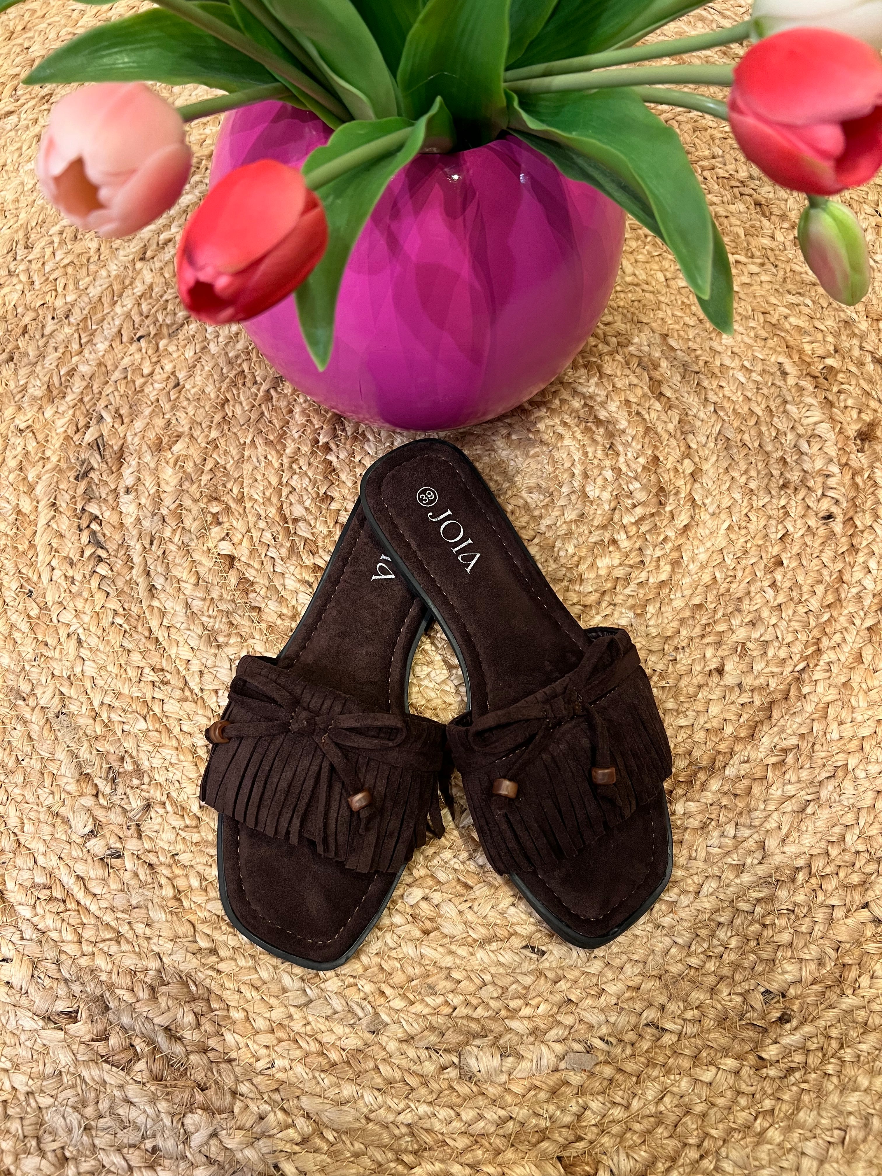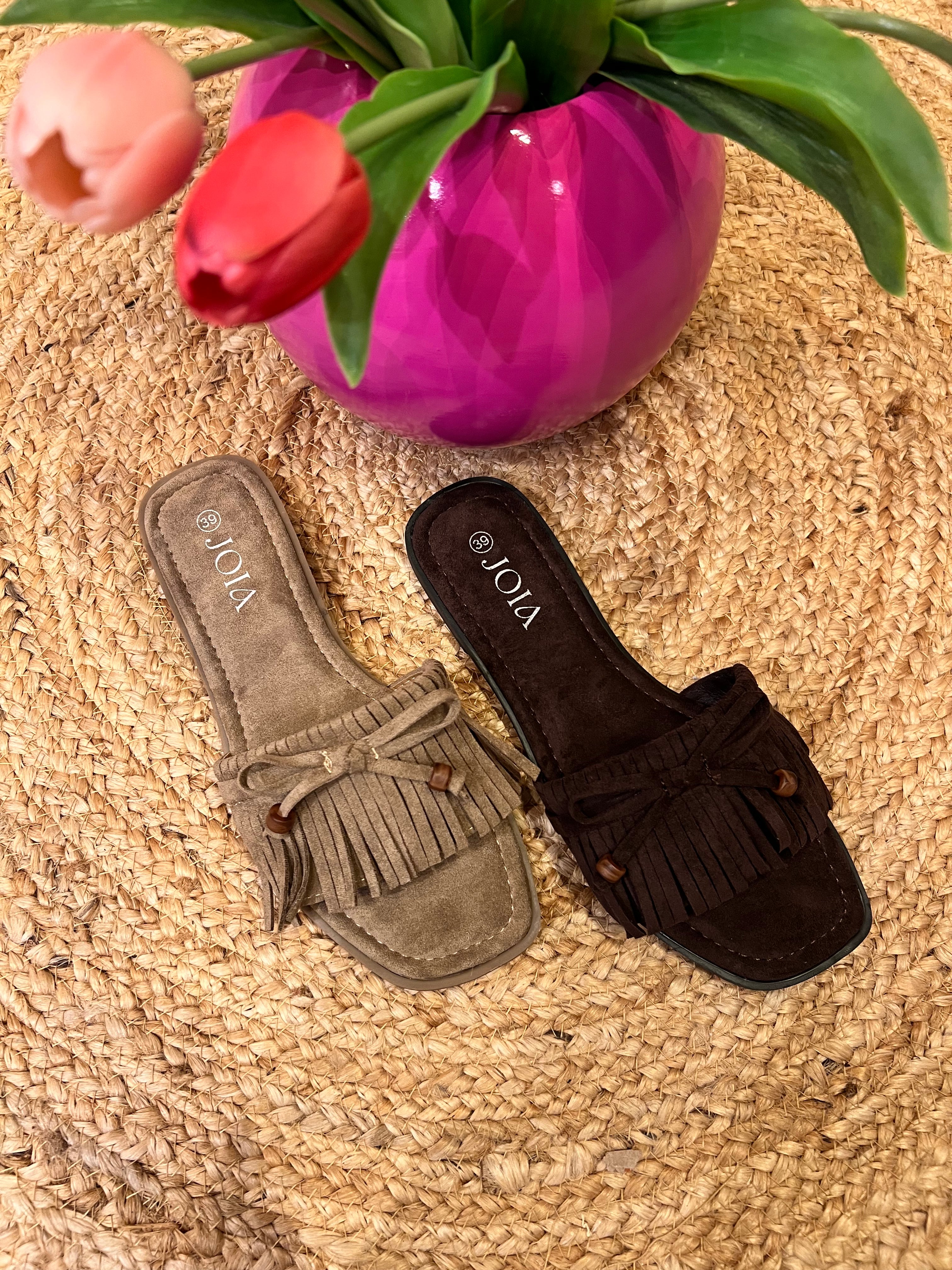 Schattige slippers met 1 breder bandje afgewerkt met franjes en een strikje met een kraaltje aan het uiteinde. Het voetbed is heerlijk zacht. Ook verkrijgbaar in taupe.