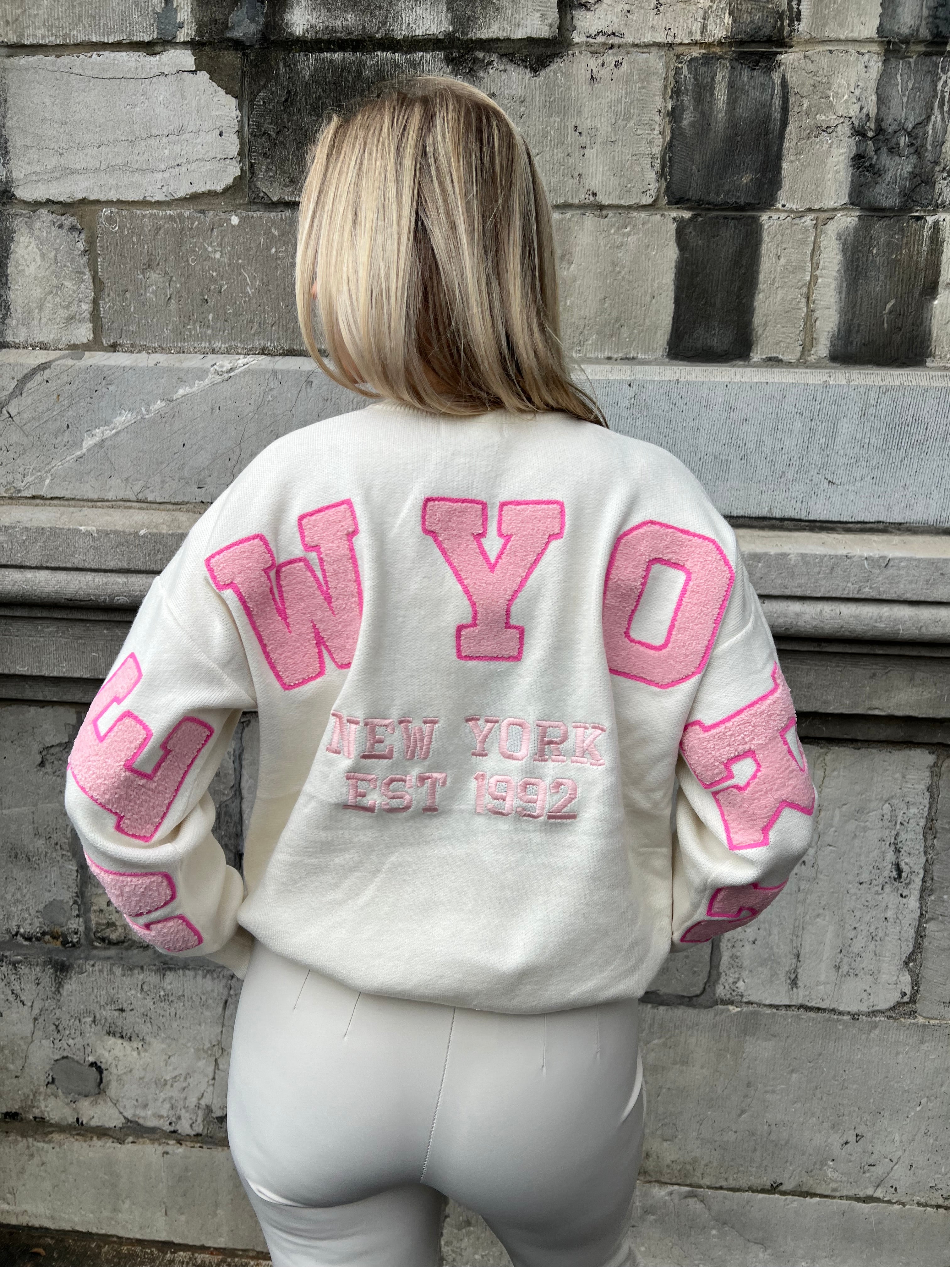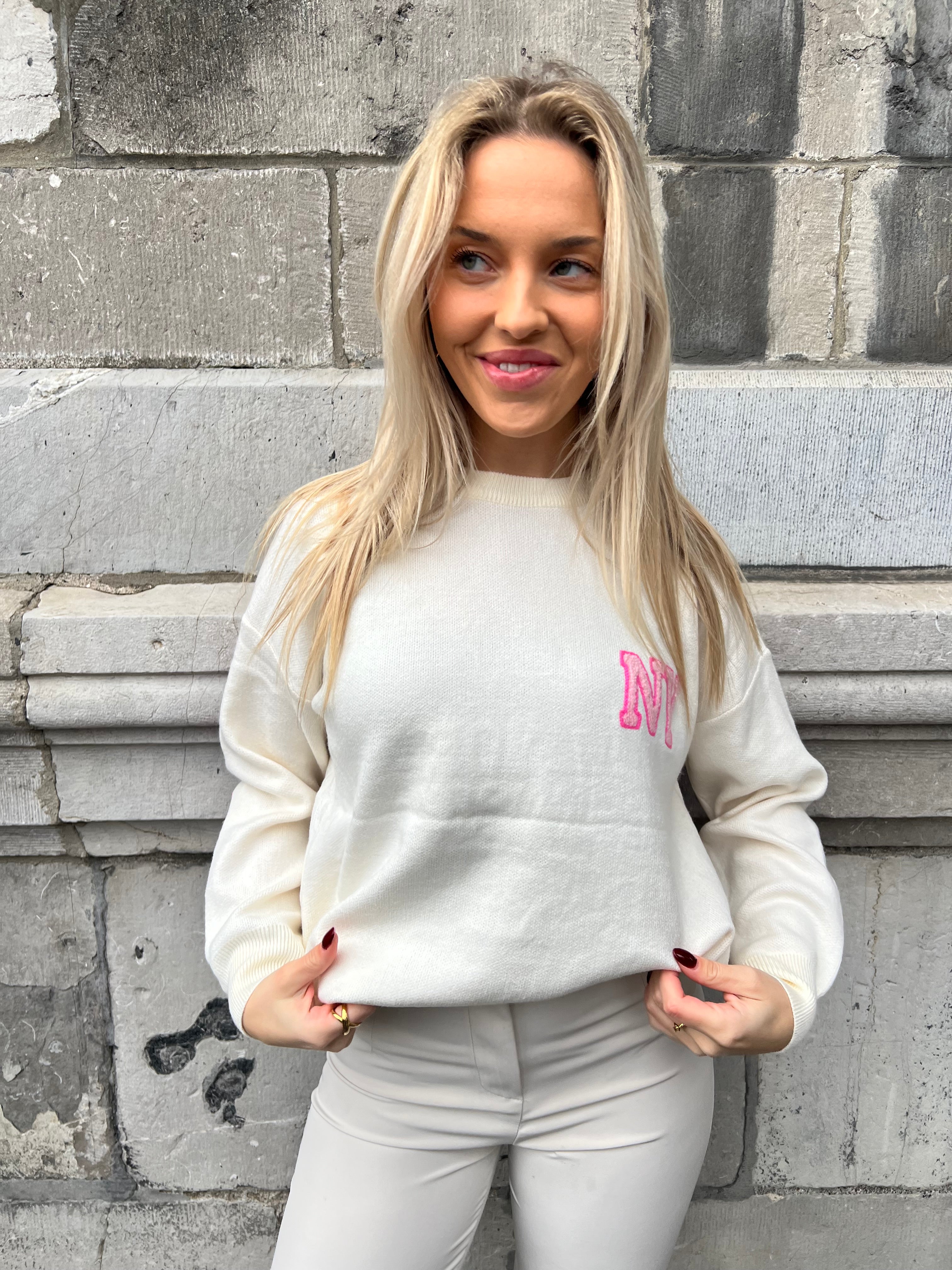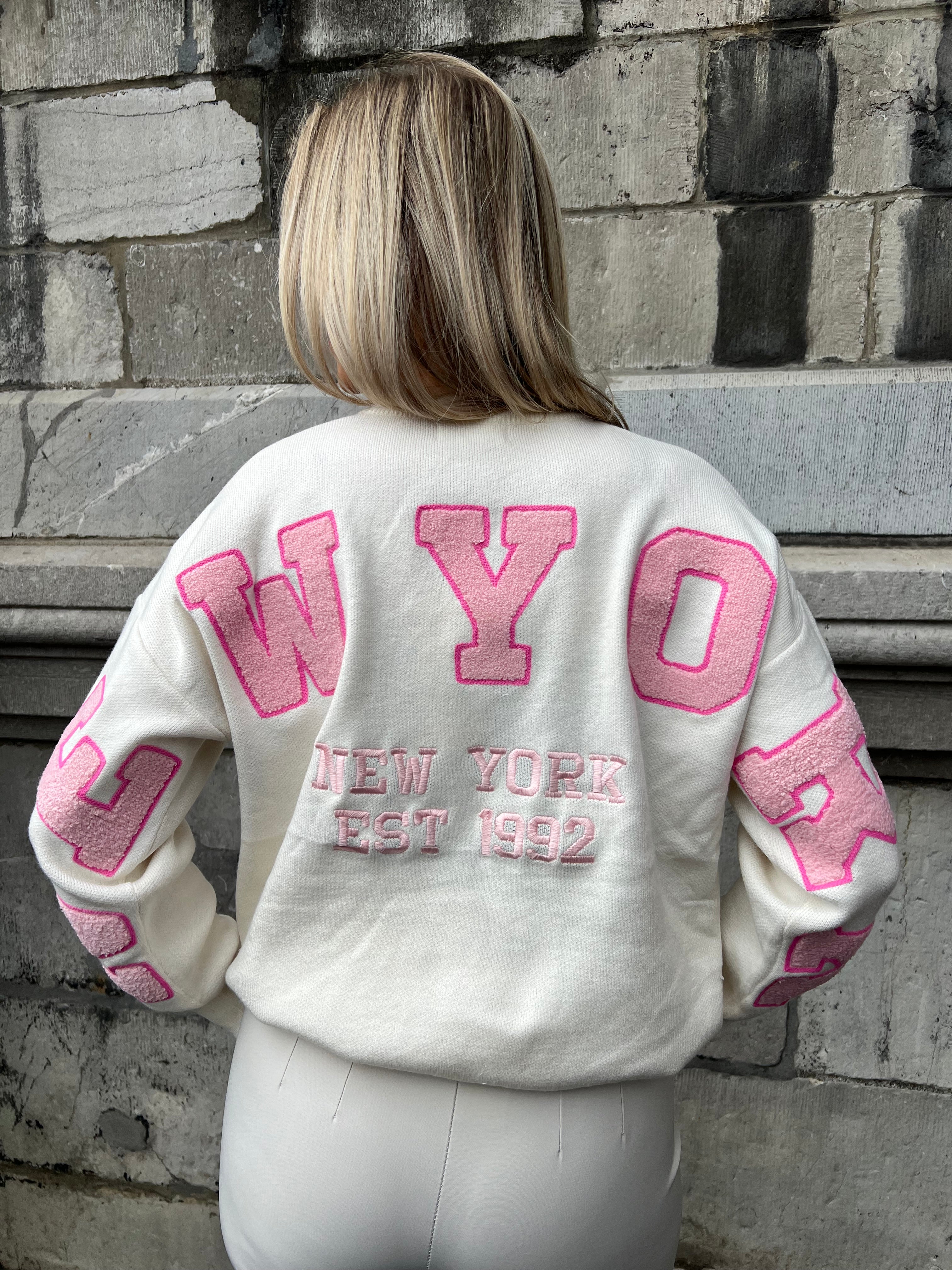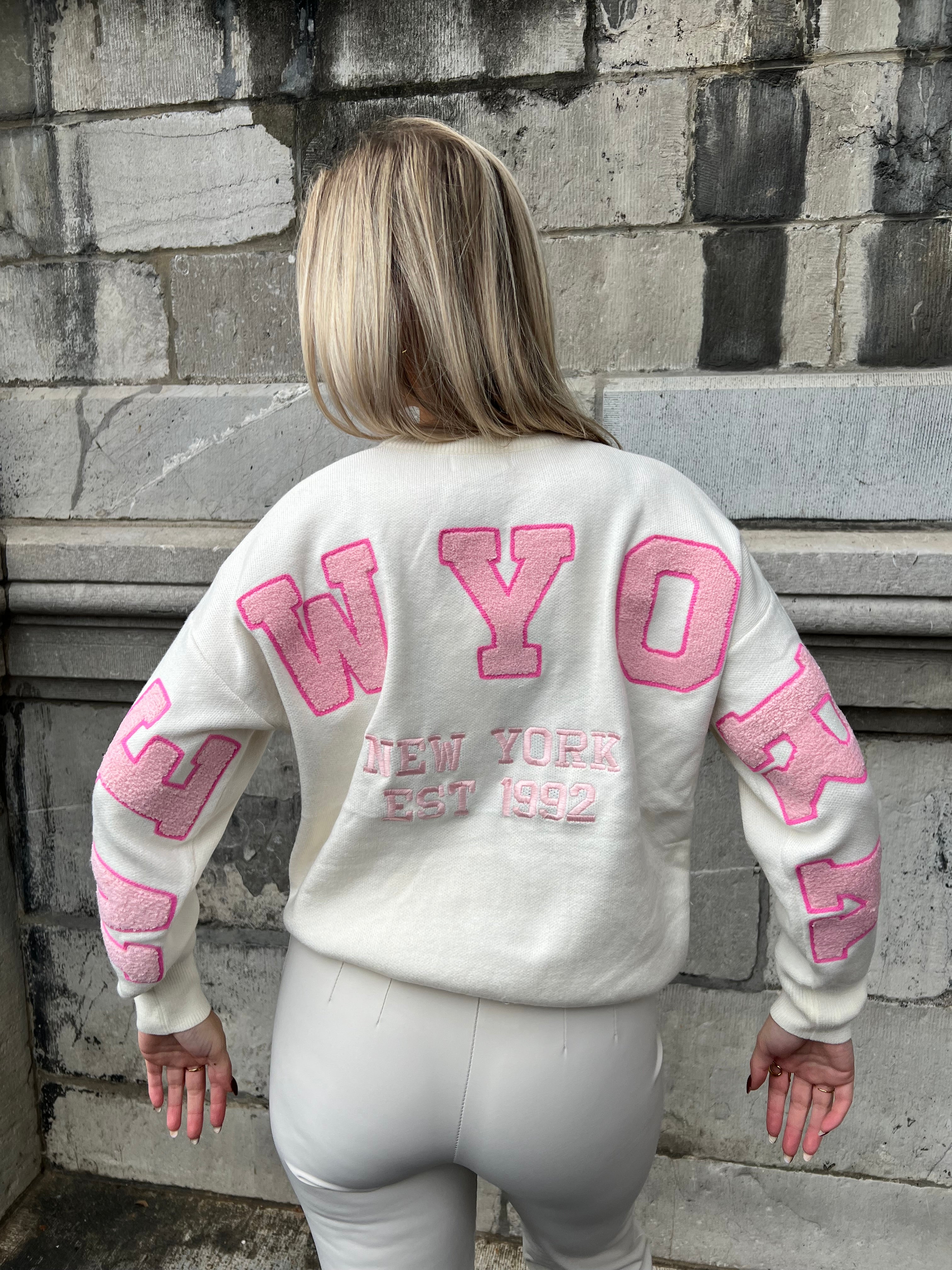 Zachte trui met op het achterpand en mouwen 'NEW YORK". Op het voorpand staat klein "NY". De letters zijn licht roze met een smal randje feller roze.