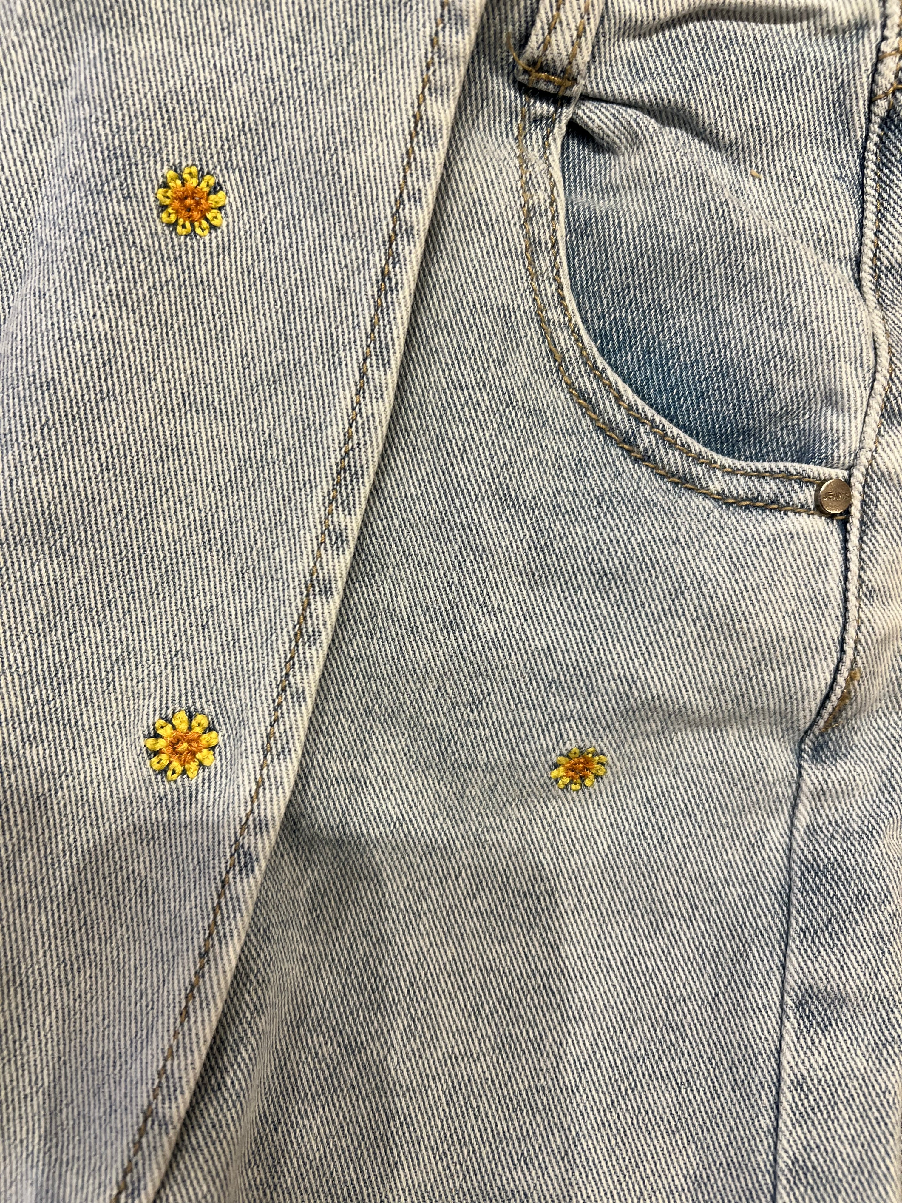 Deze skort heeft kleine geel/oranje bloemetjes op de voorpanden. De skort heeft 2 zakken op zowel voor- als achterpand. De skort zit heerlijk comfy omdat er elasthaan in zit.
