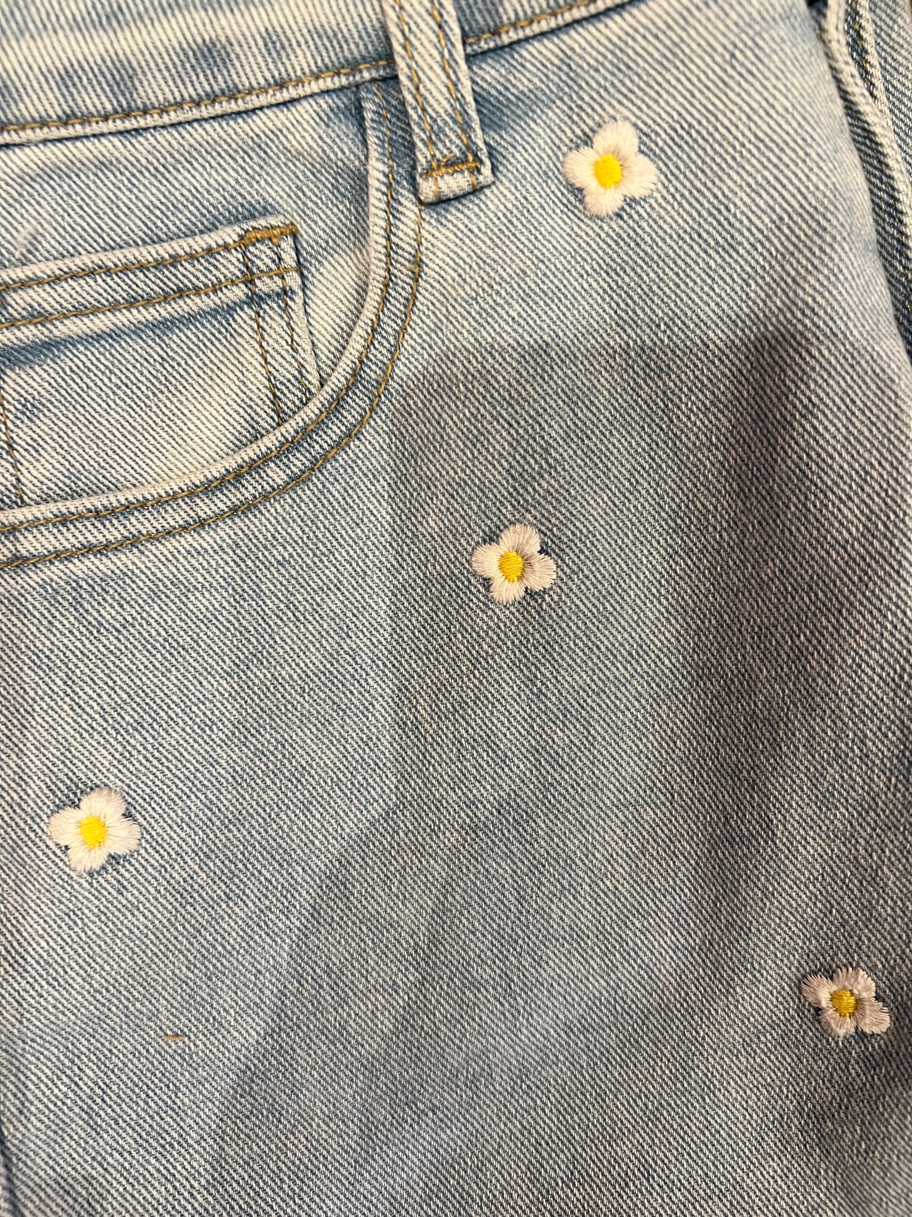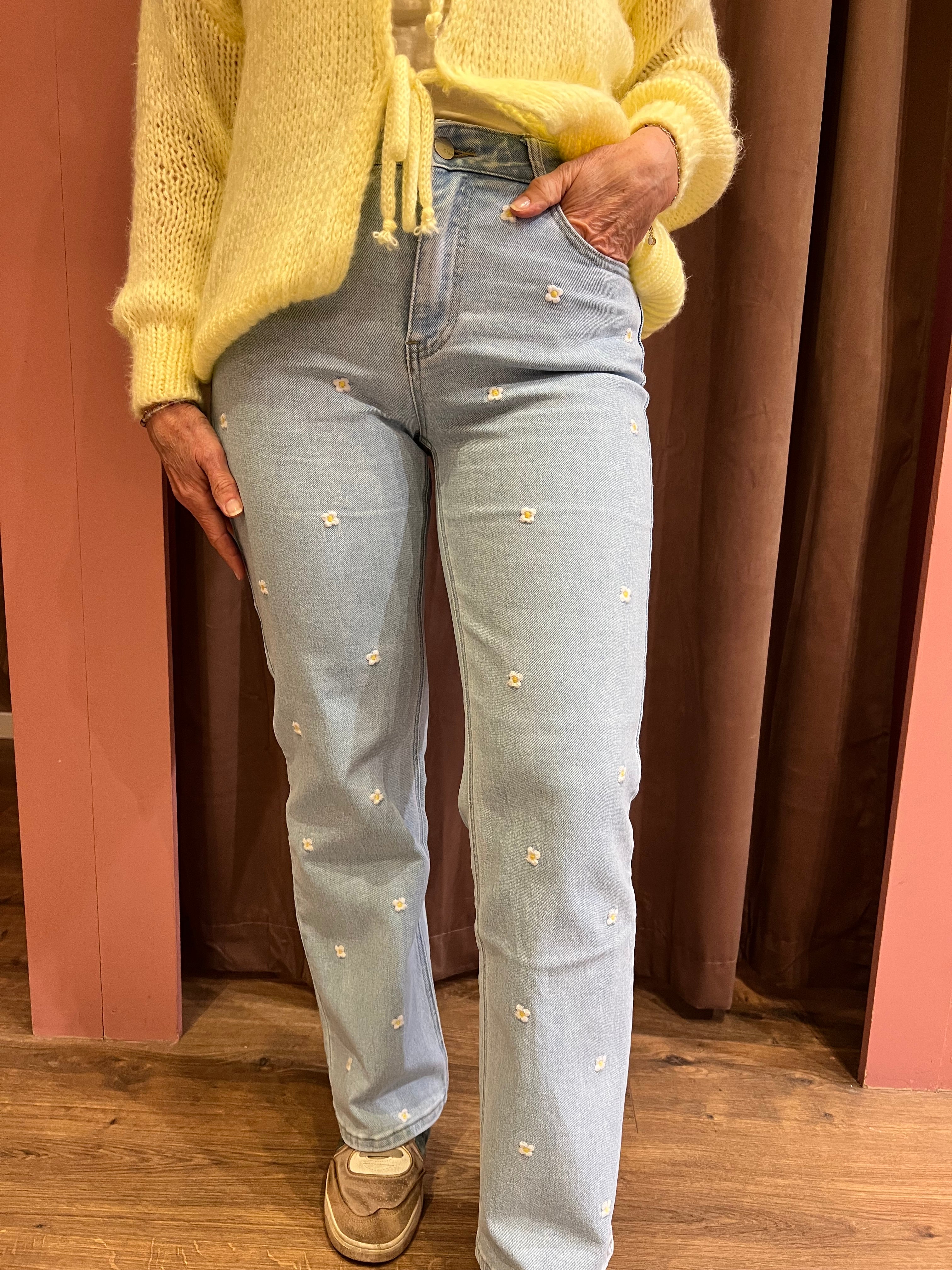 Deze straight jeans heeft kleine wit/gele bloemetjes op de voorpanden. In de jeans zit stretch zodat deze heerlijk comfy zit.