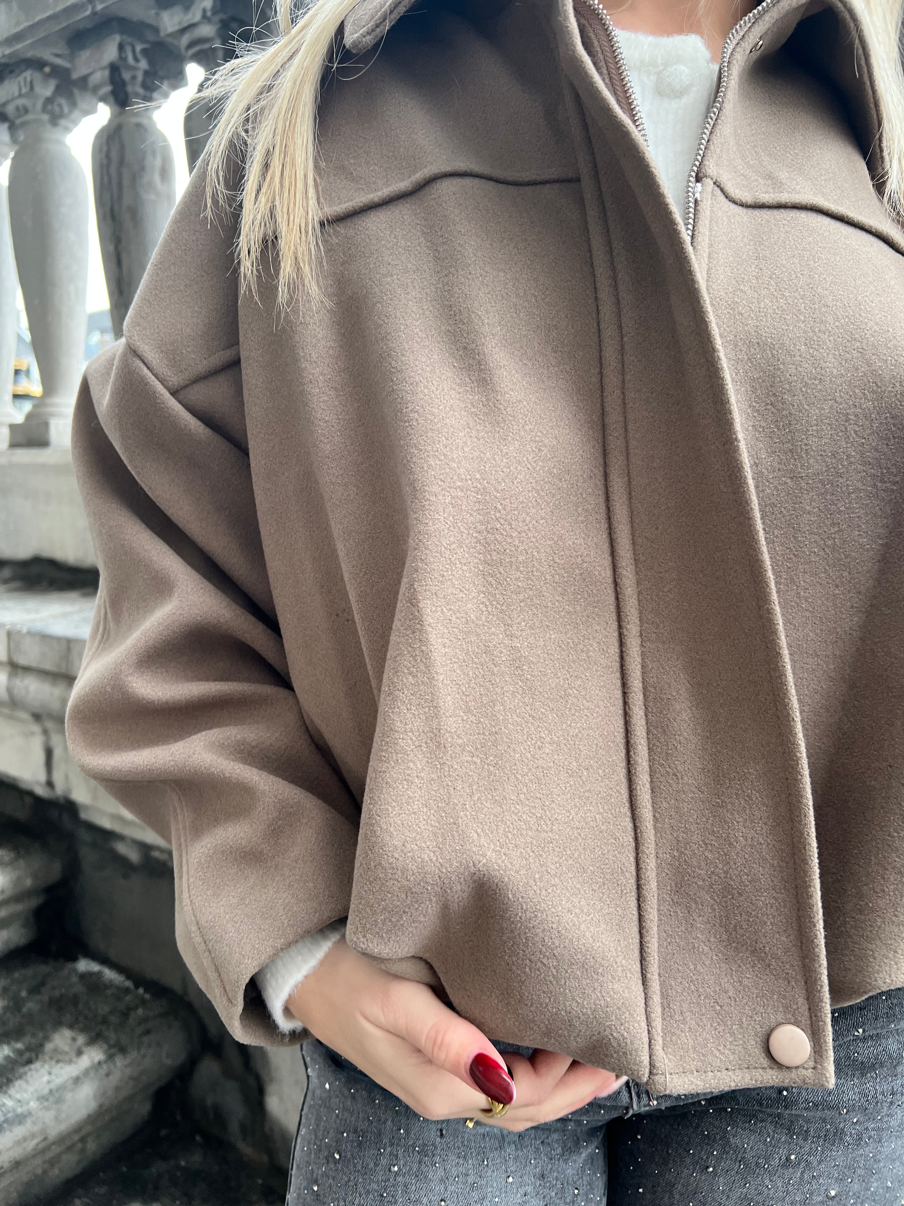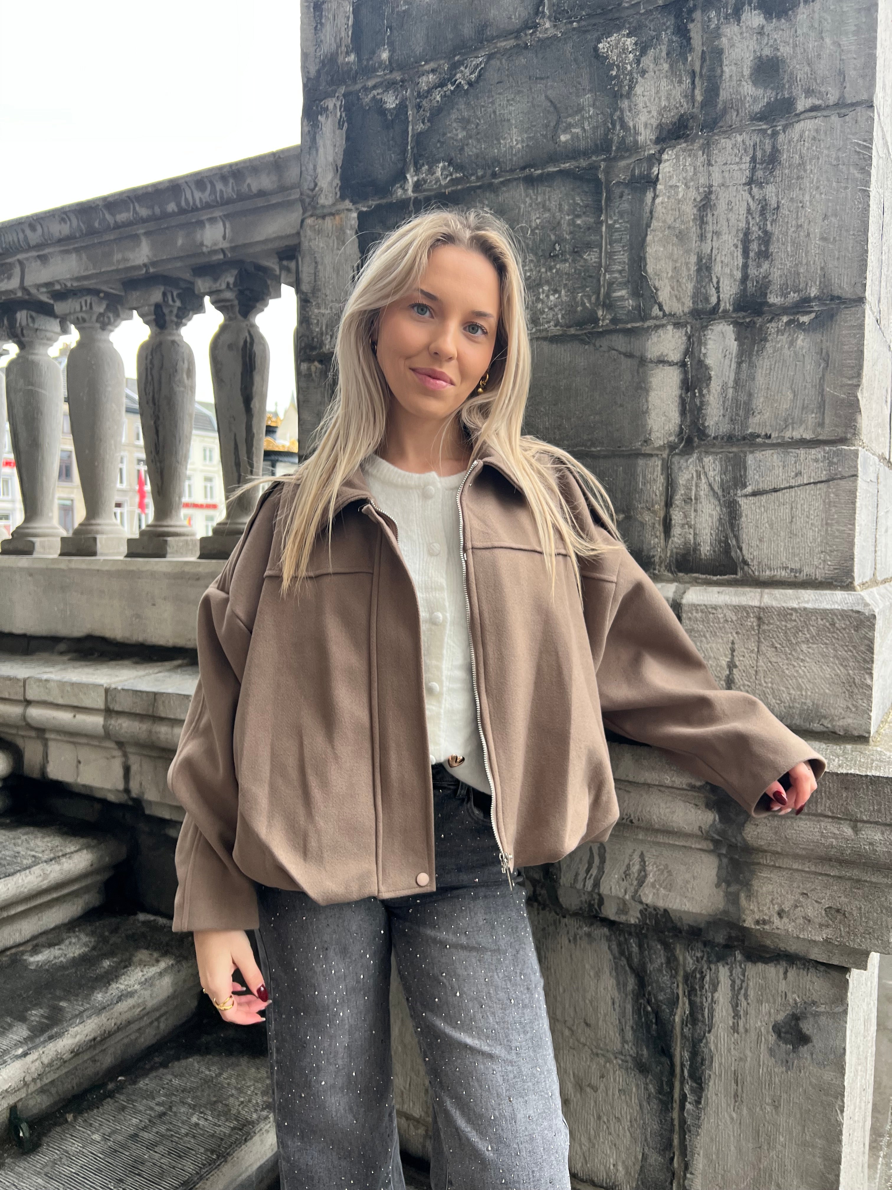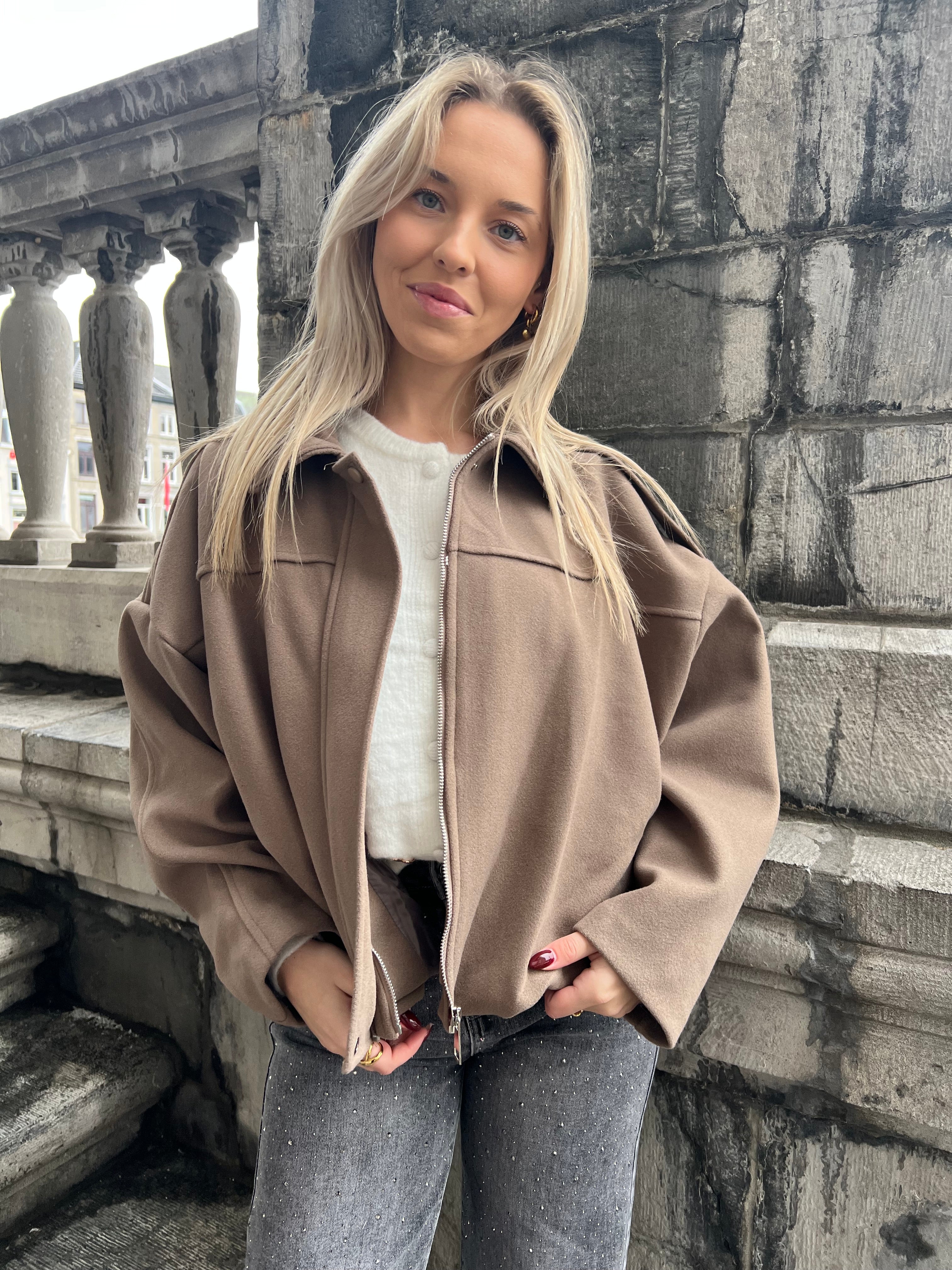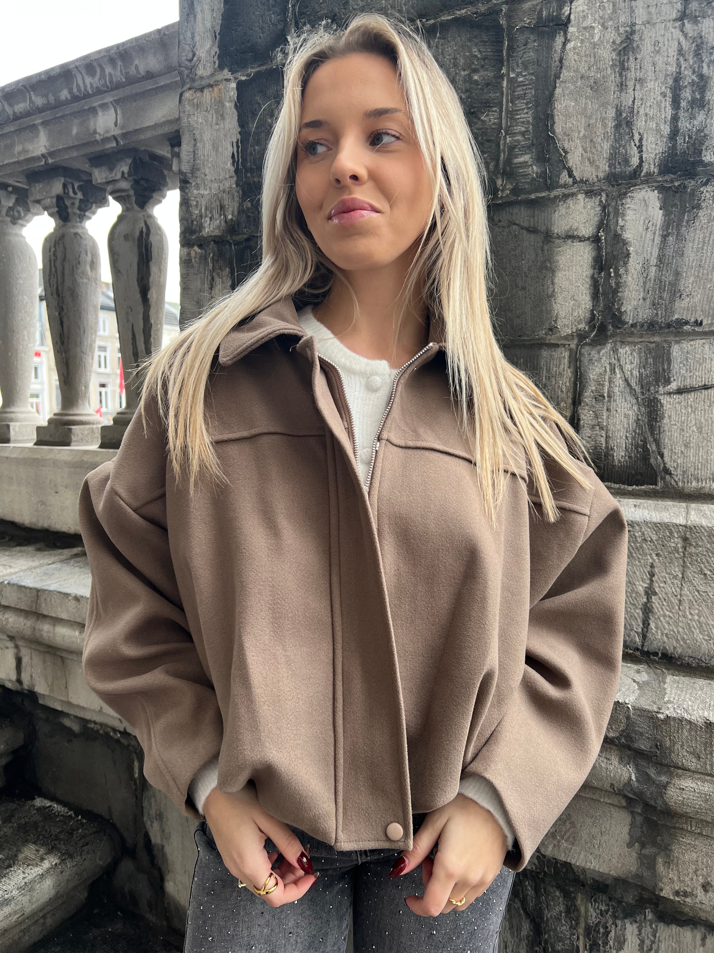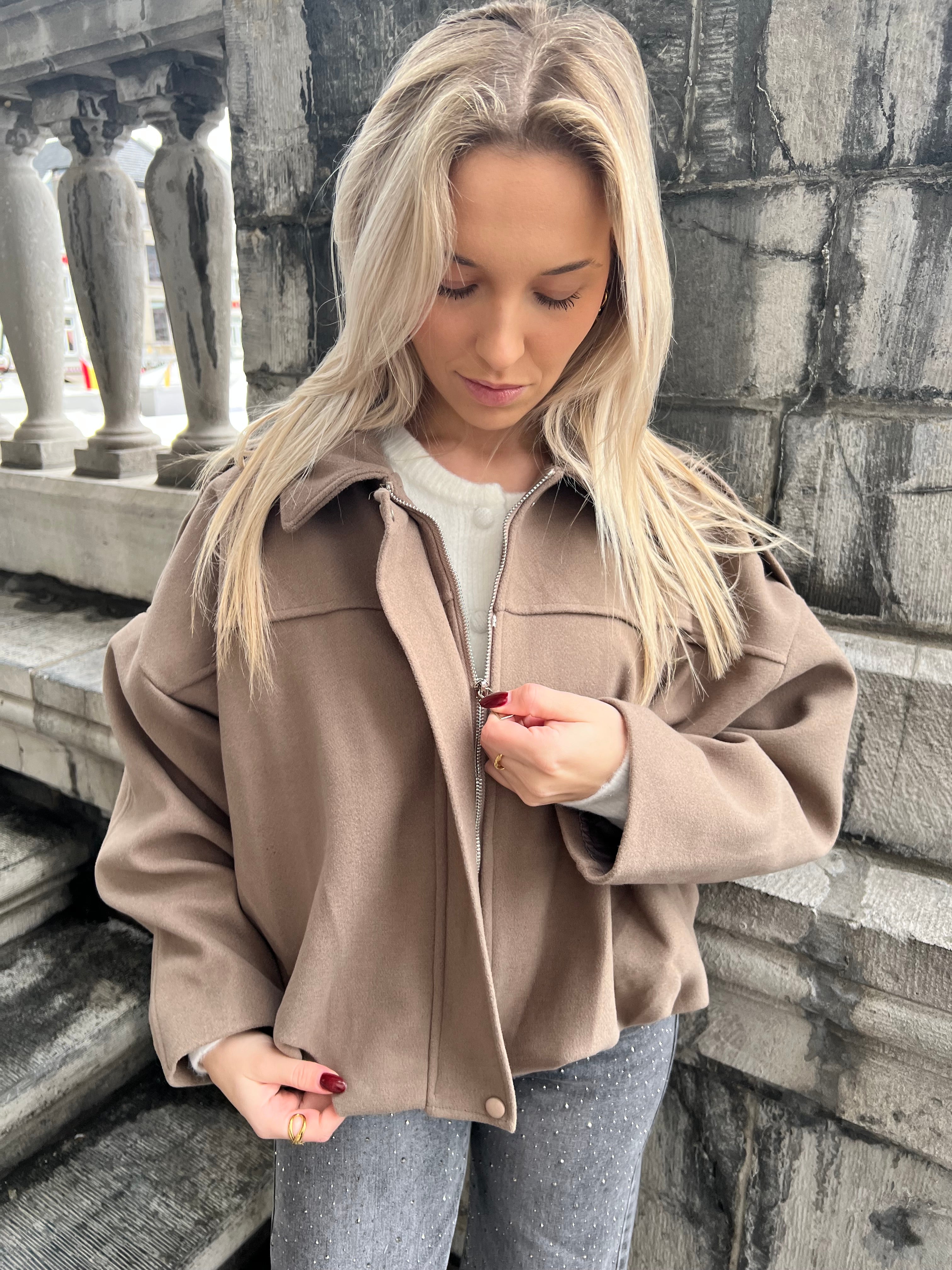 Geweldig jasje voor de iets minder koude dagen. Ook leuk om binnen te dragen. Jasje valt in de taille. Het jasje sluit met een blinde rits en drukknoop aan boven en onderzijde. Het jasje is gevoerd en op de schouders zit een epaulet. Ook verkrijgbaar in zwart.