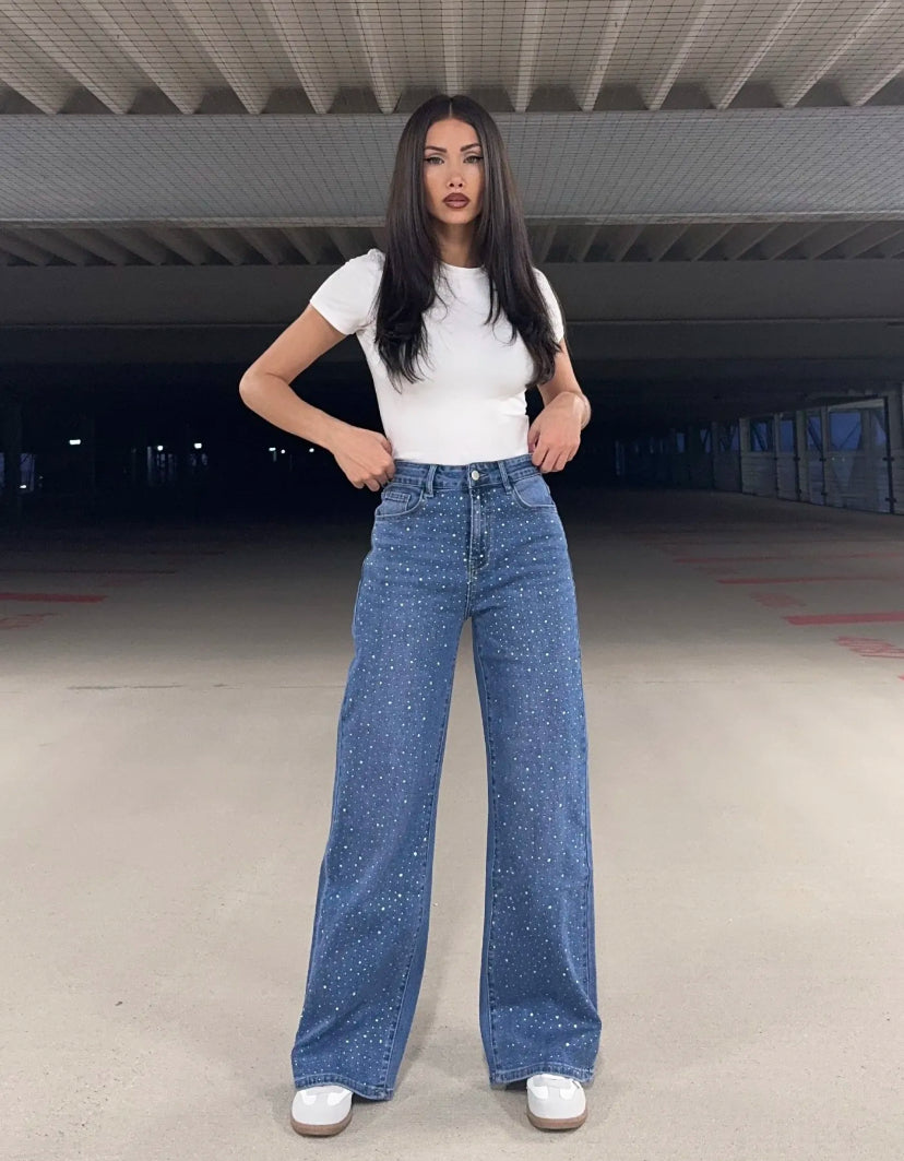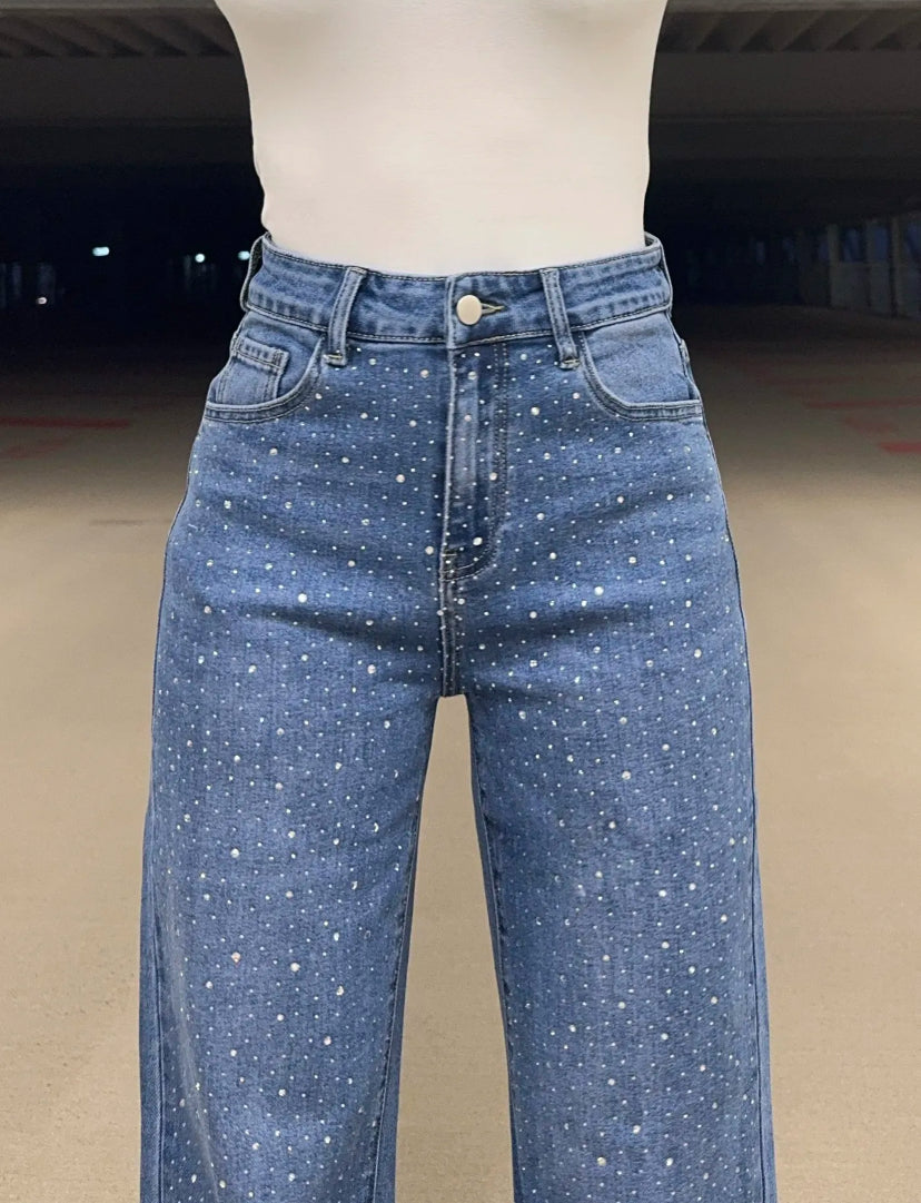 Deze straight leg jeans is high waist en heeft strass steentjes op de voorpanden. De strass steentjes zijn verschillend in grootte. In de jeans zit stretch zodat deze heerlijk comfy zit.