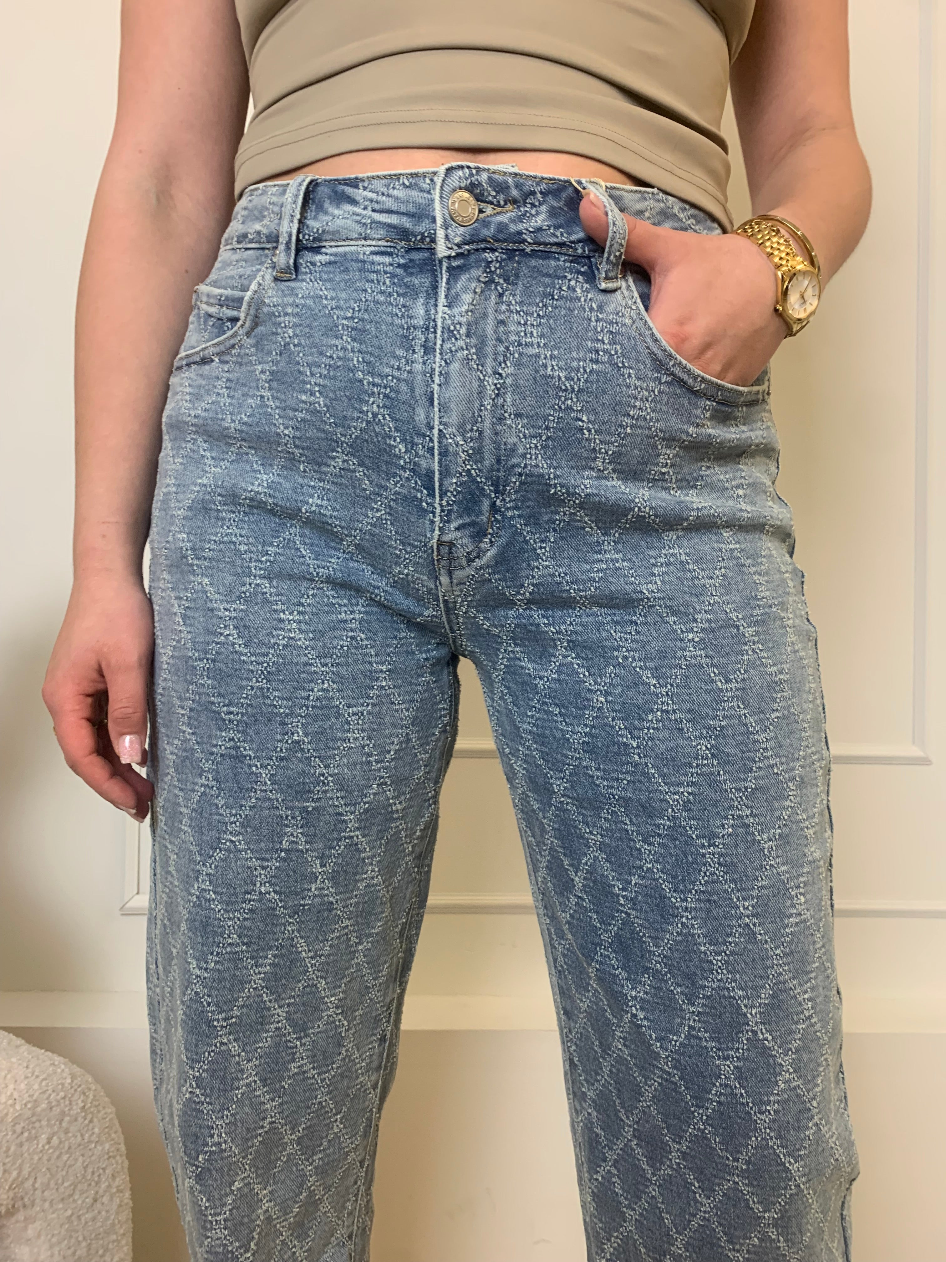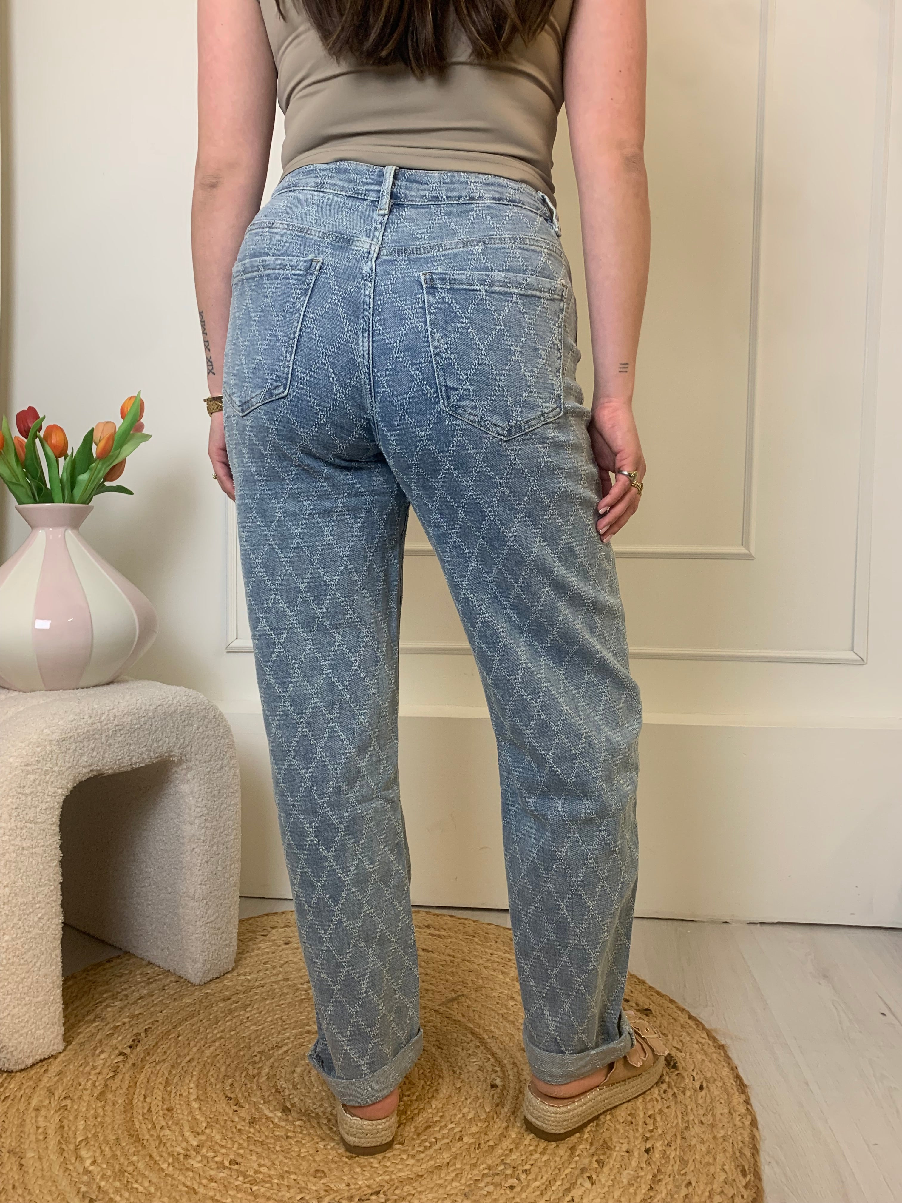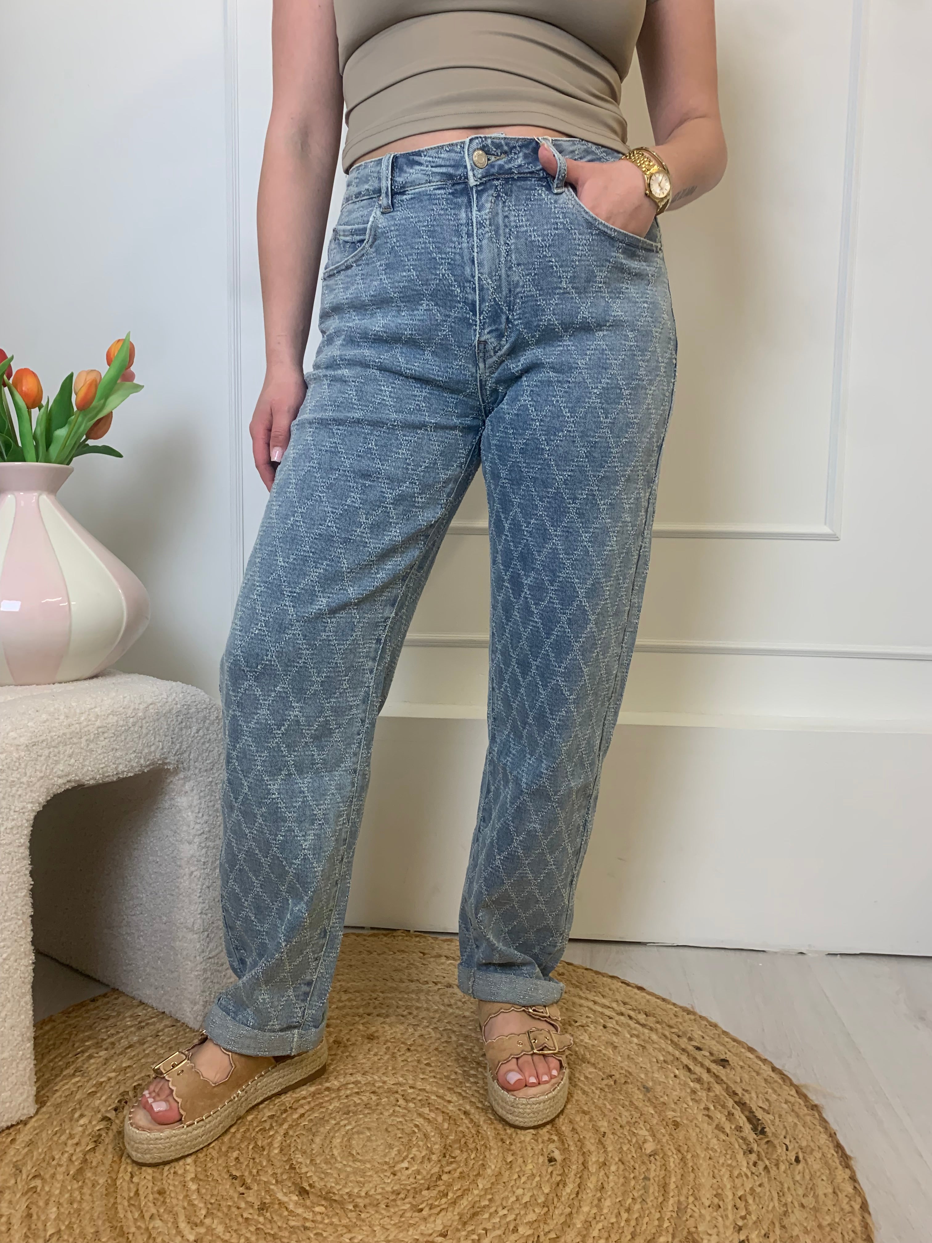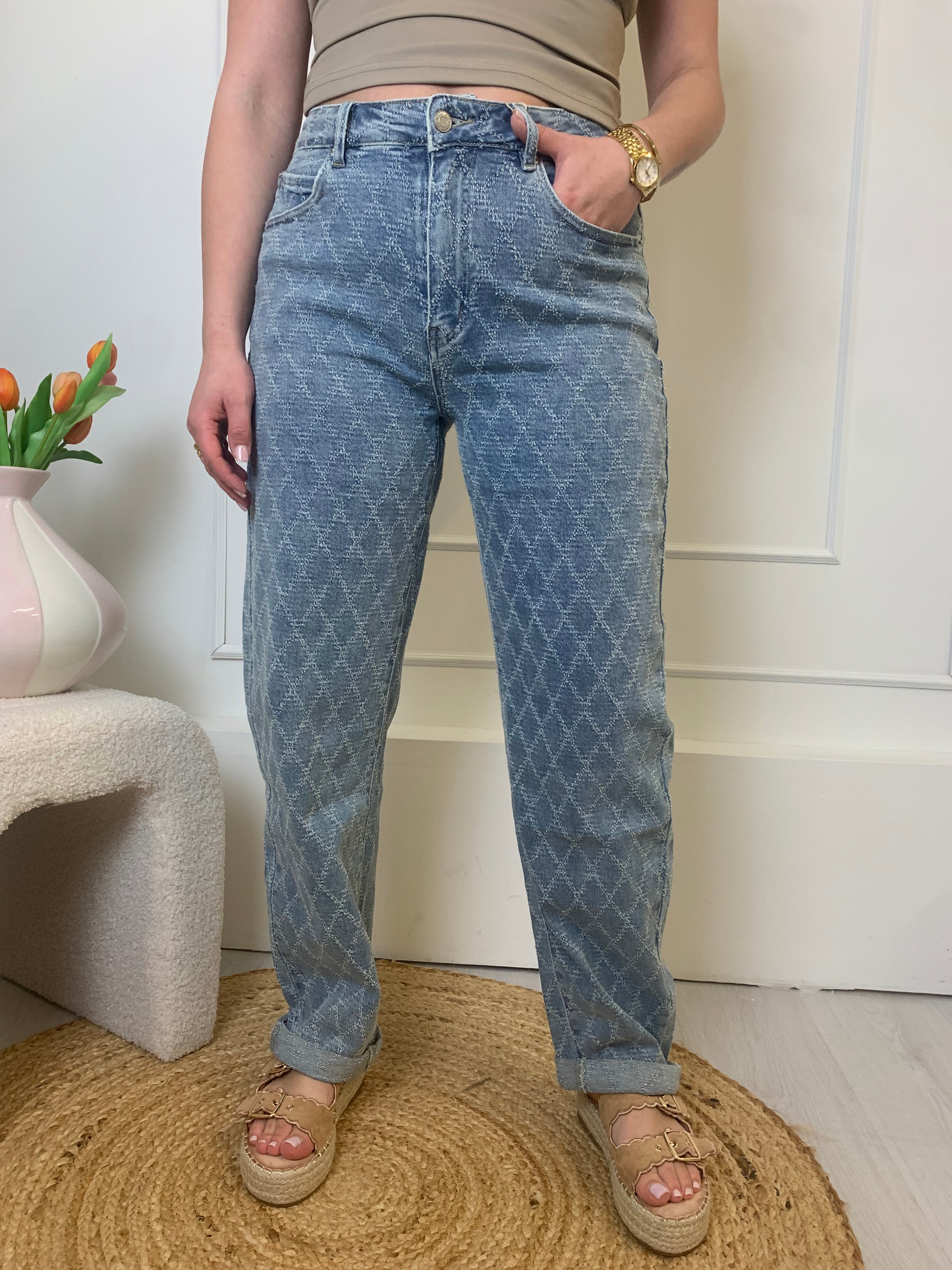 Deze mooie jeans heeft een ruitjes patroon op de voor en achterpanden. In de jeans zit stretch zodat deze heerlijk comfy zit.